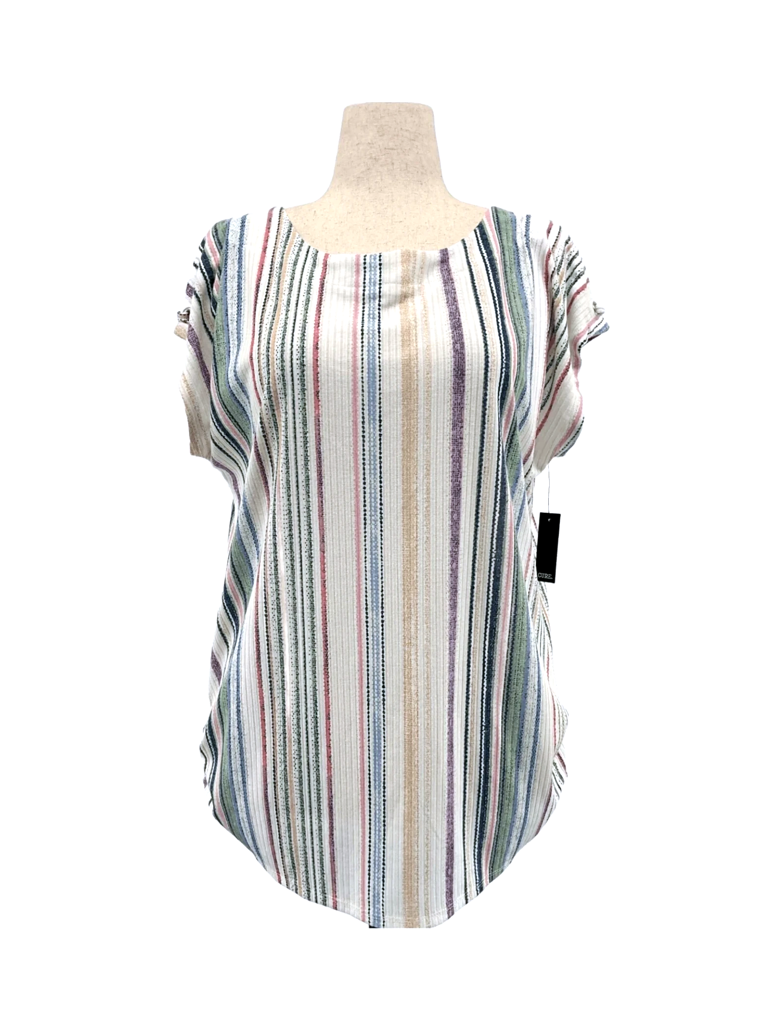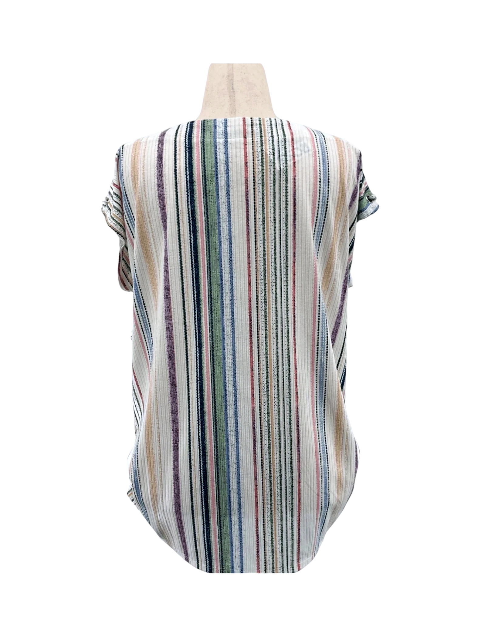 This stylish CURE. striped top is perfect for adding a pop of color to your wardrobe. The multicolored stripes are eye-catching, and the short sleeves make it ideal for warm weather. Crafted from a comfortable blend of polyester, rayon and spandex, it offers a relaxed fit, making it perfect for casual outings or a day at the office. This pre-owned top is in excellent condition and ready to elevate your style.