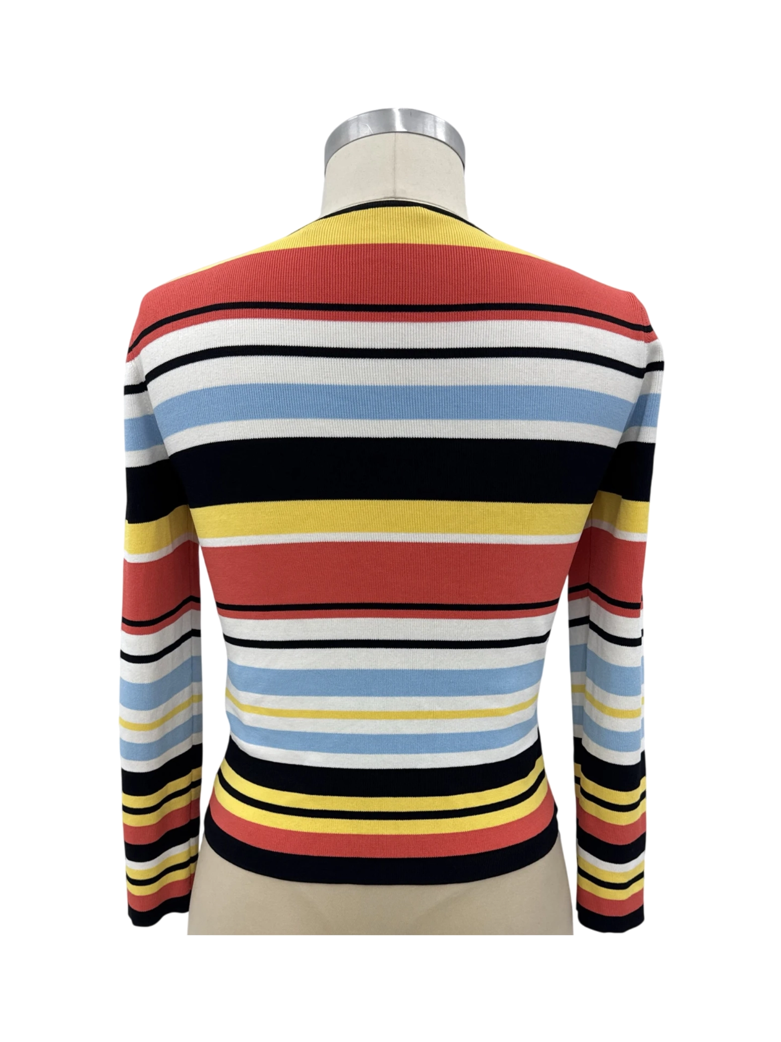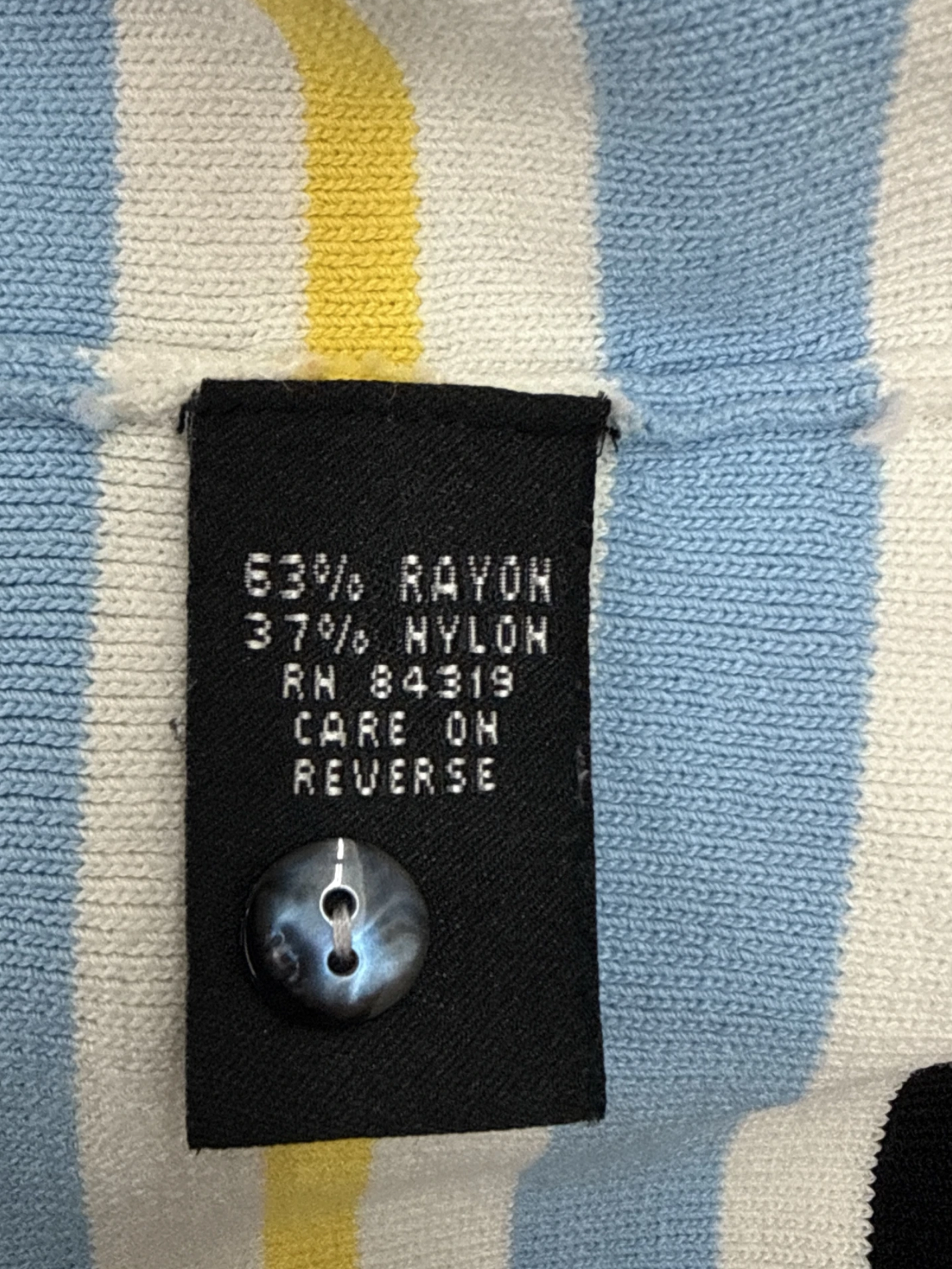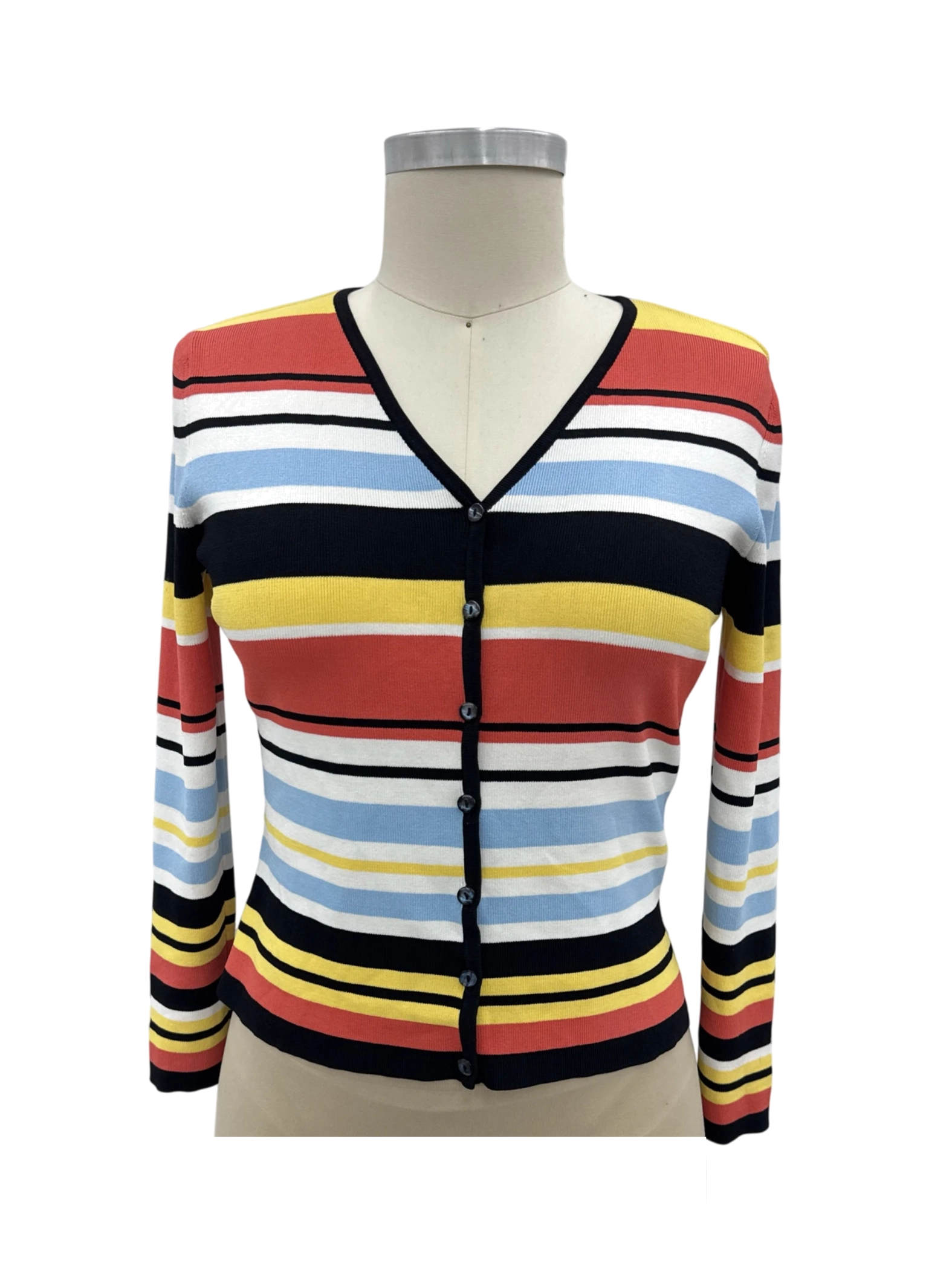 This used CYRUS cardigan features a vibrant multicolor striped pattern. This lightweight sweater is perfect for layering during spring and fall. The V-neckline and button-up closure add a touch of classic style. The blend of rayon and nylon provides a comfortable fit. This pre-owned sweater is a great addition to any wardrobe.