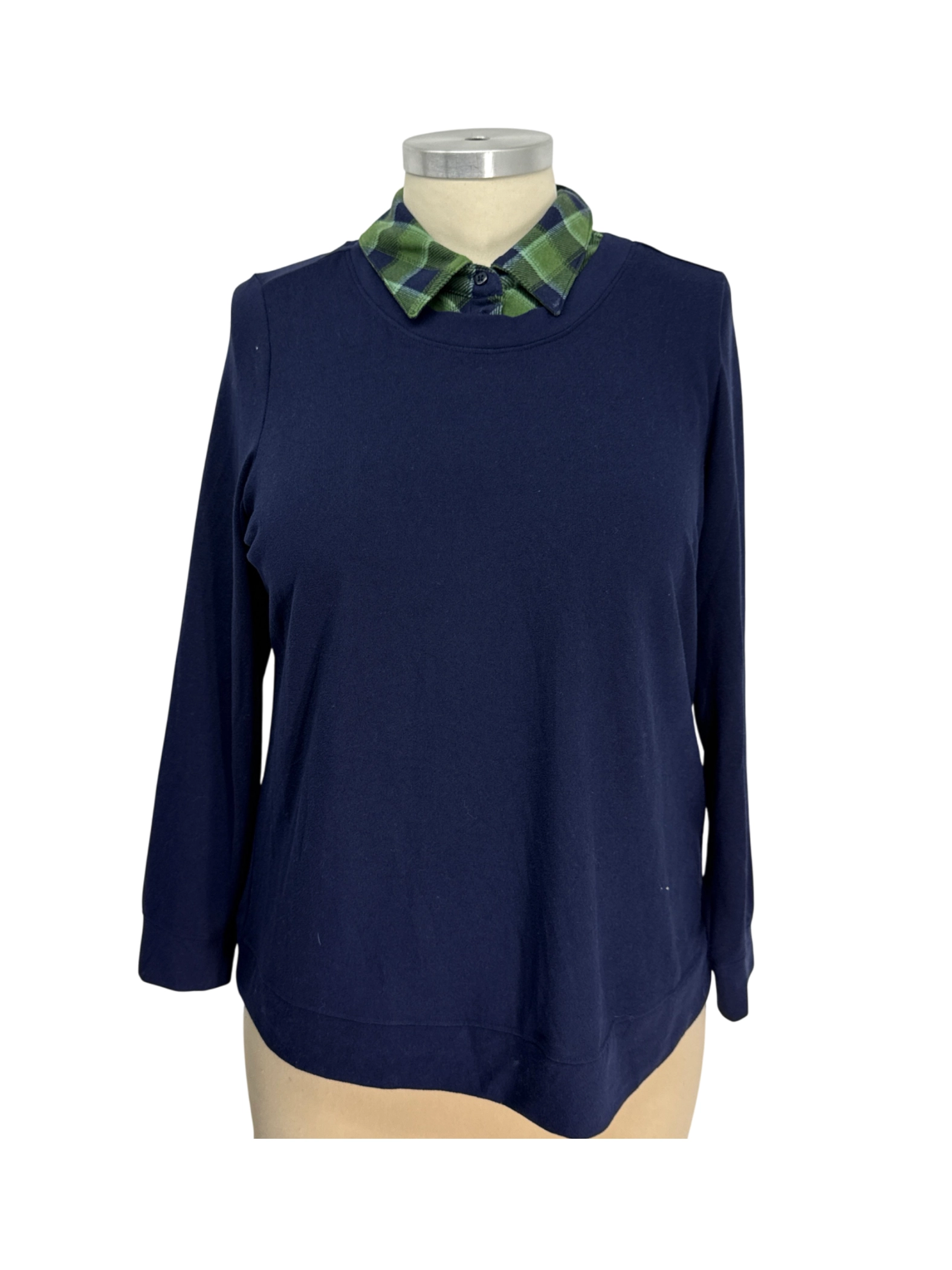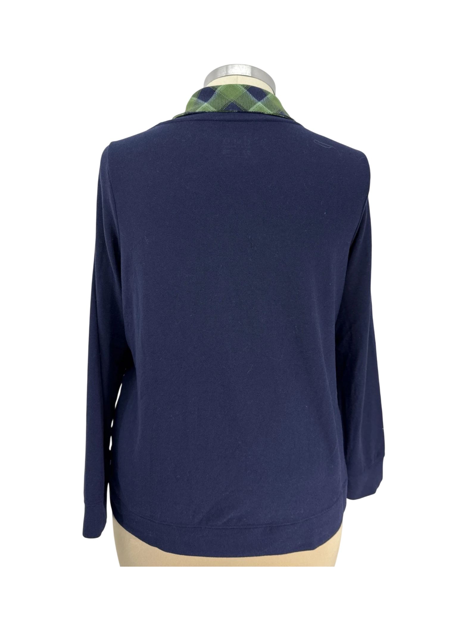 This pre-owned d. & co. denim + company sweater is a stylish addition to any wardrobe. It features a classic crew neck and long sleeves, with a touch of patterned plaid detail at the collar for added flair. Crafted from a comfortable cotton blend, this sweater is perfect for layering during the fall and winter seasons. The navy blue hue makes it versatile enough to pair with any outfit, making it a must-have for your casual wear collection.