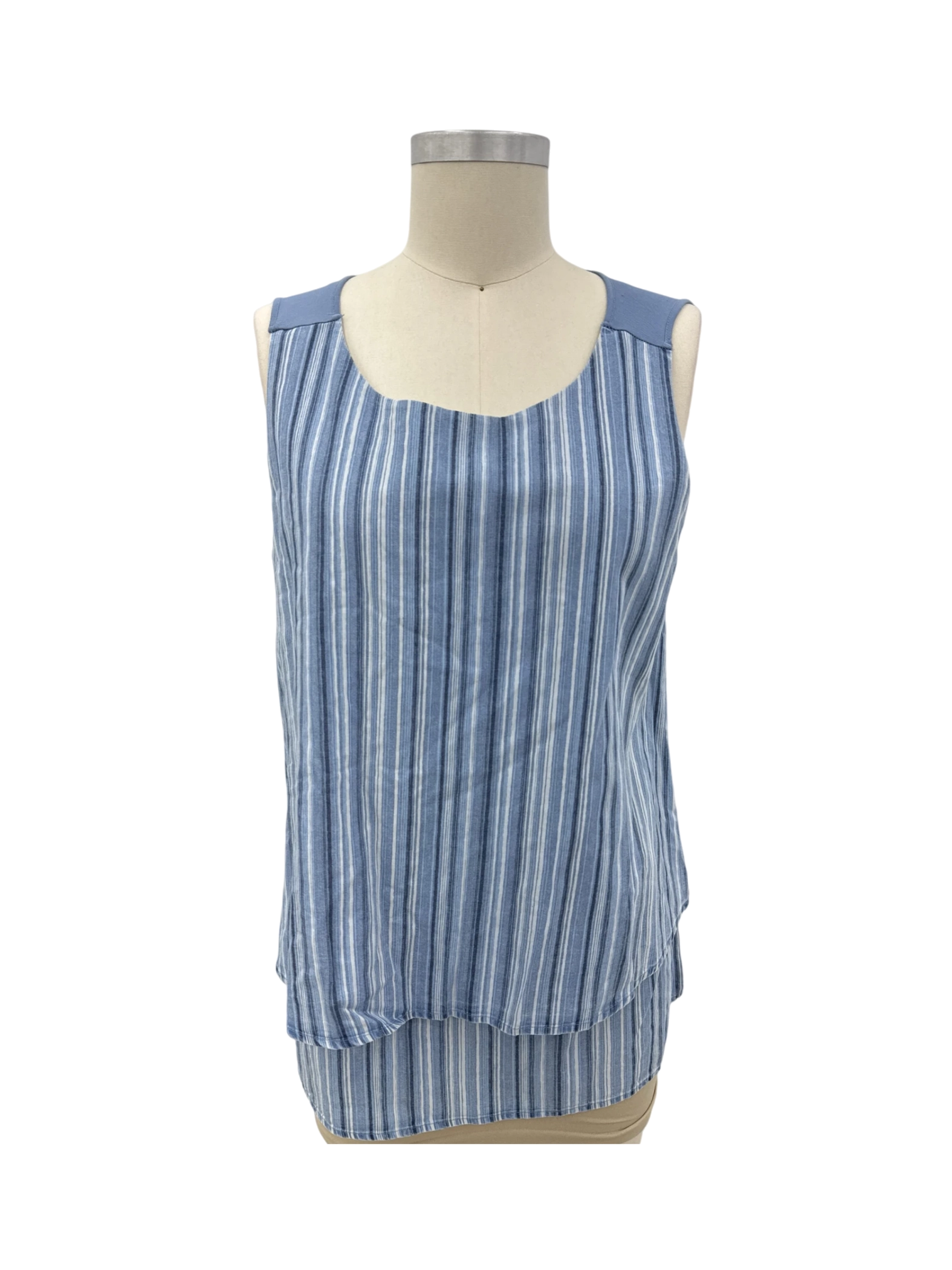 This stylish women's tank top from D2 Davidson is perfect for warm weather. It features a trendy blue and white striped pattern, a flattering round neck, and a comfortable sleeveless design. Made from a blend of cotton, lyocell, rayon and spandex, it offers a soft and breathable feel. Ideal for casual outings or layering, this tank top is a versatile addition to any wardrobe. It's a pre-owned item in excellent condition, offering a chic look at a great value.