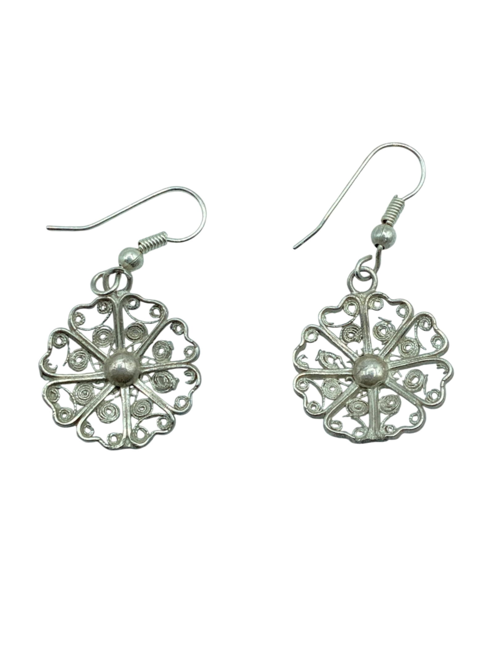 These beautiful sterling silver earrings have a delicate filigree flower design, crafted by hand with intricate detail. They are lightweight and elegant, adding a floral charm to any outfit.