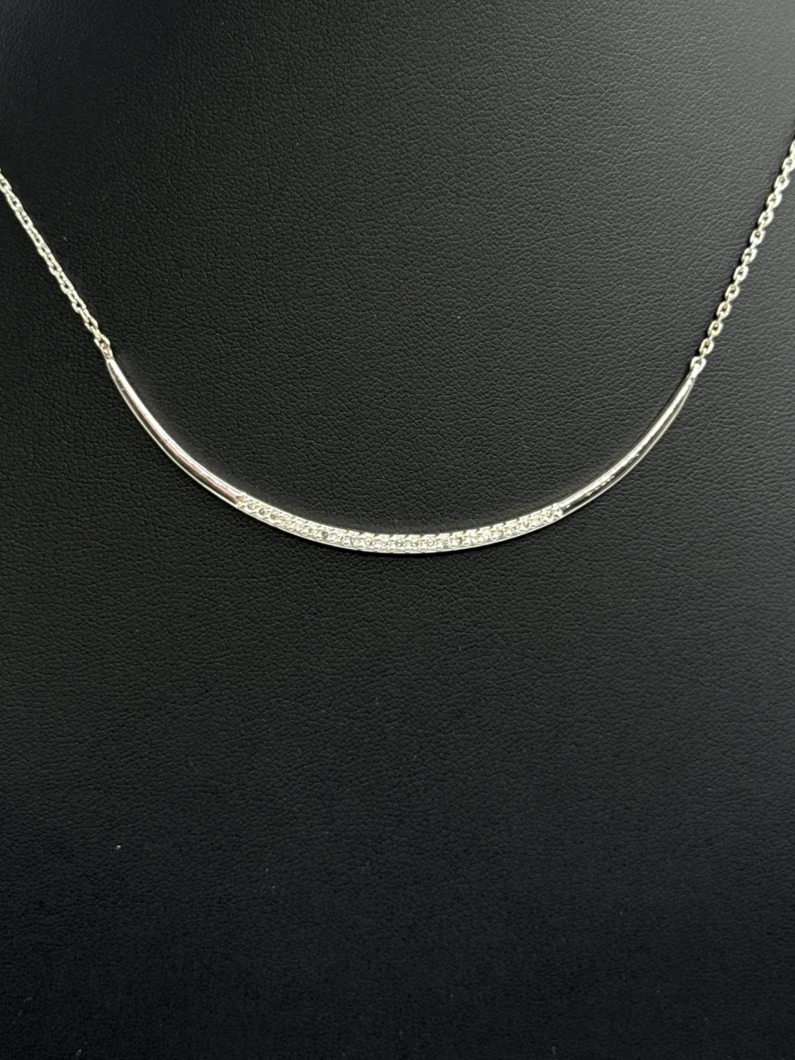 Delicate pendant necklace with bar chain and embedded stones in silver tone. Minimalist pendant measuring 18 1/2 inches.