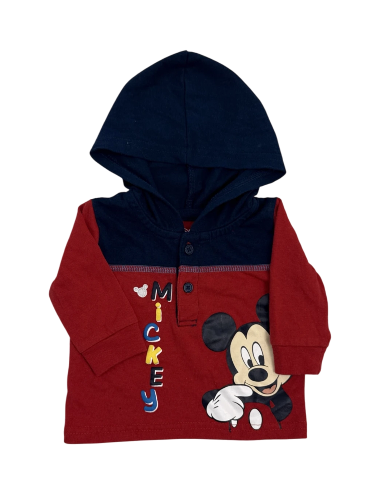 This adorable Disney Baby hooded jacket is perfect for your little one! Featuring a fun Mickey Mouse design on a red and blue color block, it's sure to be a hit. Made from soft polyester, this pre-owned jacket offers both comfort and style for the cooler seasons. Perfect for layering, this jacket will keep your baby warm and looking cute.