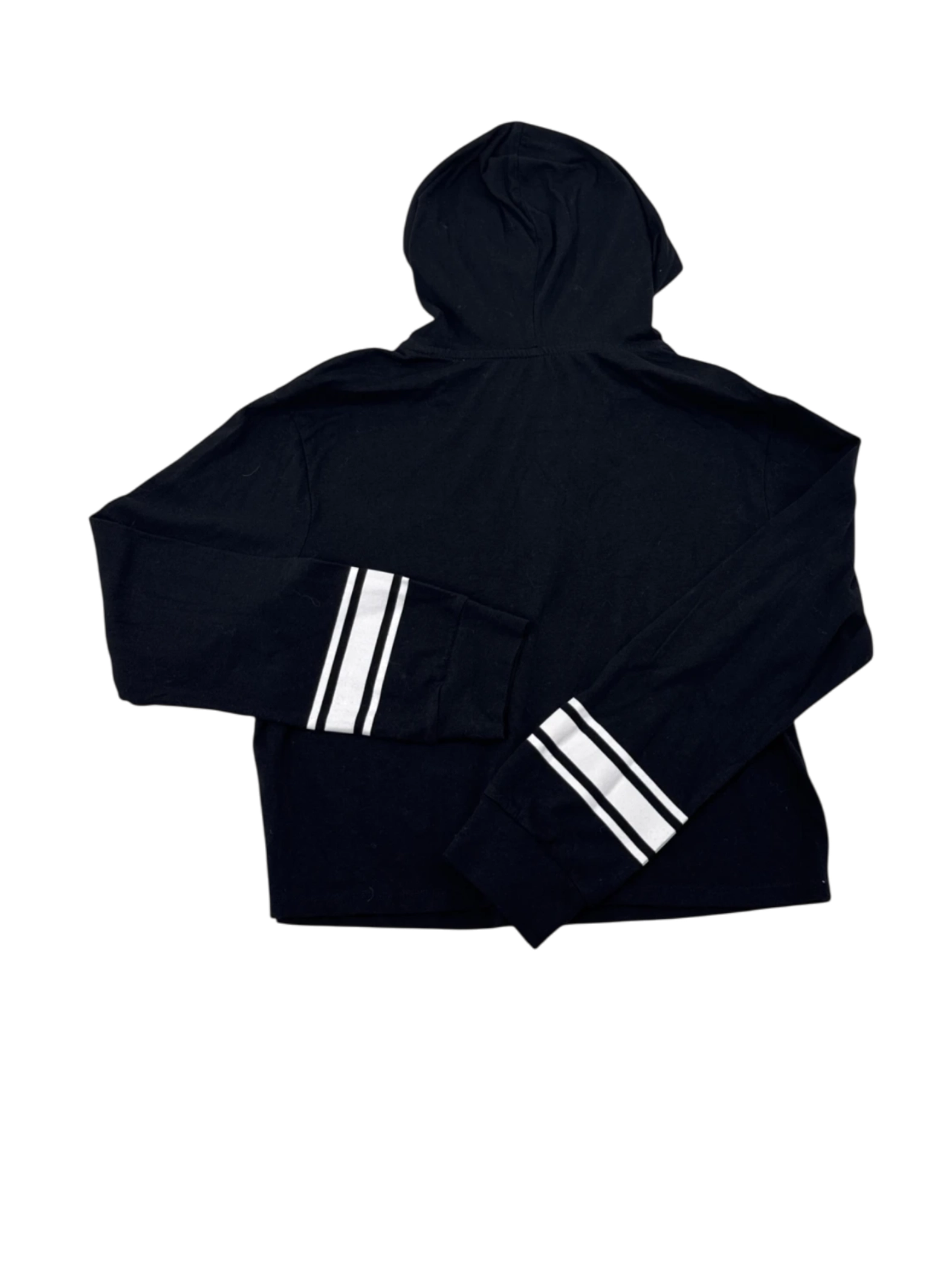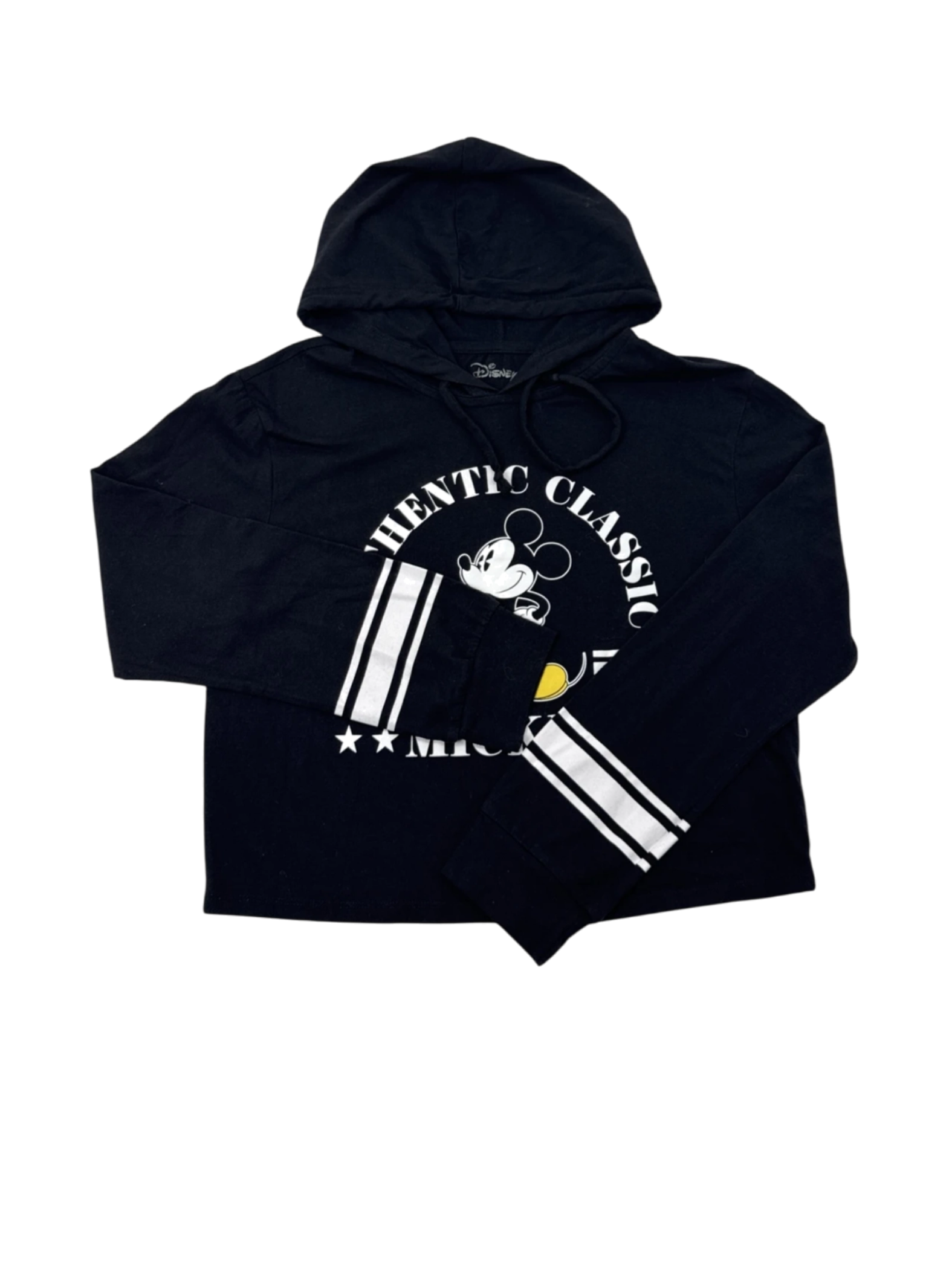 Embrace classic Disney style with this pre-owned boys' hooded sweatshirt. Featuring a bold black color with crisp white stripes and iconic Mickey Mouse graphics, this top is perfect for any Disney fan. The comfortable cotton blend ensures all-day wear, while the hood adds extra warmth and style. A versatile addition to any young boy's wardrobe, ideal for layering during cooler months.