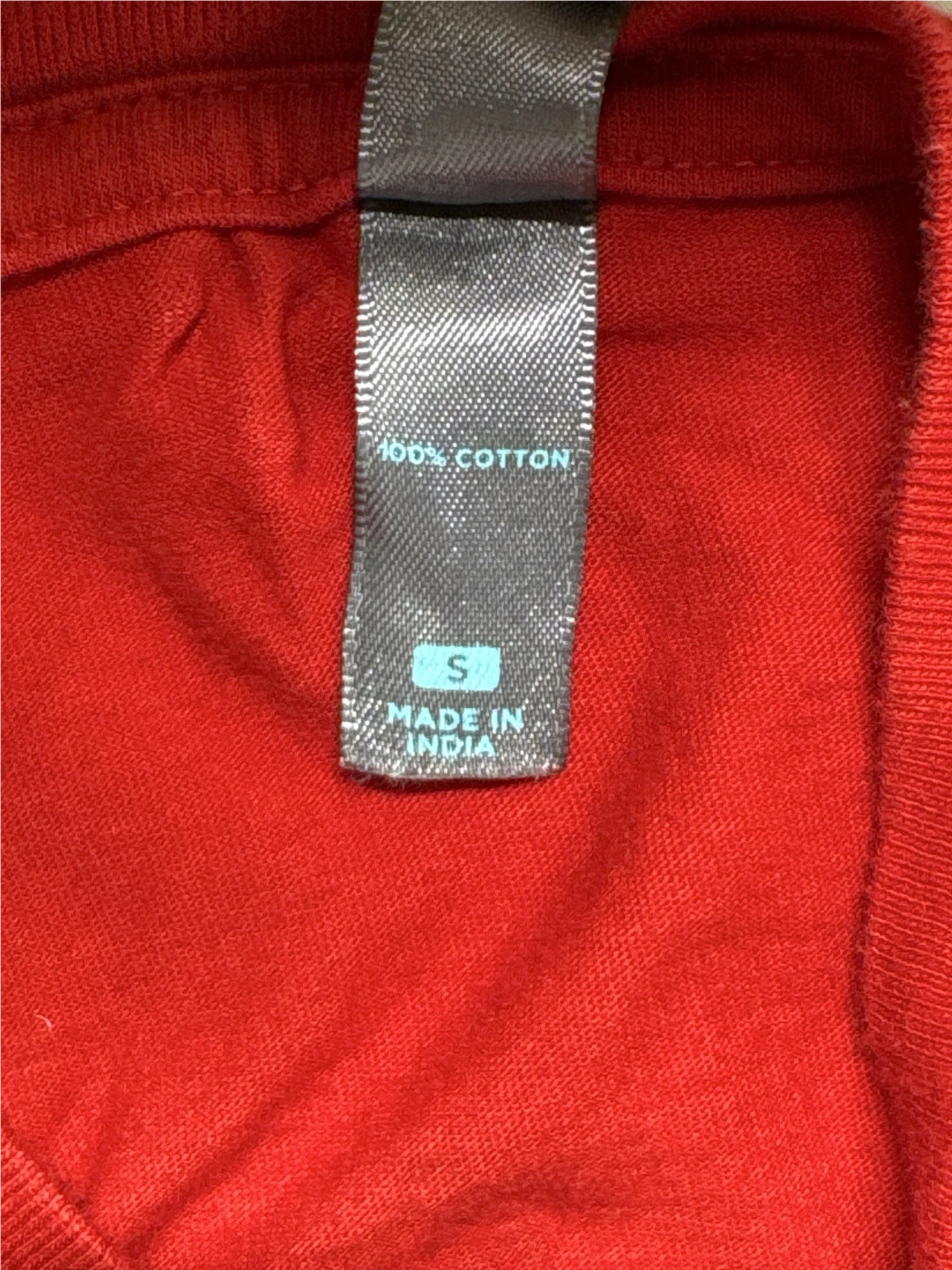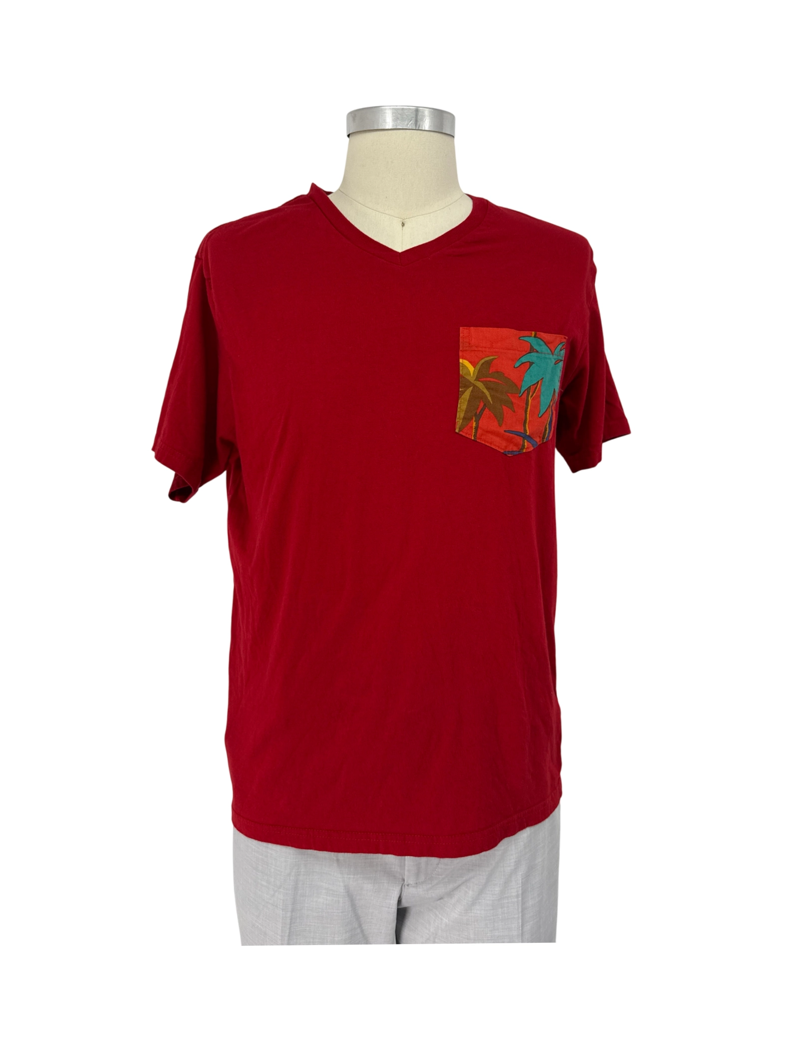 This District Made t-shirt is a stylish and comfortable choice for any casual occasion. Made from 100% cotton, it features a classic V-neck design and short sleeves, perfect for warmer weather. The shirt's vibrant red color is complemented by a unique palm tree pocket design, adding a touch of personality. The shirt is a size small, making it a great fit for anyone looking for a comfortable, fashionable addition to their wardrobe. Ideal for summer, this pre-owned tee offers both quality and style.