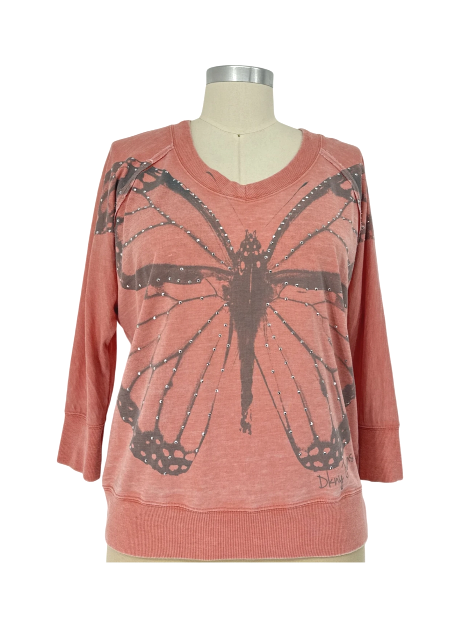 Elevate your casual wardrobe with this stylish DKNY Jeans top, a pre-loved gem perfect for adding a touch of flair to any outfit. This top features a unique butterfly design, flattering 3/4 sleeves, and a comfortable cotton-polyester blend. Ideal for spring or fall, it offers a versatile style that can be dressed up or down.