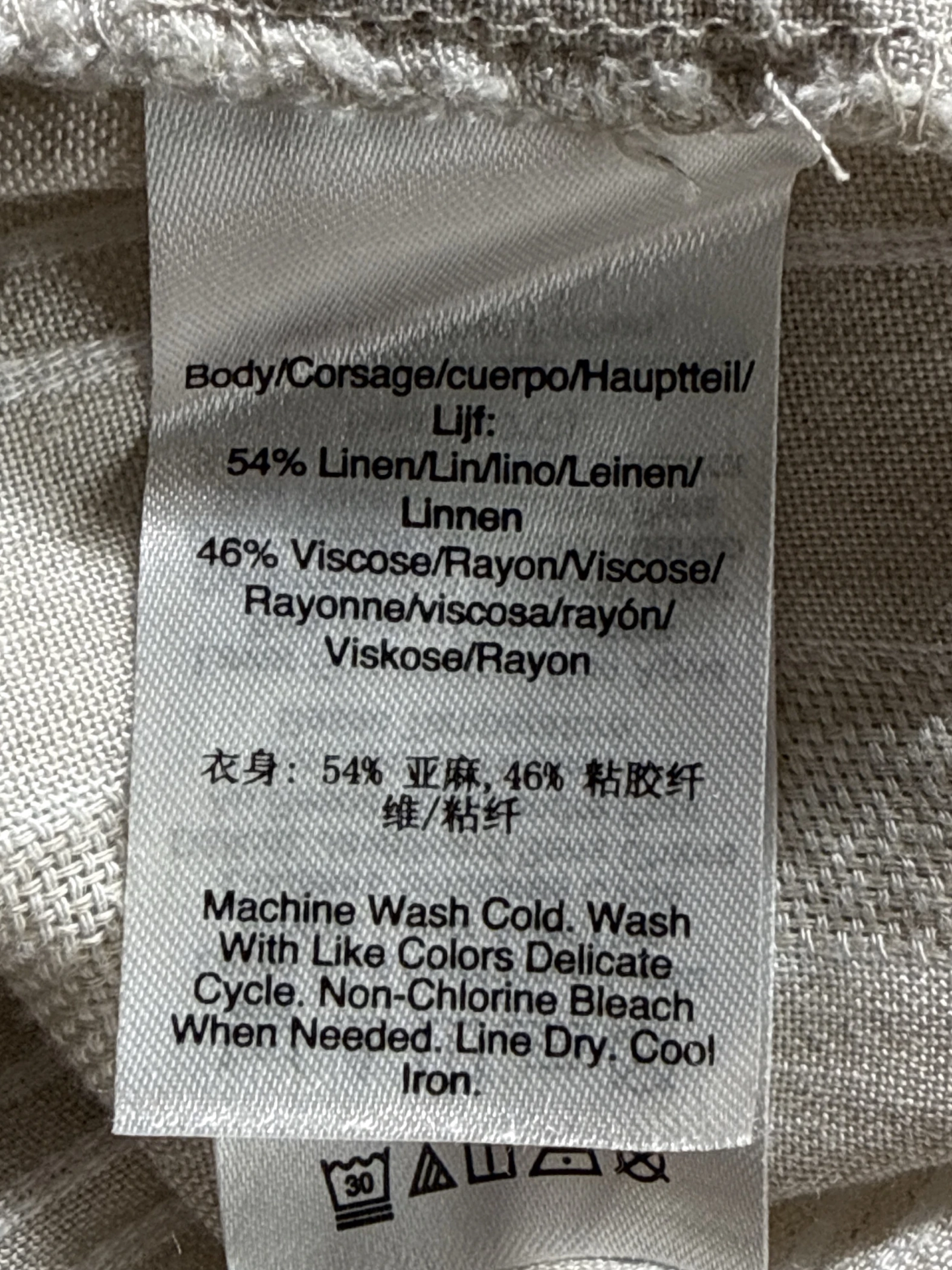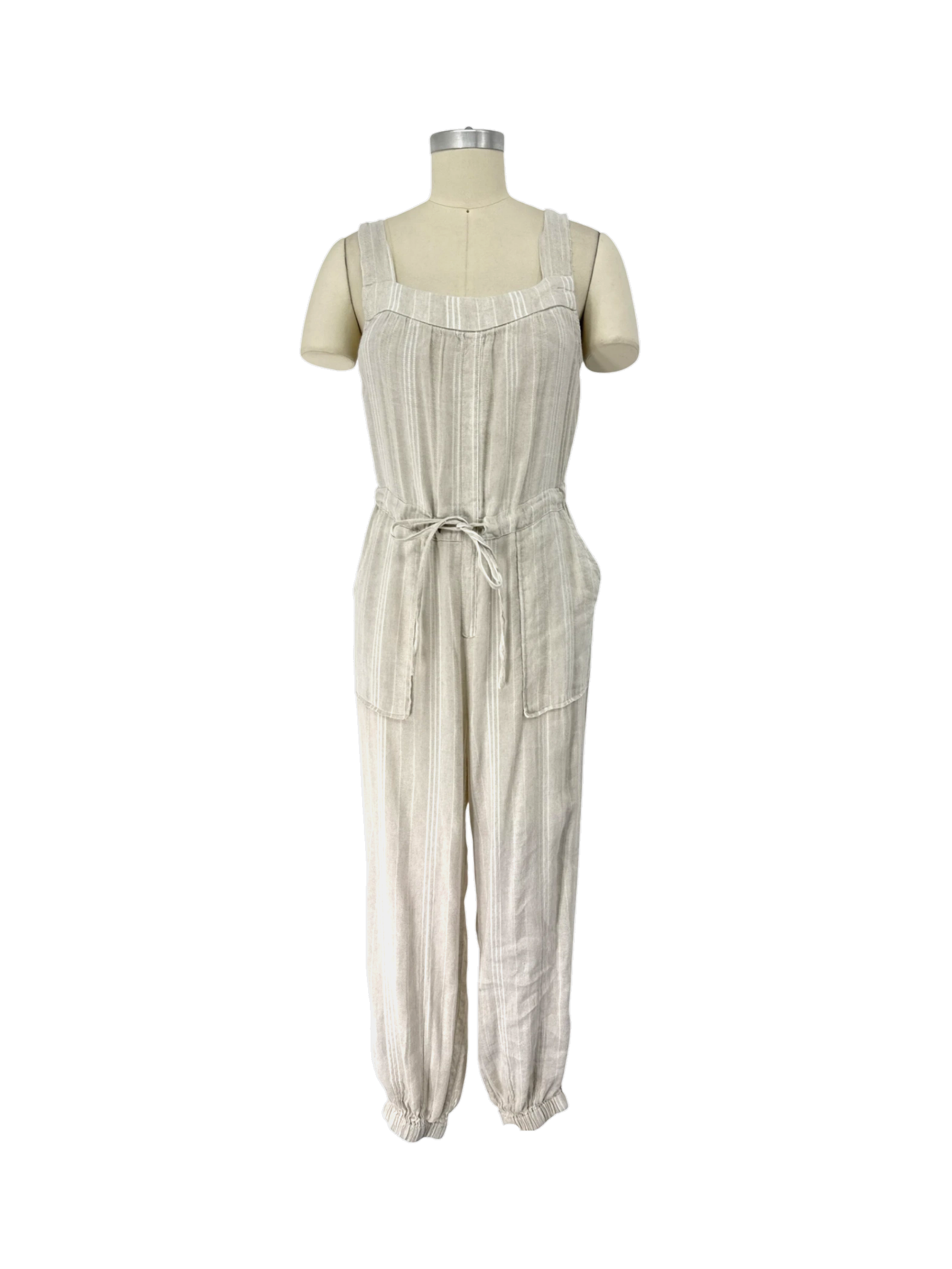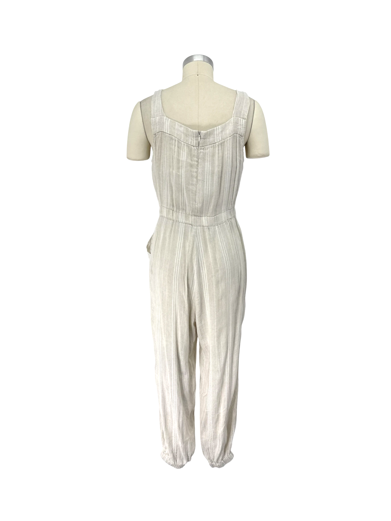 Embrace effortless style with this pre-owned DKNY jumpsuit. Crafted from a blend of linen and viscose, this jumpsuit offers both comfort and a touch of sophistication. The neutral beige color and subtle stripes make it a versatile piece, perfect for warm weather. Featuring a flattering silhouette, this jumpsuit is ideal for casual outings or dressed-up events. This DKNY jumpsuit is a stylish and sustainable addition to your wardrobe.