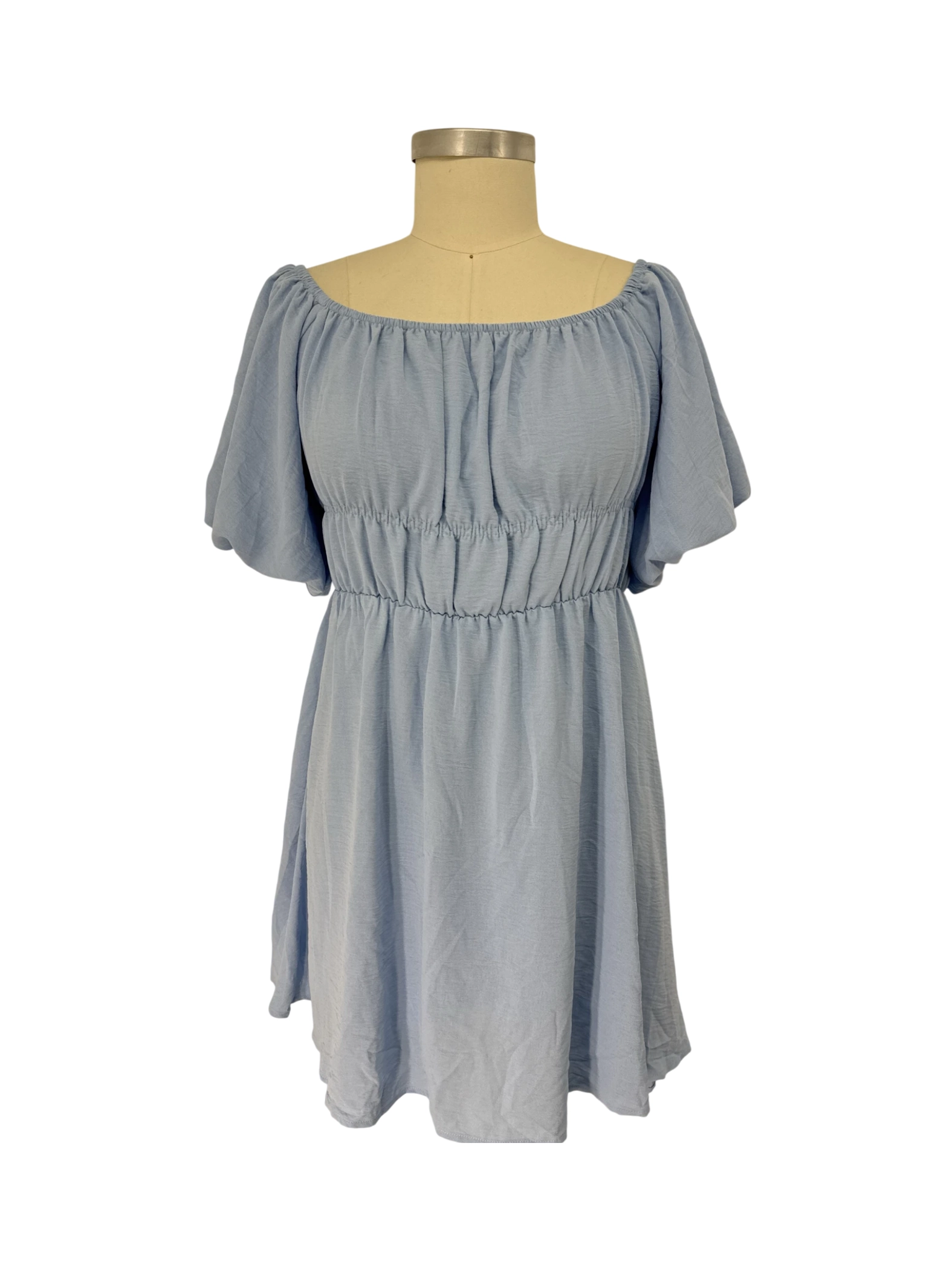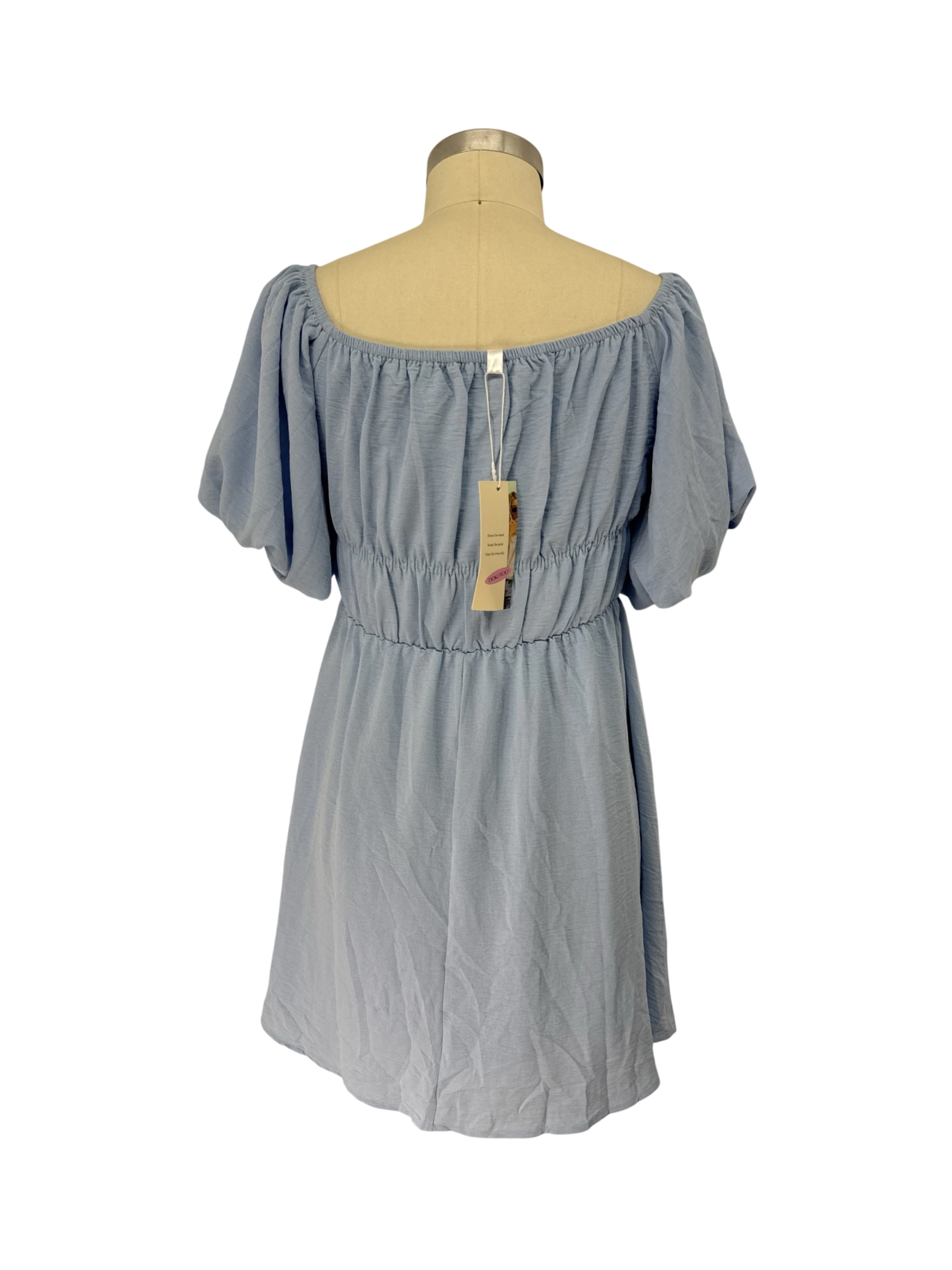 This pre-owned DOKOTOO A-line dress is perfect for the summer and spring seasons. The dress features an off-the-shoulder neckline and short sleeves. It's made of lightweight polyester fabric and comes in a beautiful light blue color. Ideal for casual outings, this dress offers both comfort and style. With its flattering silhouette and trendy design, it's a must-have addition to any wardrobe.