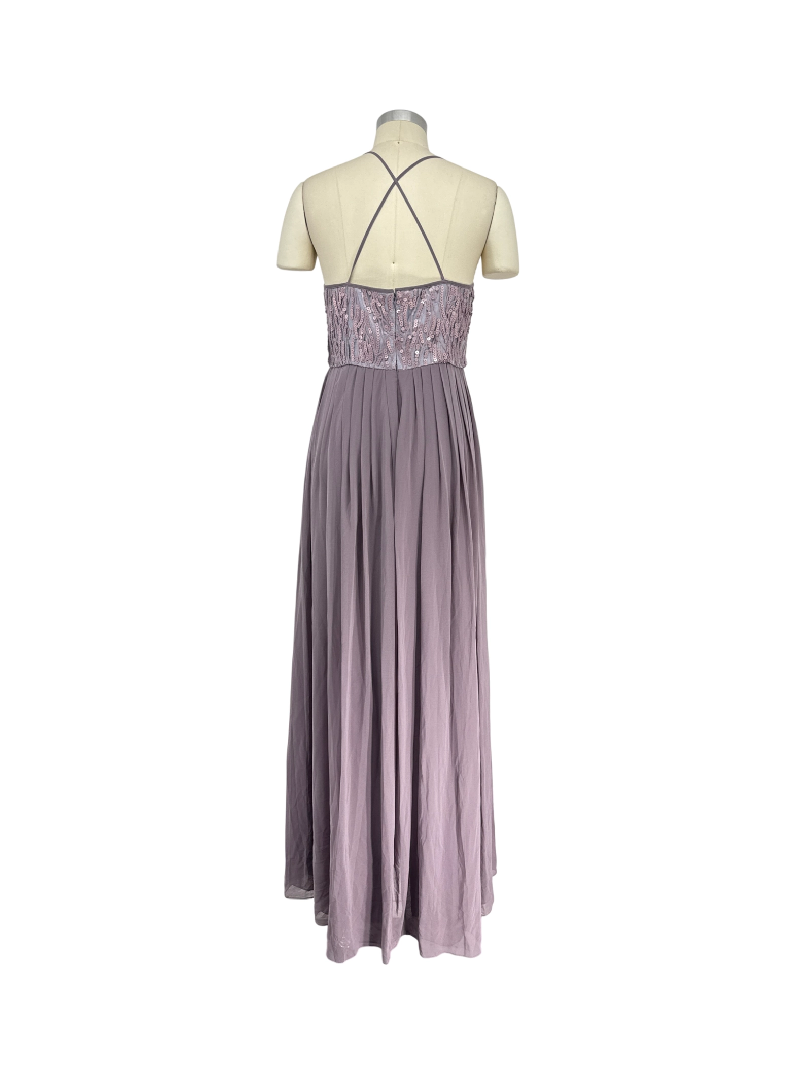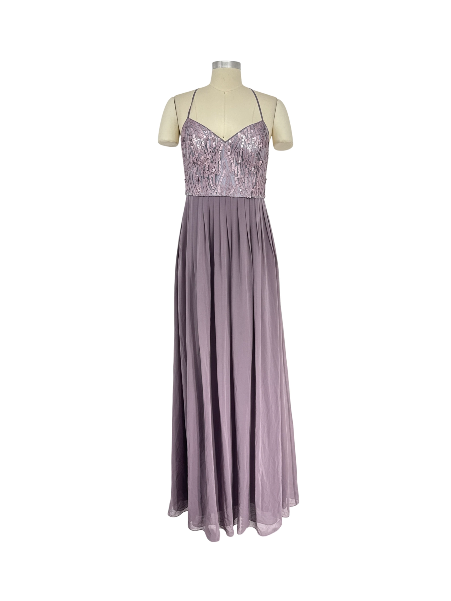 Elegant Donna Morgan purple maxi dress, perfect for a cocktail party or formal event. This stunning dress features a flattering A-line silhouette, a delicate V-neck, and a sleeveless design. The bodice is beautifully adorned with sequins, adding a touch of sparkle. Crafted from high-quality polyester, nylon, and acetate materials for a comfortable and luxurious feel. The dress is in excellent condition and ready to make a statement.