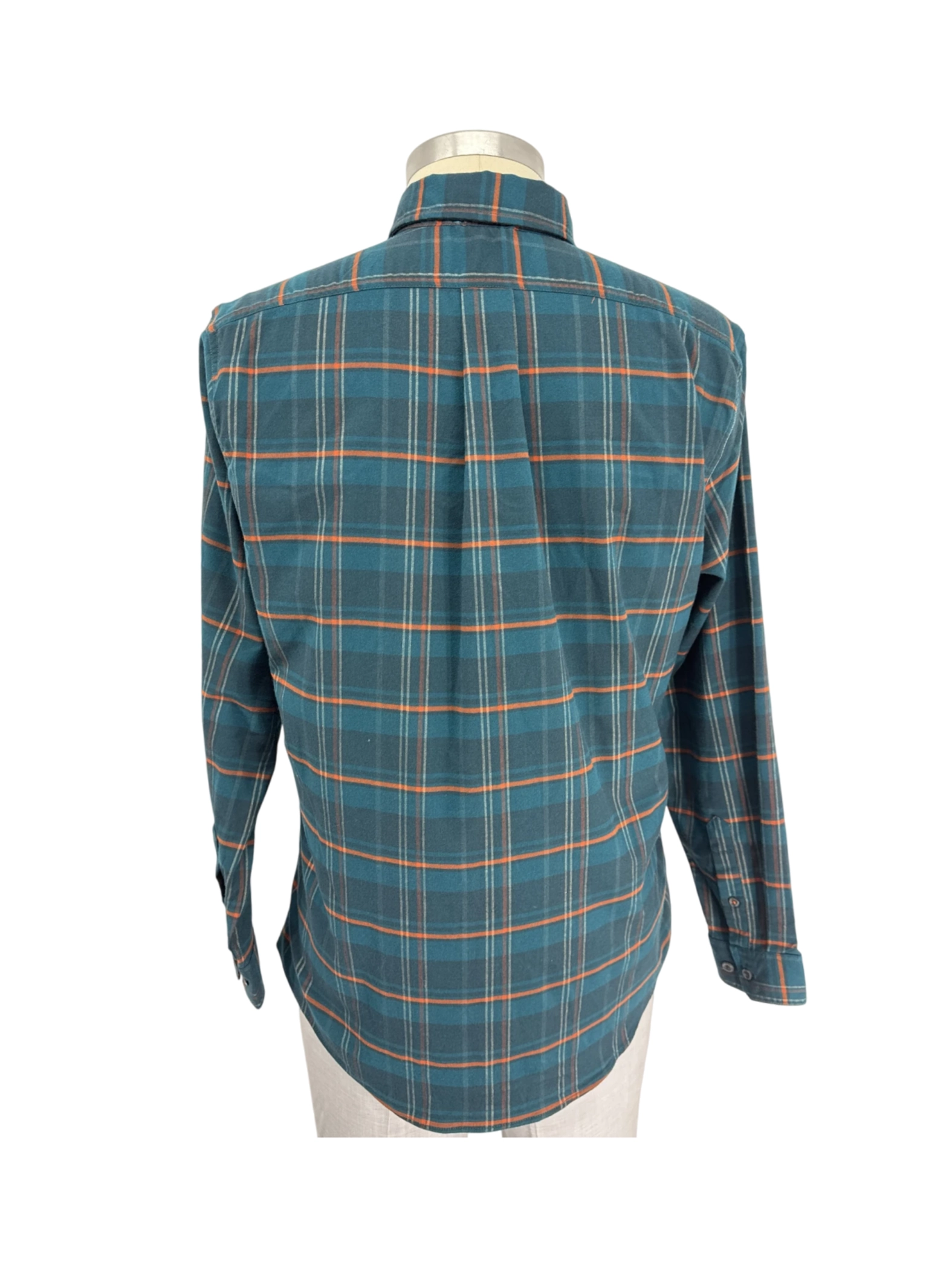 Pre-owned Eddie Bauer long sleeve button-up shirt for men, featuring a classic plaid pattern in teal and orange. This stylish shirt is a great addition to any wardrobe, perfect for casual wear or layering. Made from a comfortable polyester blend, it offers both style and ease of care. Ideal for fall and winter, this shirt combines durability with timeless design. Excellent for anyone seeking quality and value in their clothing.