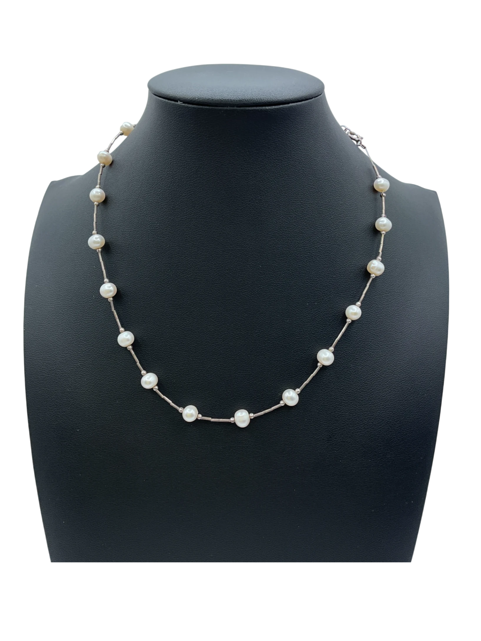 This beautiful necklace contains shiny freshwater pearls spaced evenly along a fragile chain.