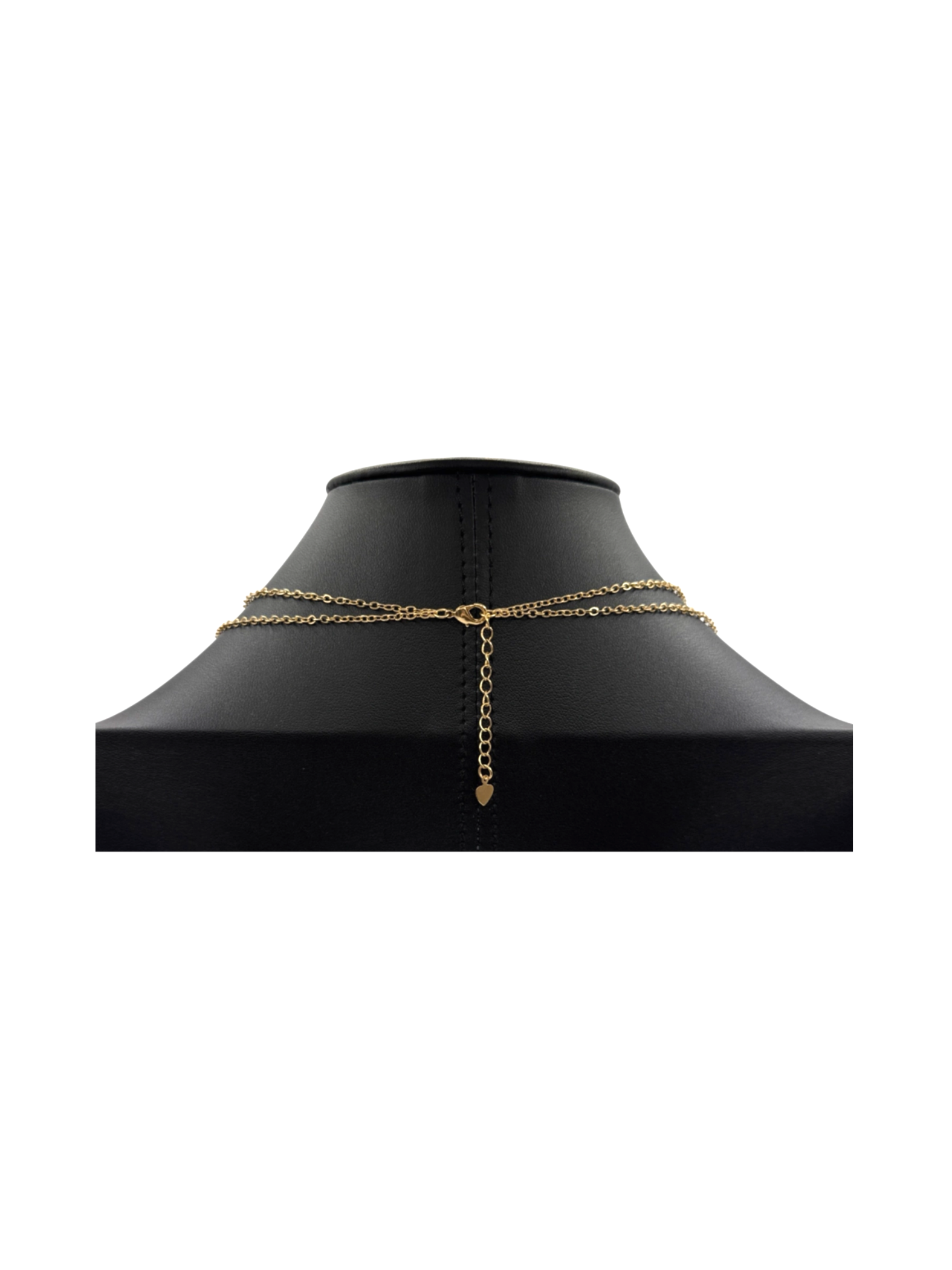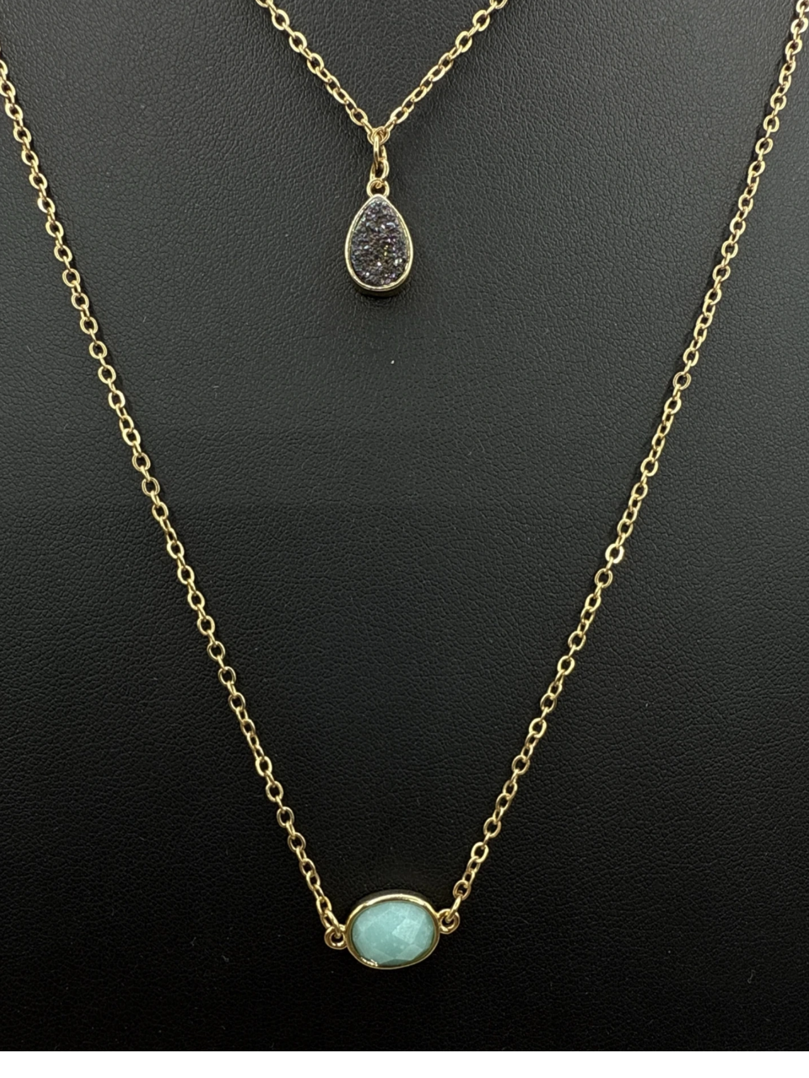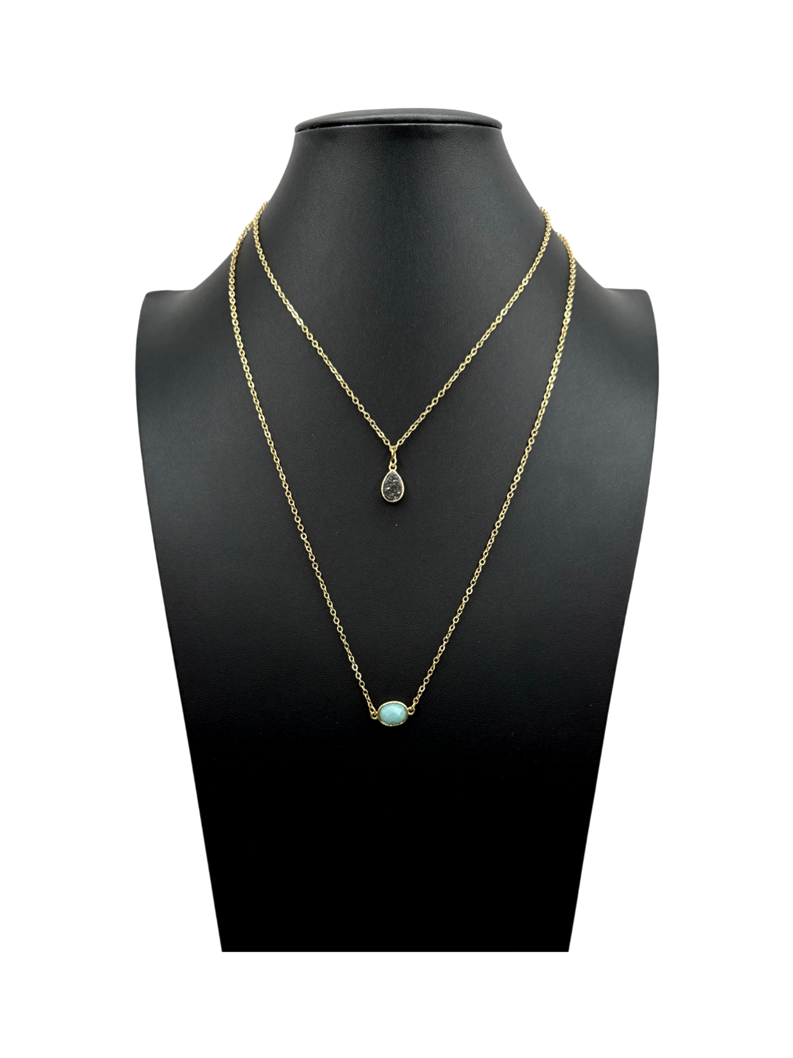 This elegant pre-owned necklace features a layered design with delicate gold-tone chains. The upper chain showcases a teardrop pendant, while the lower chain boasts a captivating oval stone. Perfect for adding a touch of sophistication to any outfit, this necklace is a versatile accessory. Find a unique, stylish addition to your collection.
