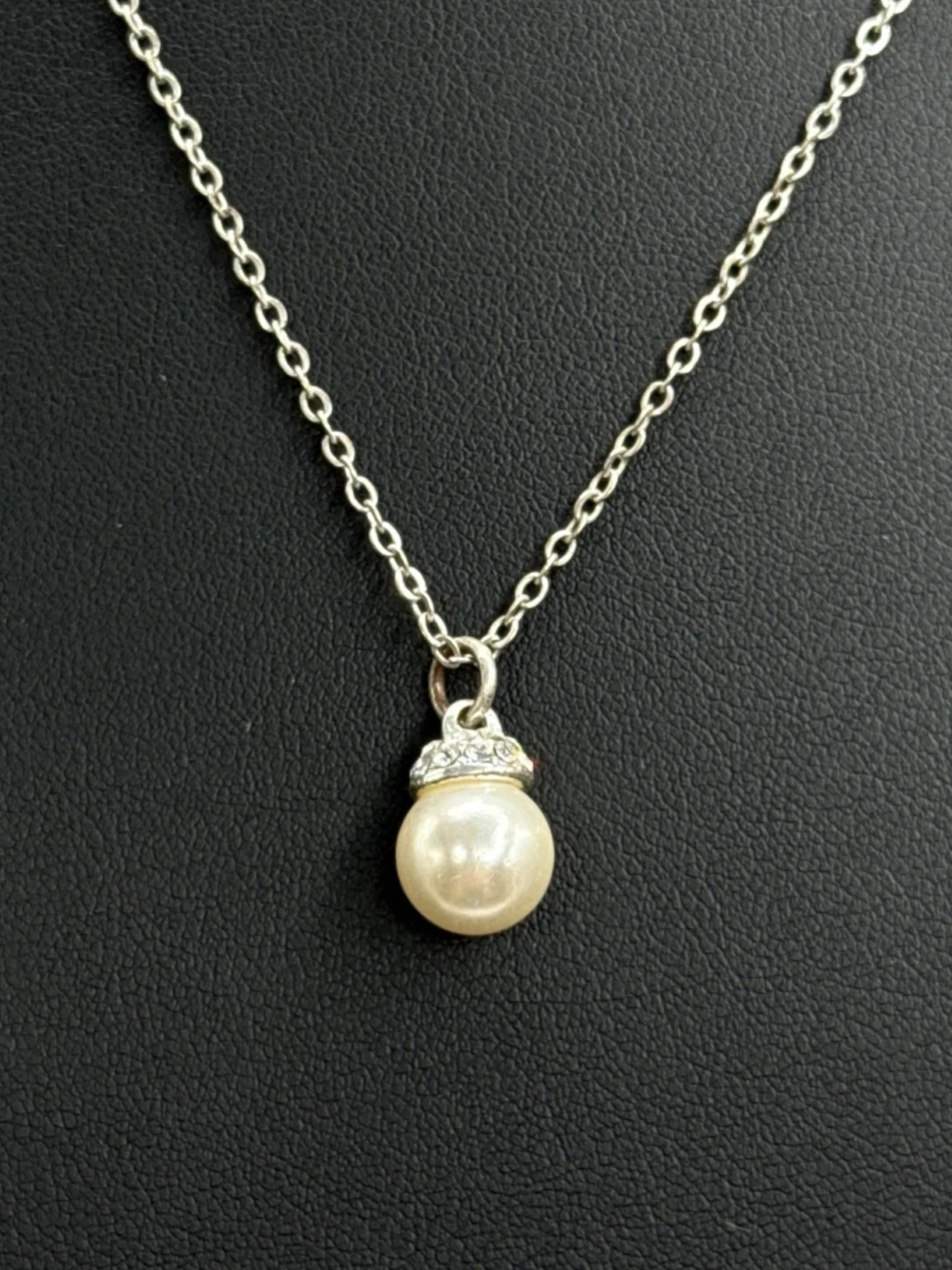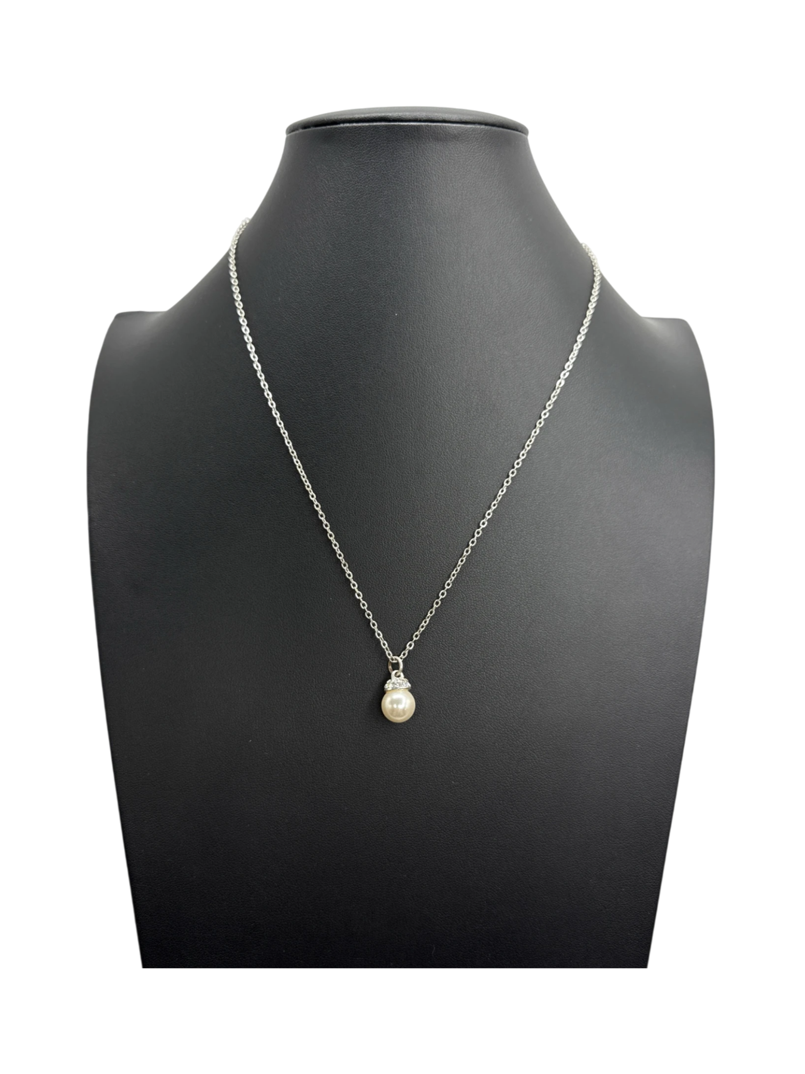 This elegant necklace includes a shiny pearl pendant adorned with glittering crystals, hanging from a delicate silver chain.
