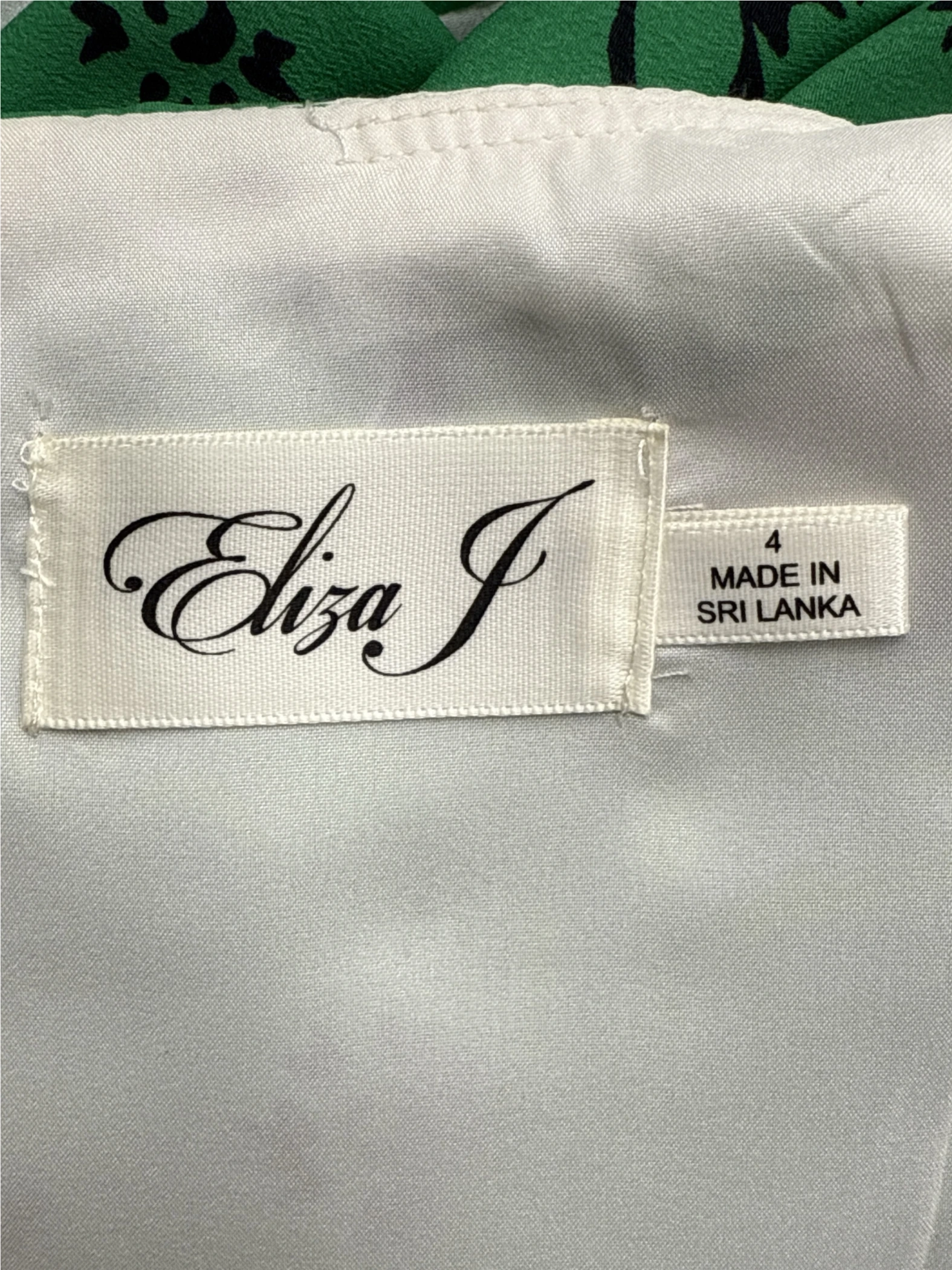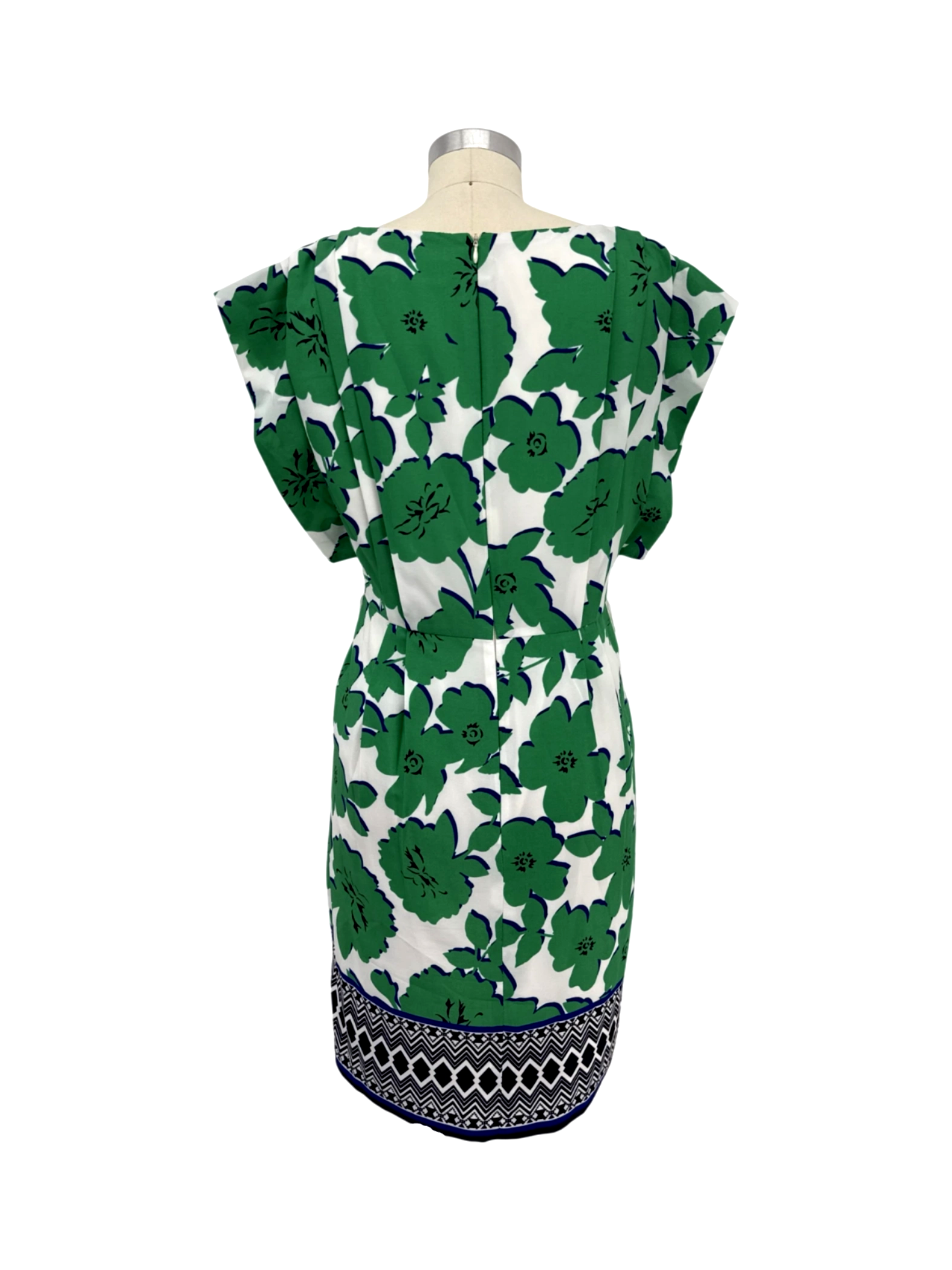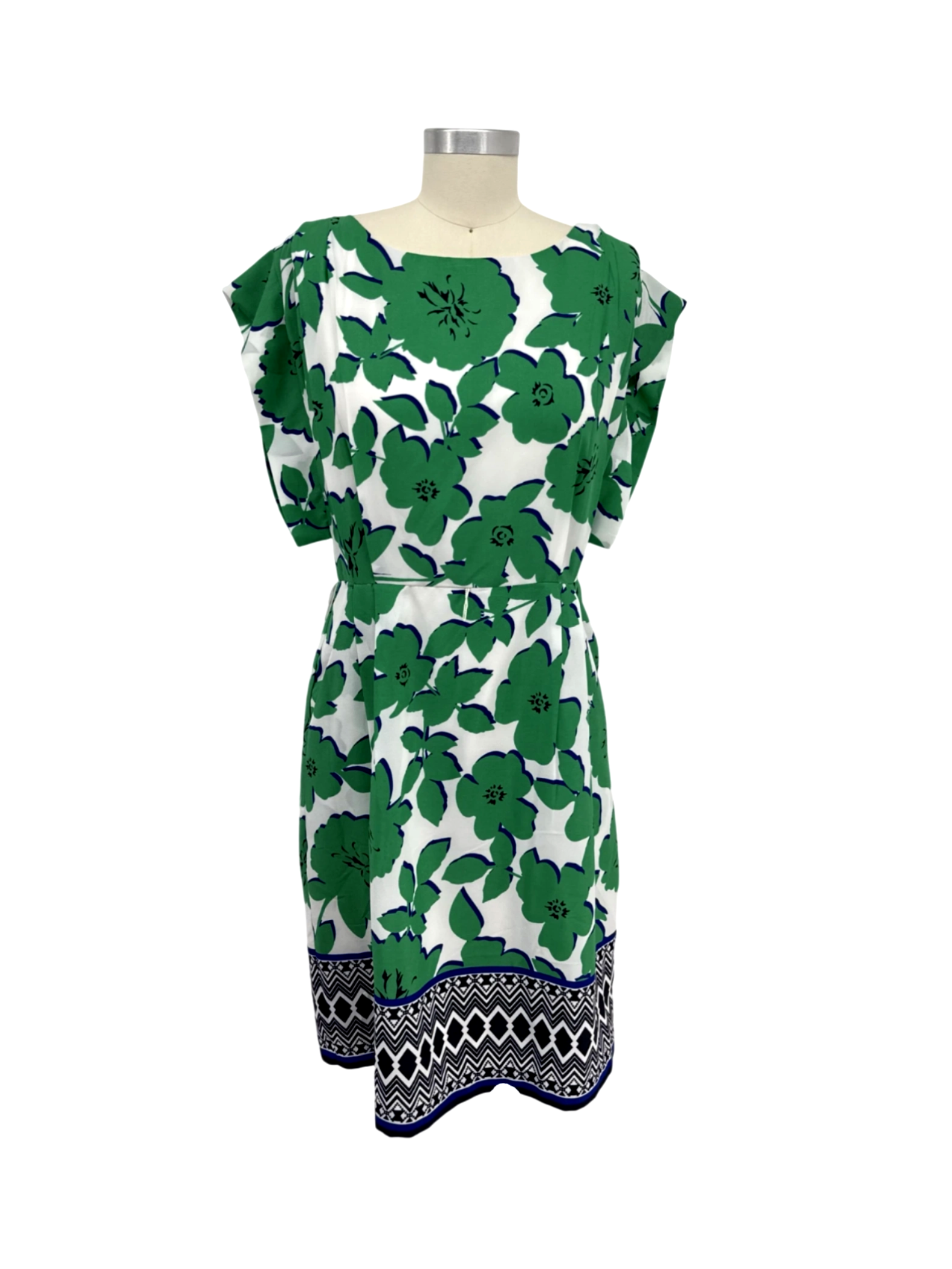 This pre-owned Eliza J dress is a beautiful choice for warm weather. The A-line dress features a vibrant floral print in green and white, perfect for a casual outing. Designed with a flattering round neck and short sleeves, this dress is both comfortable and stylish. Crafted from a quality material, it is sure to become a wardrobe favorite. The dress also has a geometric design in the hemline. A must-have piece to elevate your spring and summer wardrobe.
