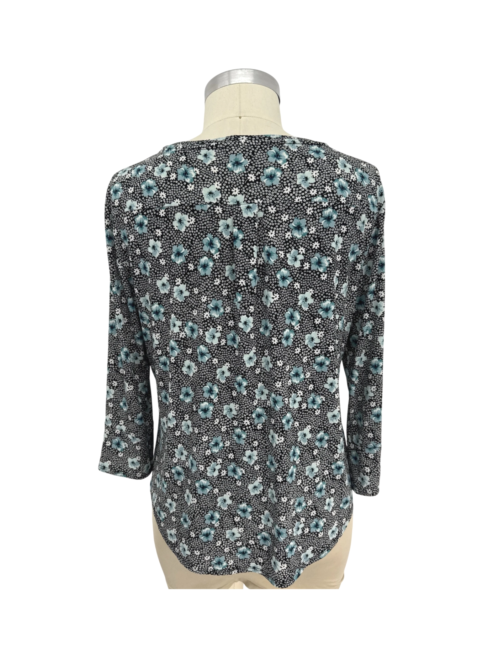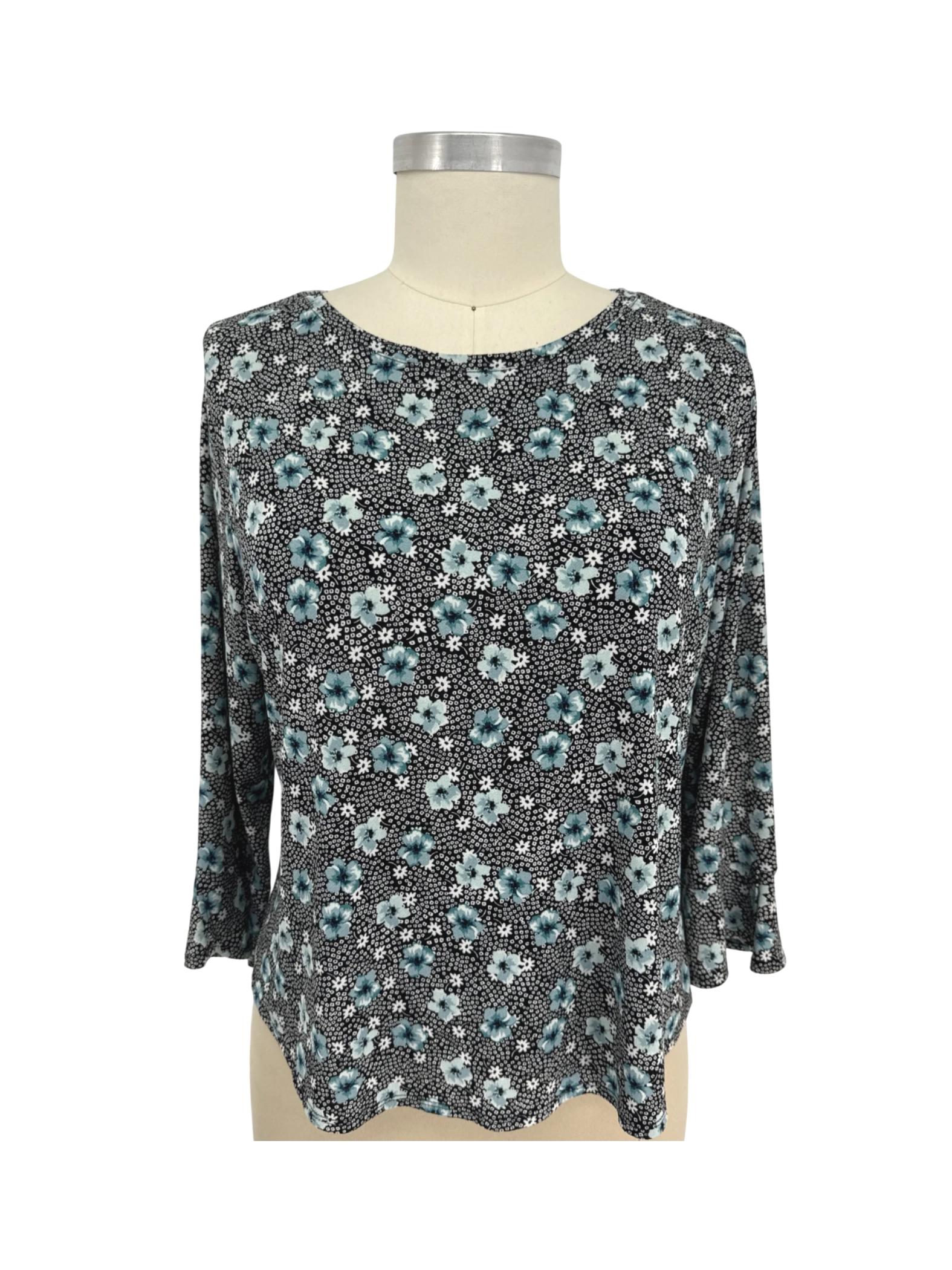 Elevate your wardrobe with this pre-owned ELLE blouse. Featuring a delicate floral print on a black base, this top is perfect for a touch of elegance. The ¾ sleeves and round neck offer a comfortable fit, suitable for spring, summer, and fall. Made from a blend of polyester and spandex, it offers a flattering drape and easy care. Perfect for a stylish and versatile addition to your everyday or work attire.