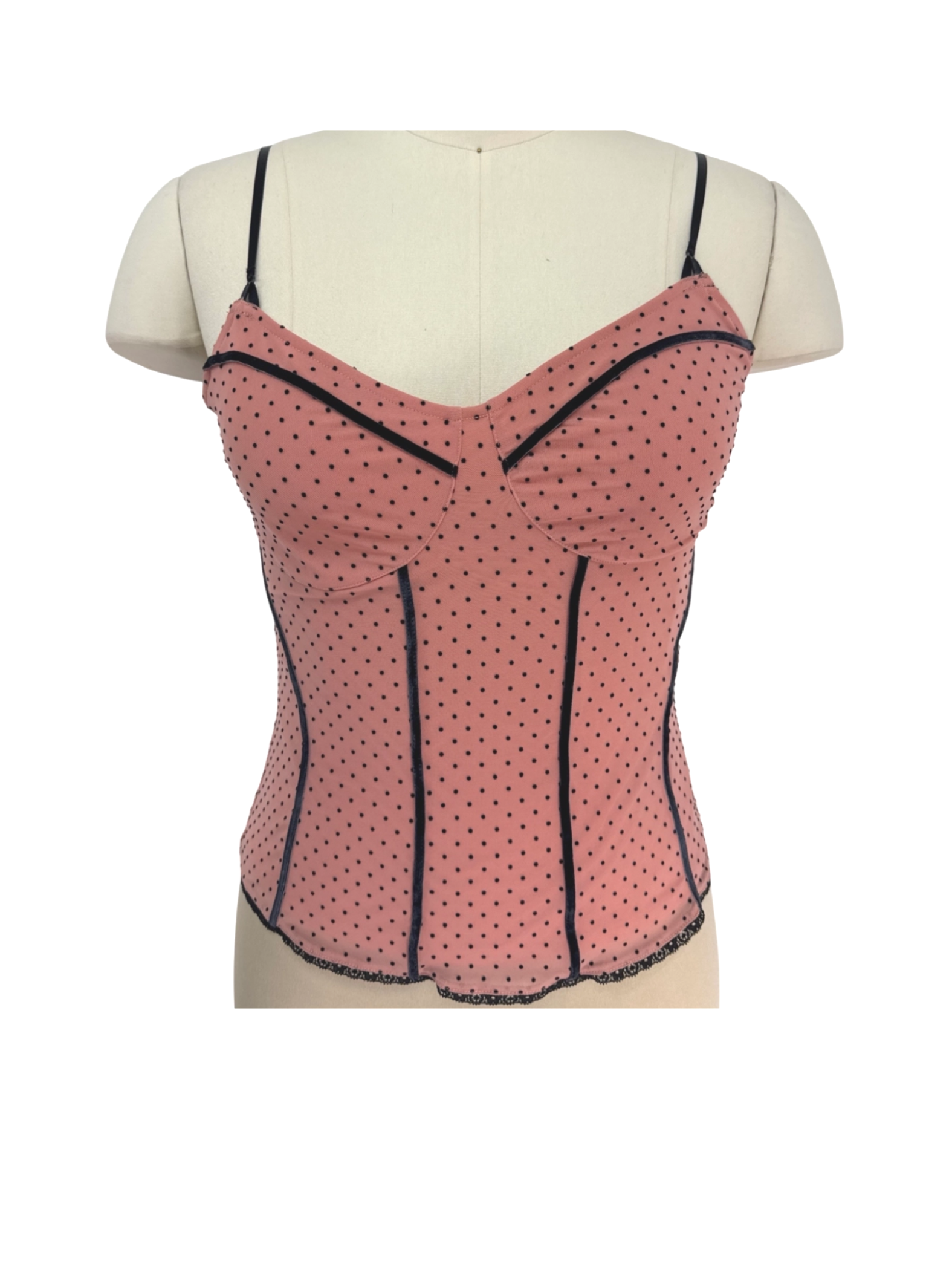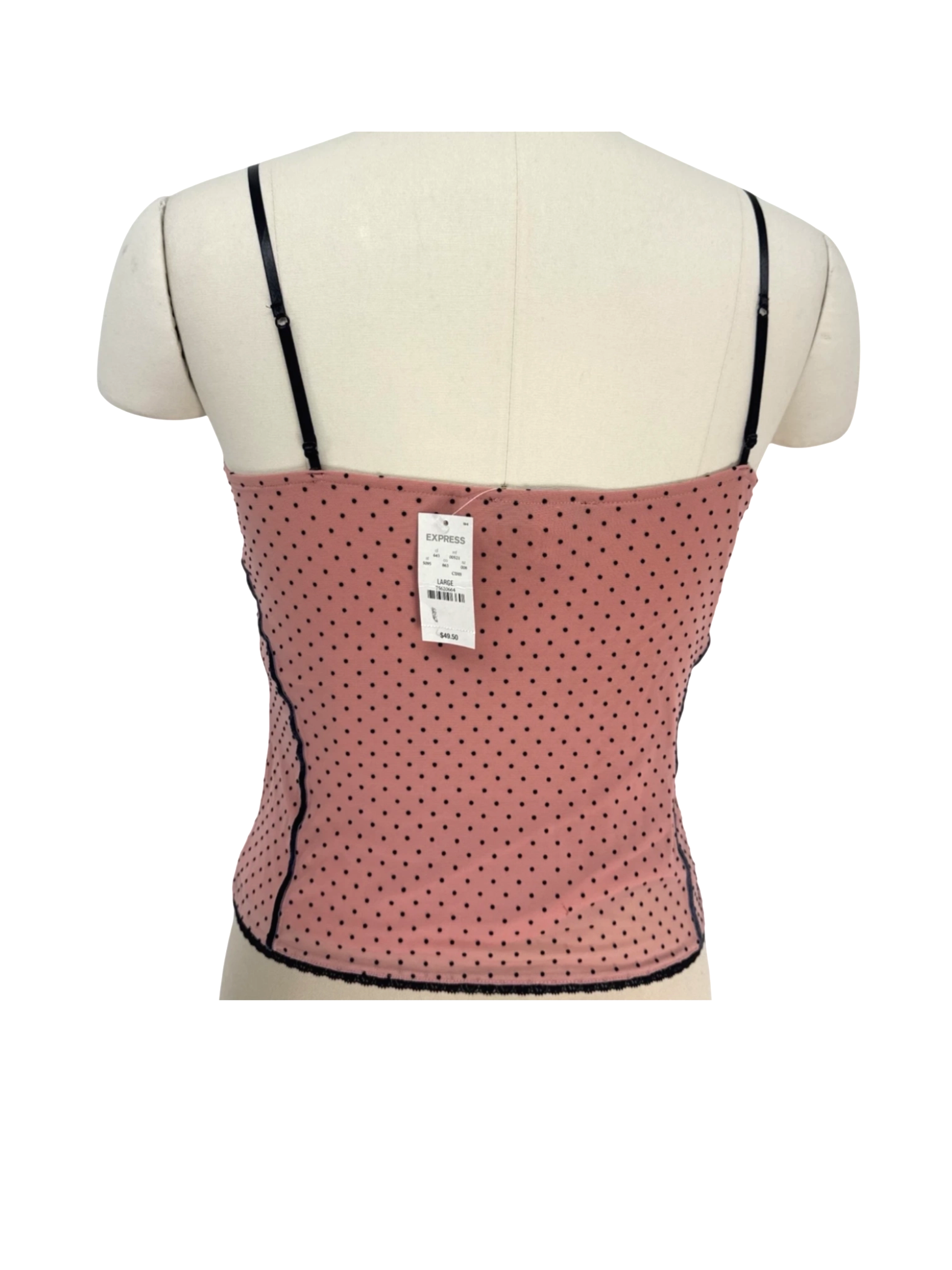 Elevate your wardrobe with this stylish Express tank top, perfect for warm weather. Featuring a flattering V-neck and delicate spaghetti straps, this cropped top is adorned with a charming polka dot pattern. Made from a blend of nylon and spandex, it offers a comfortable and figure-flattering fit. Ideal for casual outings or layering under a blazer, this pre-owned top combines classic design with a modern edge. A must-have addition to your summer collection.