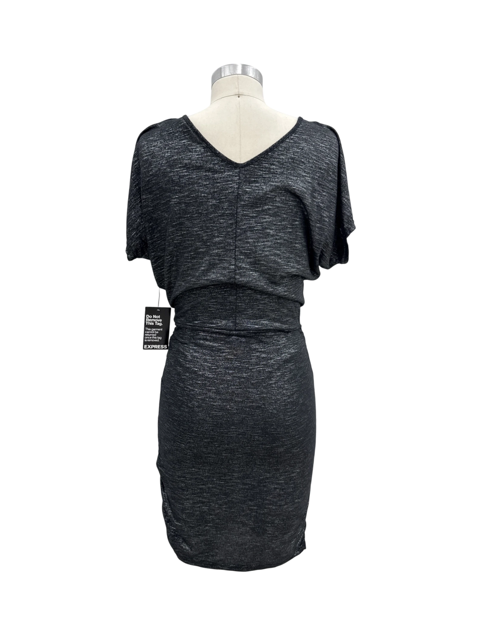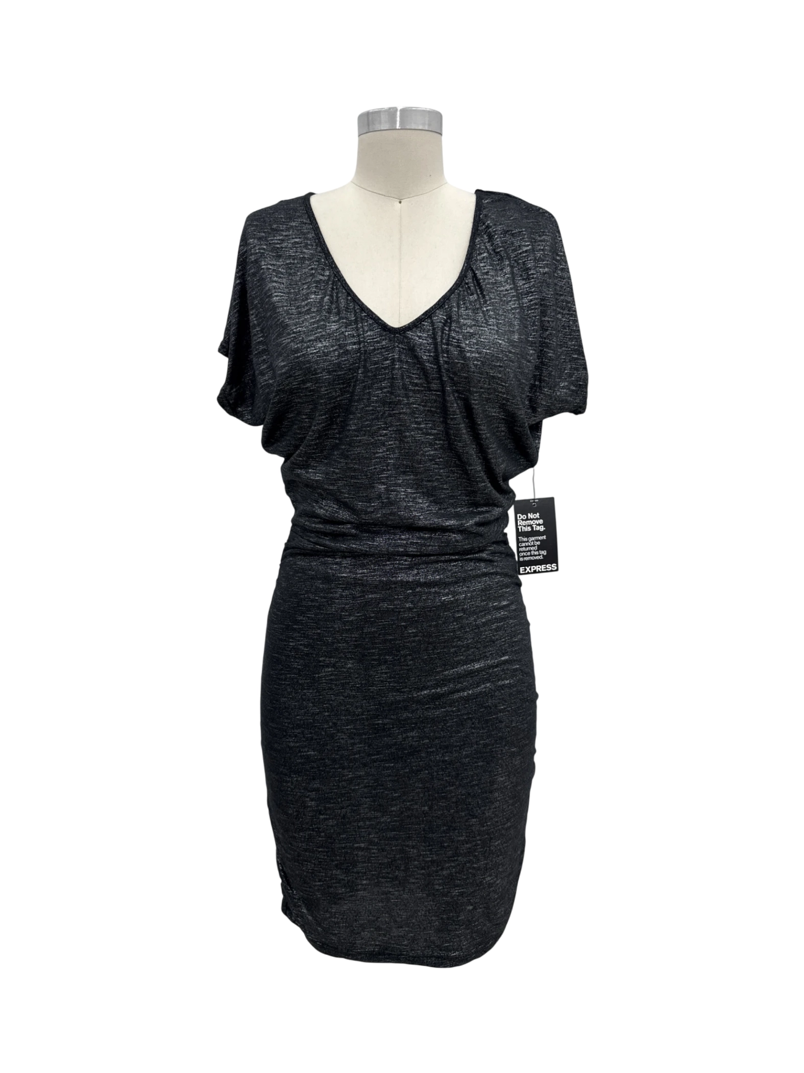 This chic, pre-owned Express dress is perfect for any occasion! This Bodycon dress features a flattering V-neck, short sleeves, and a mini skirt length. The dress comes in classic black, making it versatile for both casual outings and evening events. Crafted with a comfortable blend of polyester and rayon, it ensures a great fit and feel. This used dress is in good condition, and is a great addition to any wardrobe! This dress is perfect for your special events.
