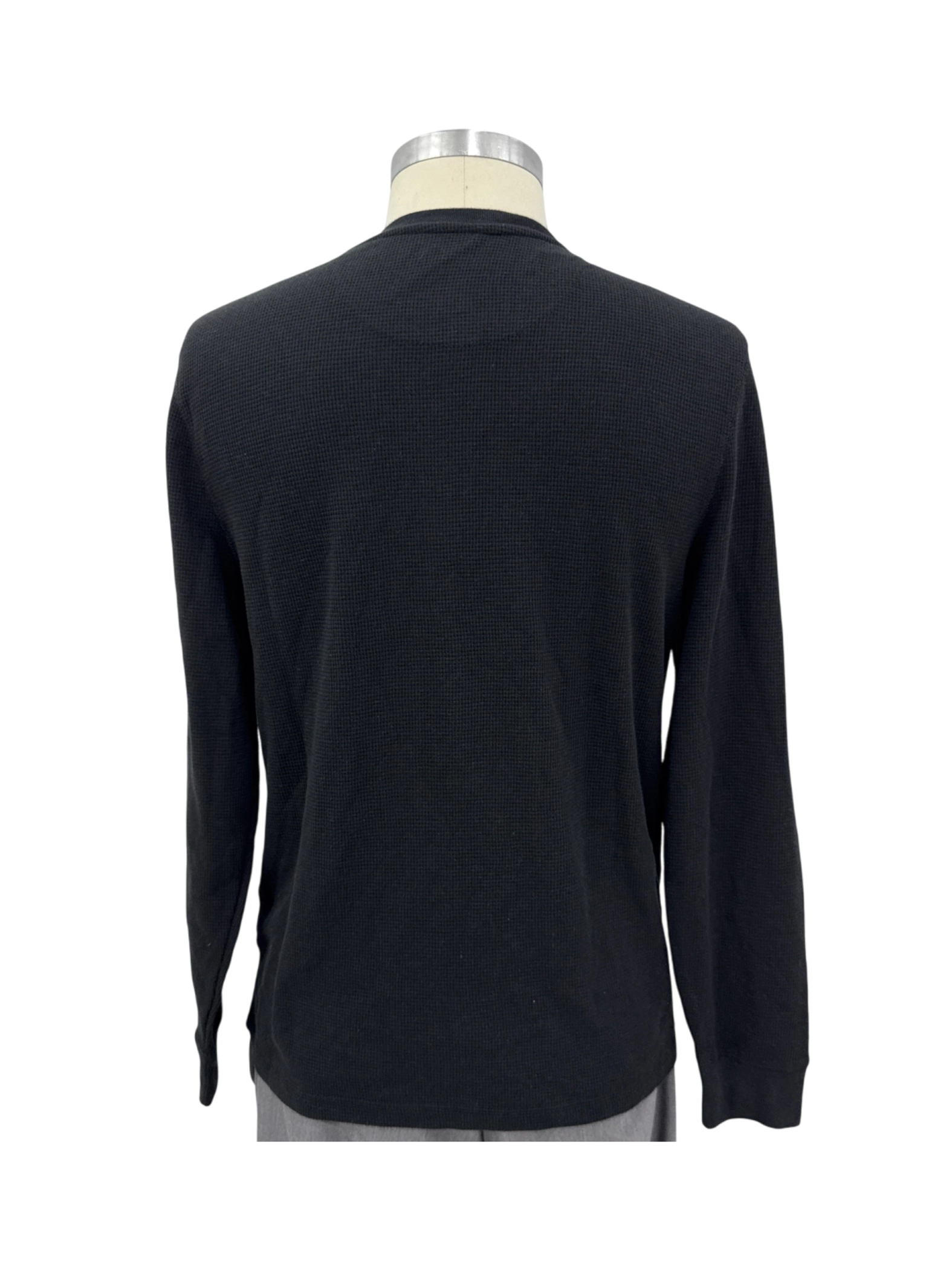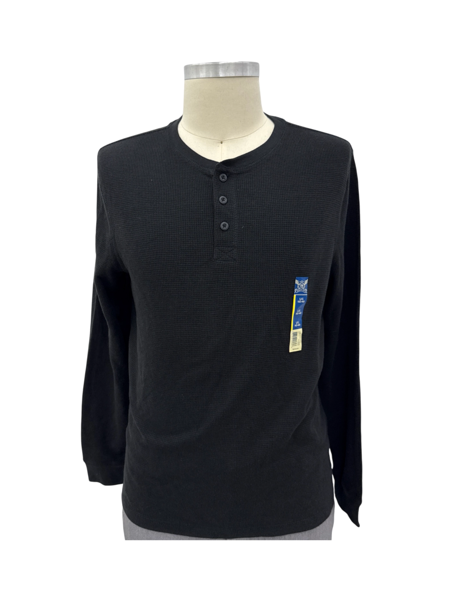 This pre-owned Faded Glory undershirt is a versatile addition to any wardrobe. Crafted from a comfortable cotton and polyester blend, this thermal-style long-sleeved shirt is perfect for layering or wearing on its own. Featuring a classic henley design with a button-up front and a textured waffle knit, it offers both style and warmth. Ideal for cooler weather, this black undershirt provides a comfortable fit. The shirt's simple design and neutral color make it a great base layer for various outfits.