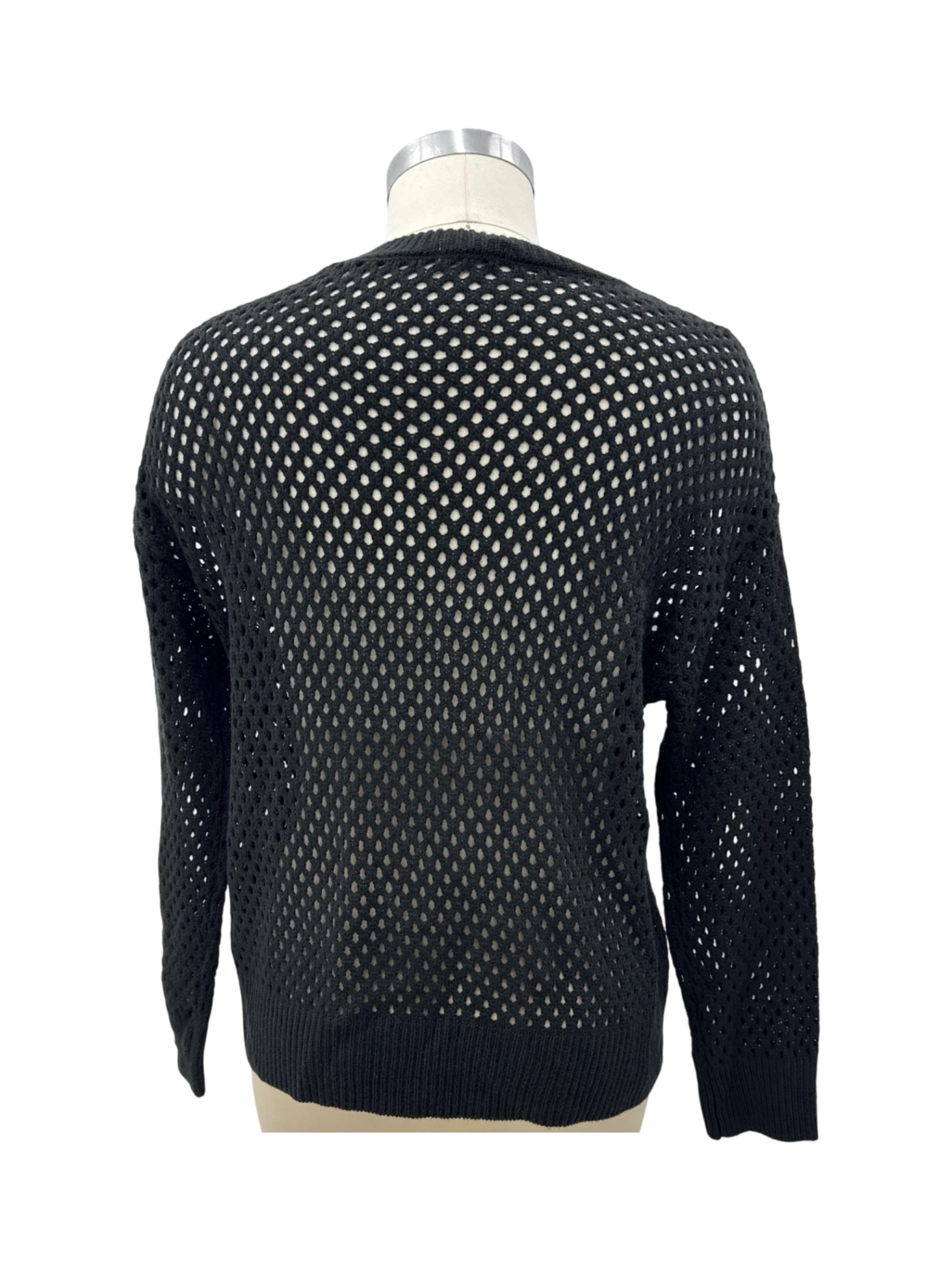 Elevate your wardrobe with this stylish pre-owned Faded Rose sweater. This black knit sweater features a unique open-knit design, perfect for layering during the transitional seasons. Crafted with a comfortable material, this sweater offers both style and comfort. The round neckline and classic style make it a versatile addition to any outfit. Pair it with jeans or a skirt for a chic, effortless look.