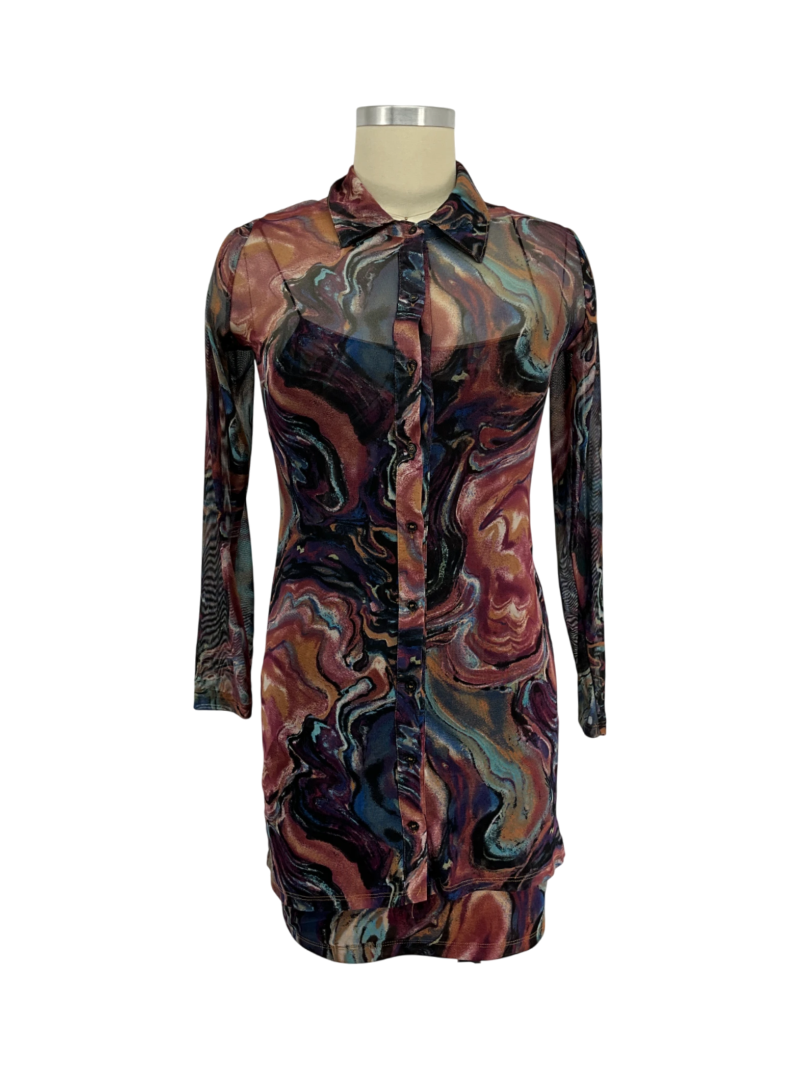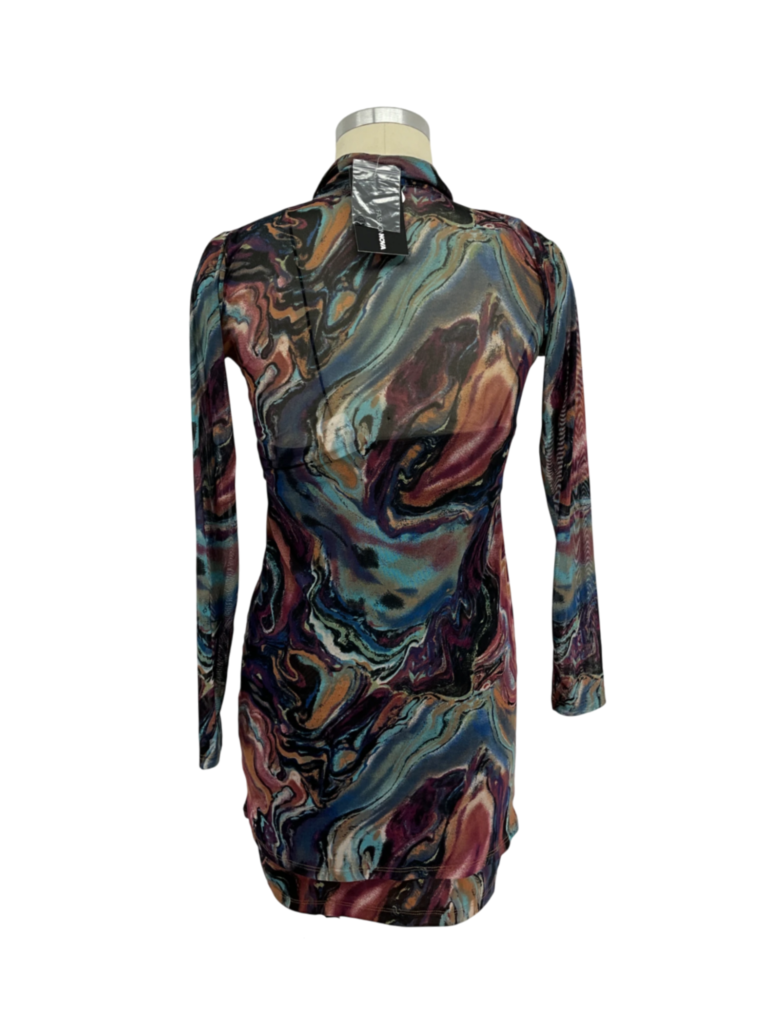 The Fashion Nova multicolor midi bodycon dress features a stretchy mesh overlay with lining. It is a size medium and is in good condition.