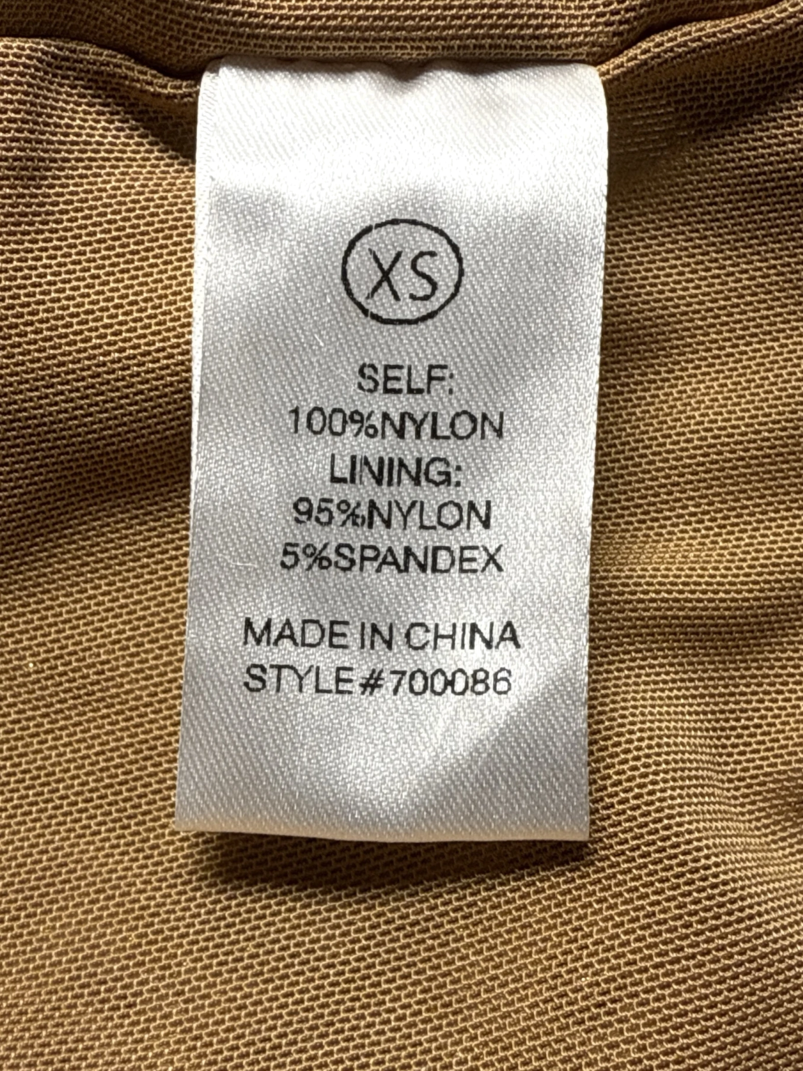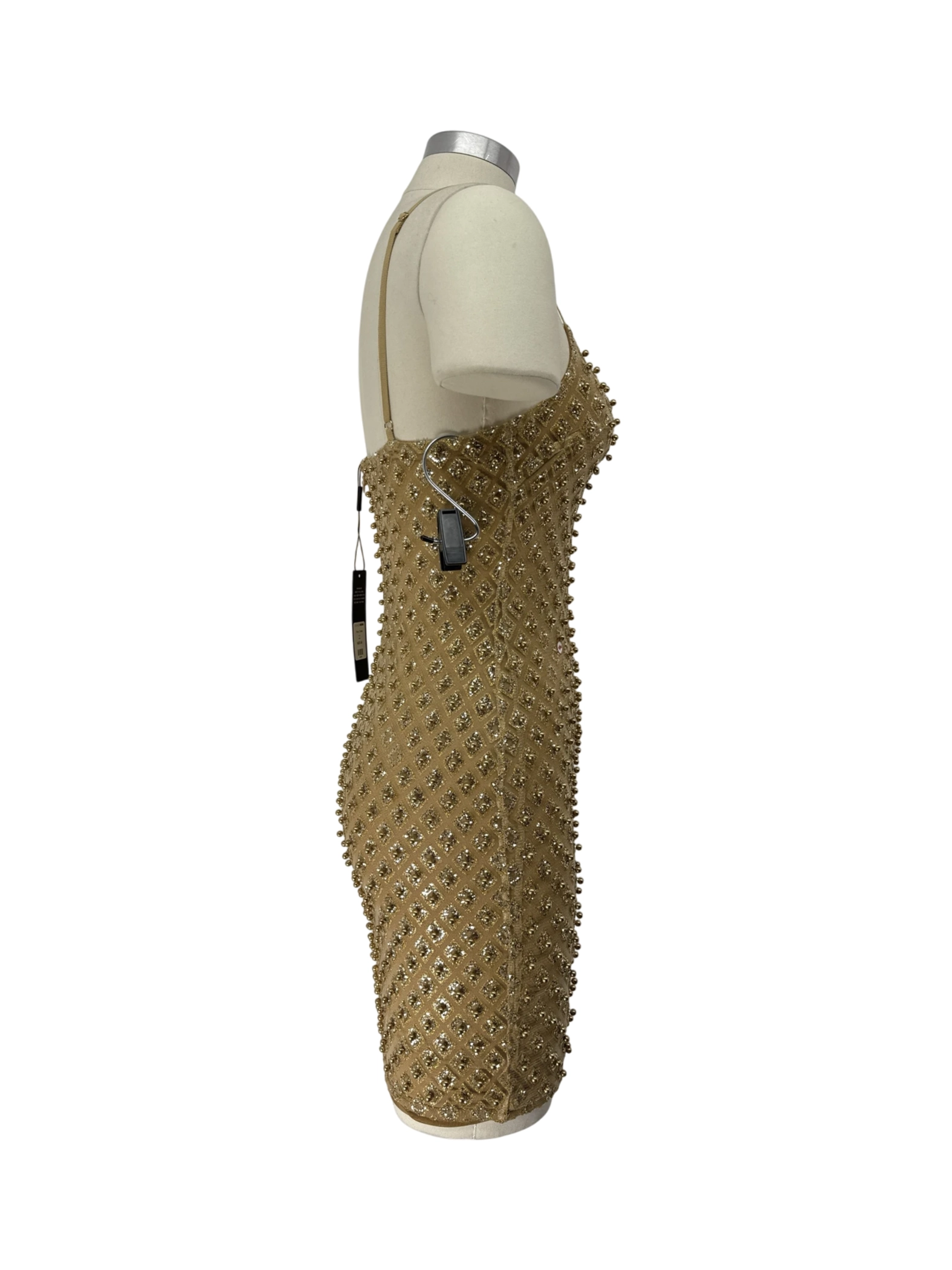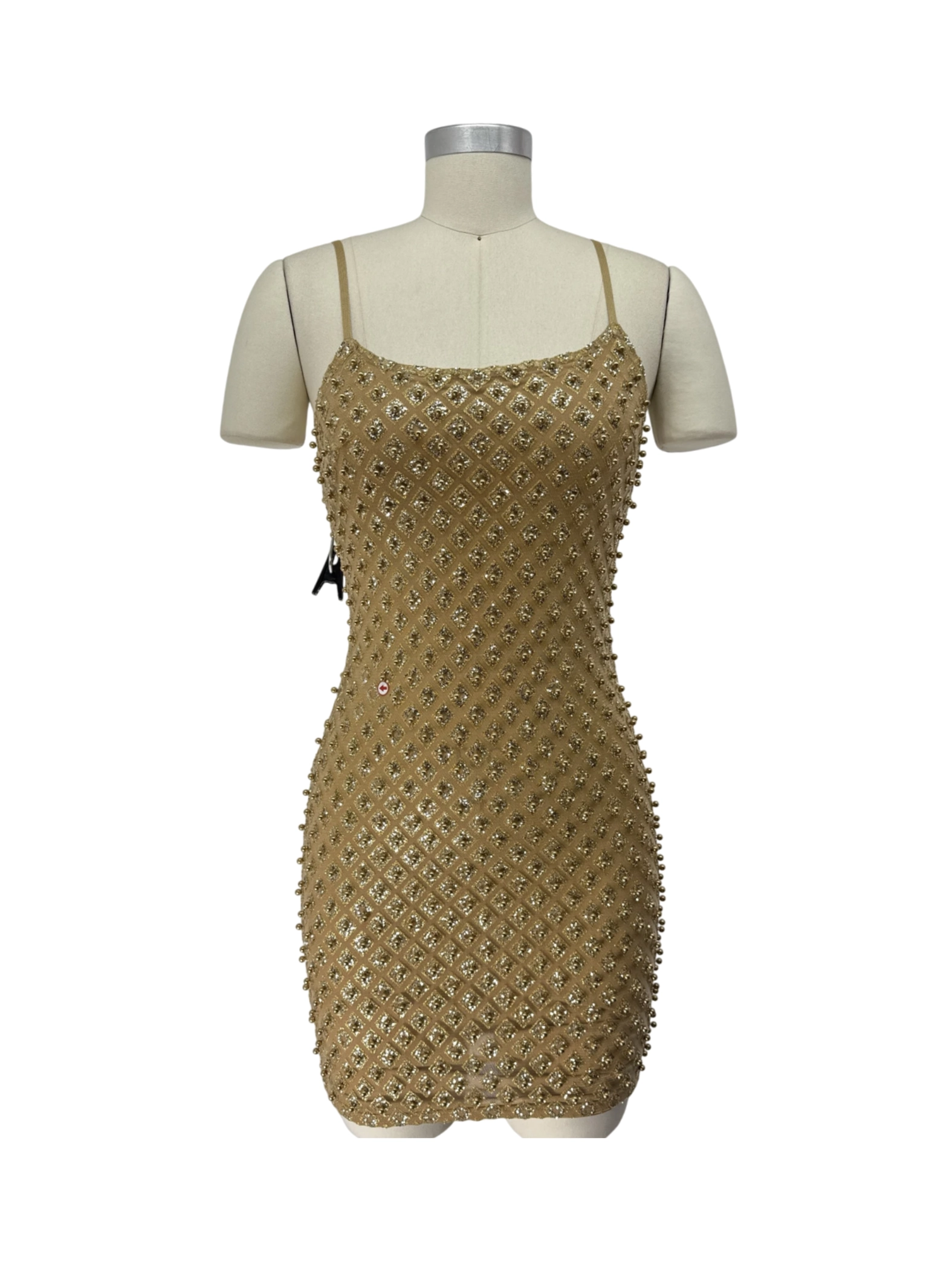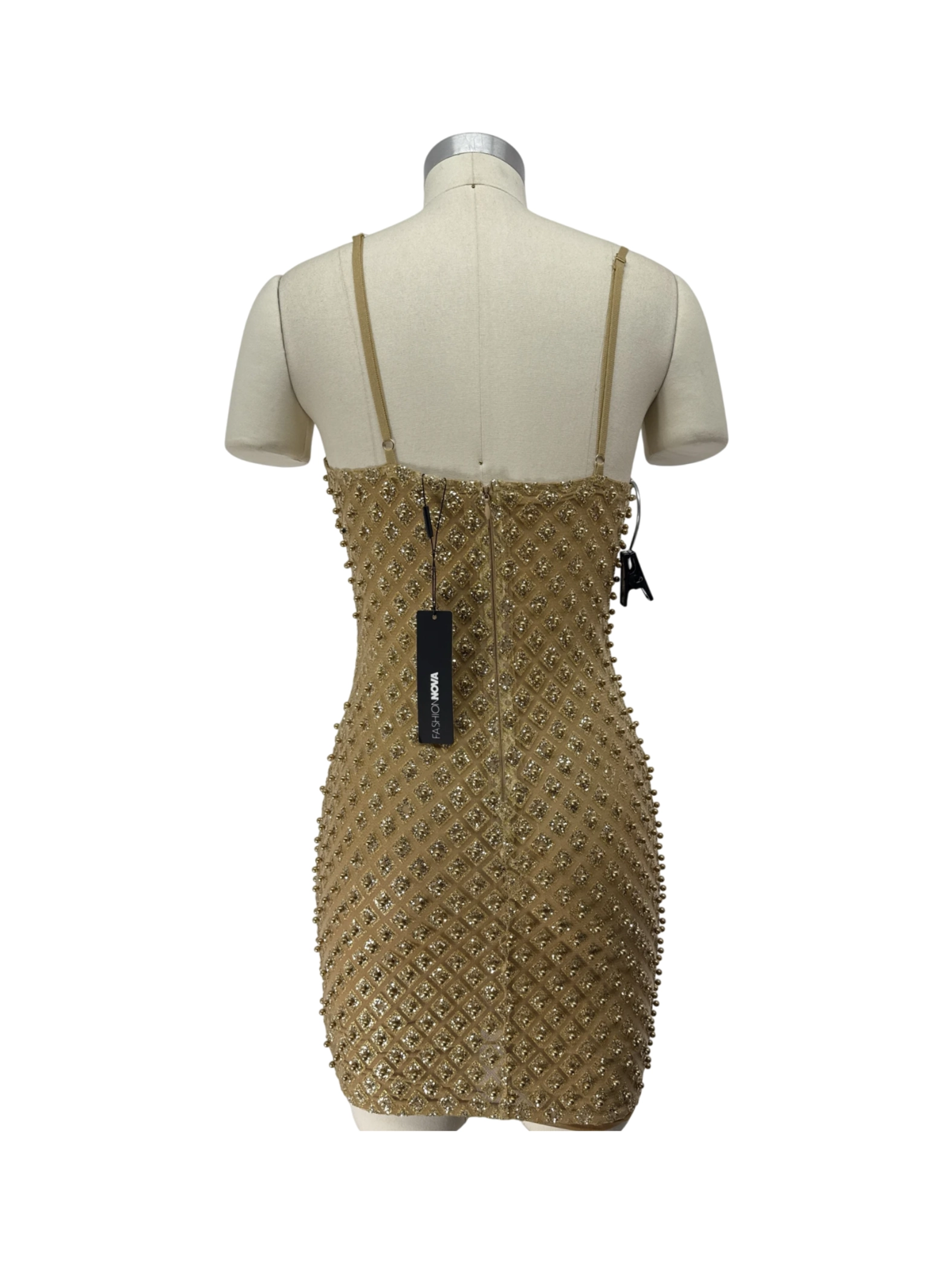 This stunning, pre-owned Fashion Nova bodycon dress is the perfect statement piece for your next night out. The dress features a sparkling metallic gold design, flattering the silhouette. The spaghetti straps and mini skirt length create a flirty, yet sophisticated look. Crafted from a luxurious blend of nylon and spandex, it ensures both comfort and a figure-hugging fit. This dress is perfect for any cocktail party, and will have you turning heads all night long.
