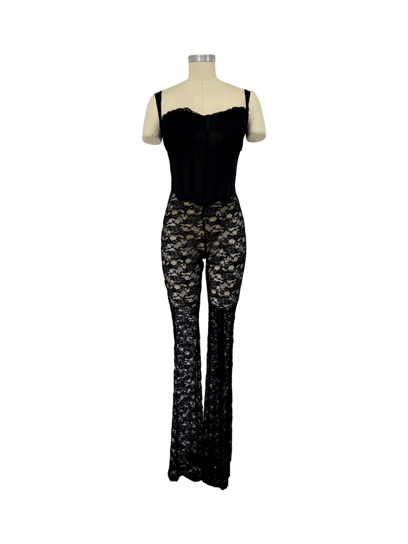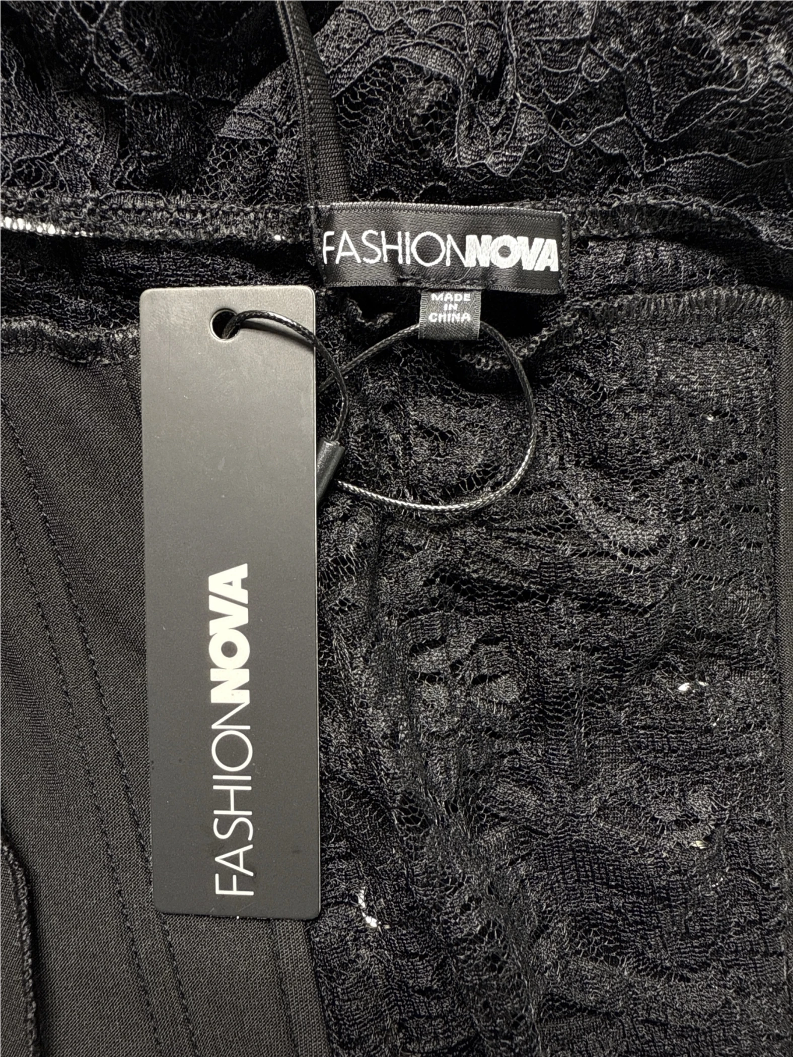 This stunning Fashion Nova jumpsuit is perfect for your next night out. Featuring a flattering bodycon fit, delicate lace details, and a square neckline with spaghetti straps, this jumpsuit is sure to turn heads. Made from a comfortable blend of nylon, spandex, and polyester, it offers a luxurious feel. The all-black color adds a touch of elegance, making it ideal for cocktail parties or special events. This pre-owned jumpsuit is in excellent condition and ready to elevate your wardrobe.