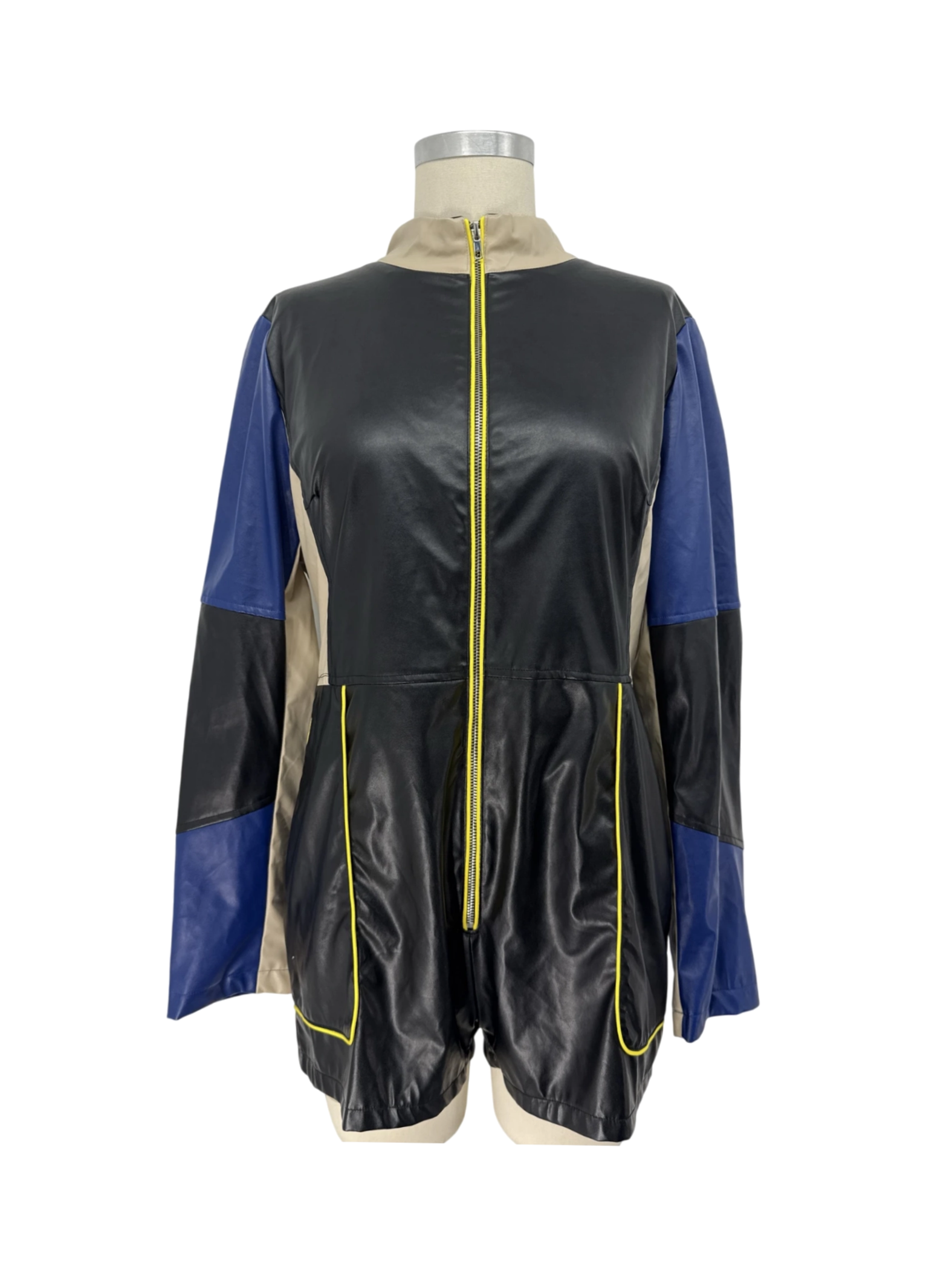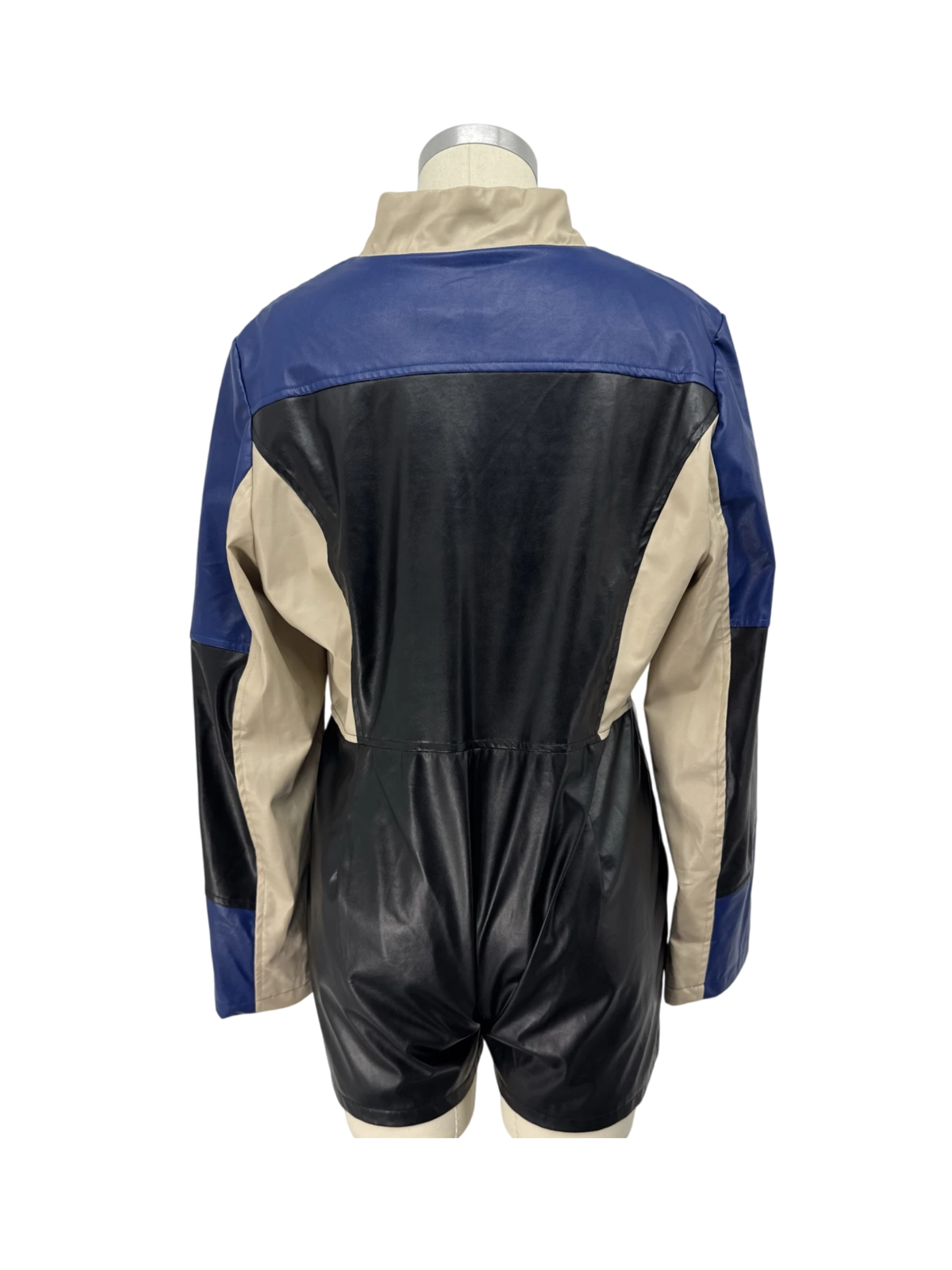 This stylish Fashion Nova jumpsuit is a must-have for your wardrobe. Featuring a chic color block design in black, blue, and beige, this jumpsuit is perfect for making a statement. It has long sleeves, a mini skirt length, and is designed to provide a flattering fit. The jumpsuit is made of polyester and PVC, and is ideal for parties or everyday wear. It is in excellent condition, making it a great find for those seeking quality and style.