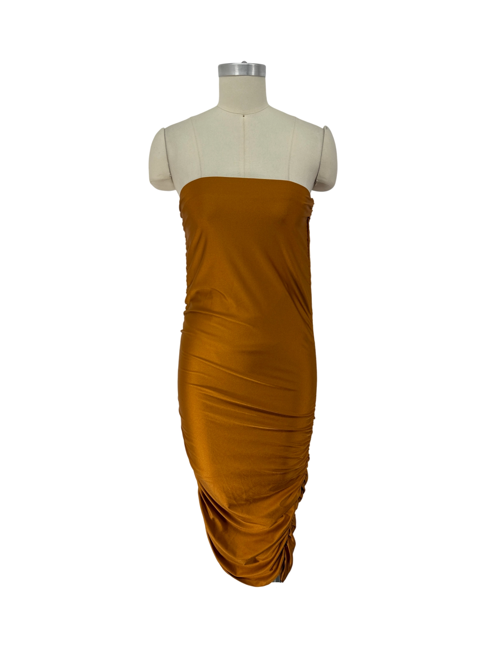 This Fashion Nova bodycon dress is the perfect addition to your summer wardrobe. The strapless design and mini skirt length create a chic and flattering silhouette, ideal for a night out. The dress is made from a comfortable blend of Nylon and Spandex for a perfect fit. The dress features a beautiful Mustard color and ruched details. It's a pre-owned item that will make you stand out from the crowd.