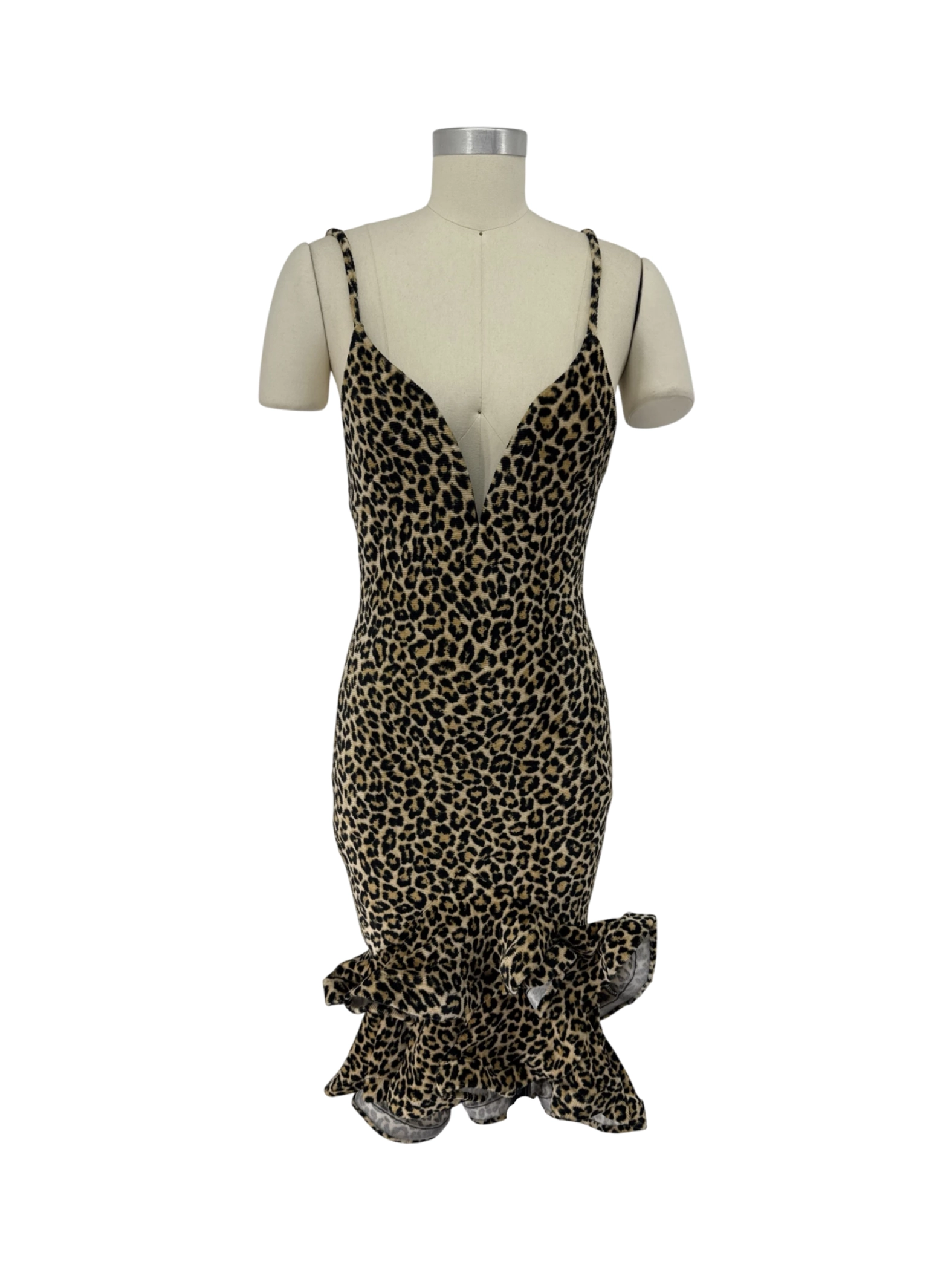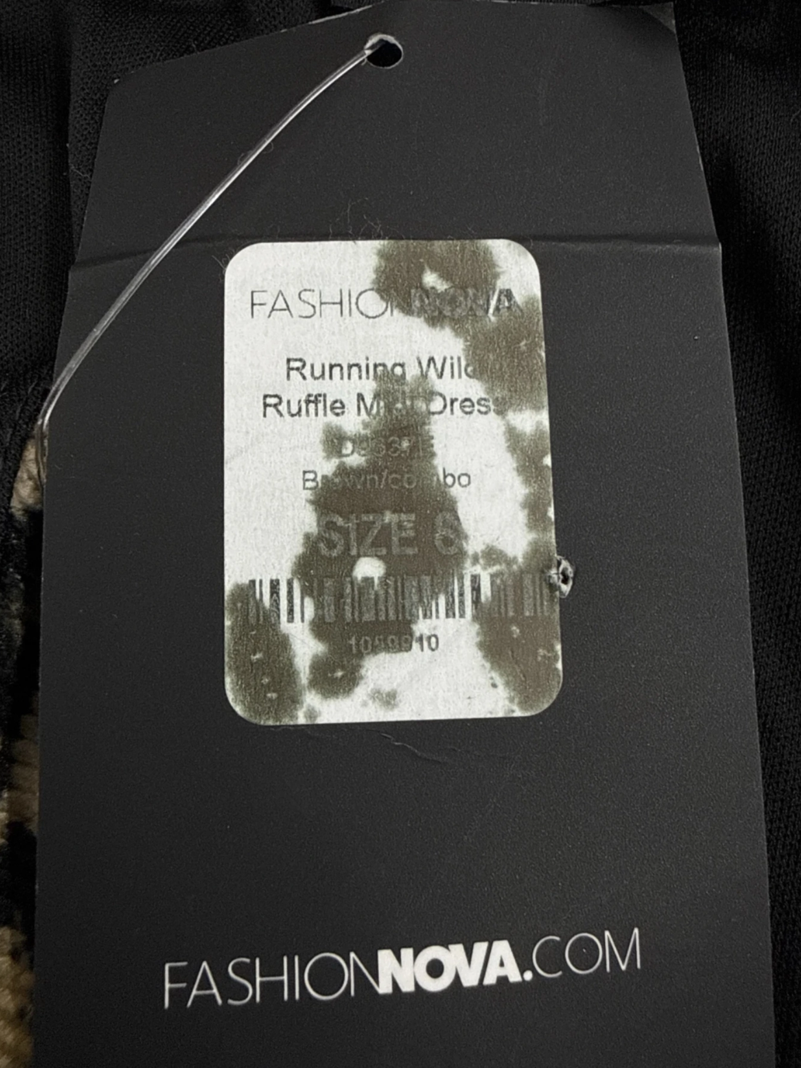 This Fashion Nova dress is the perfect statement piece for any party or night out. The stunning animal print and flattering A-line silhouette create a confident and chic look. Featuring delicate spaghetti straps and a playful ruffled hem, this dress is designed to make you feel beautiful. Made with a comfortable blend of polyester and spandex, this pre-owned dress is a great find.