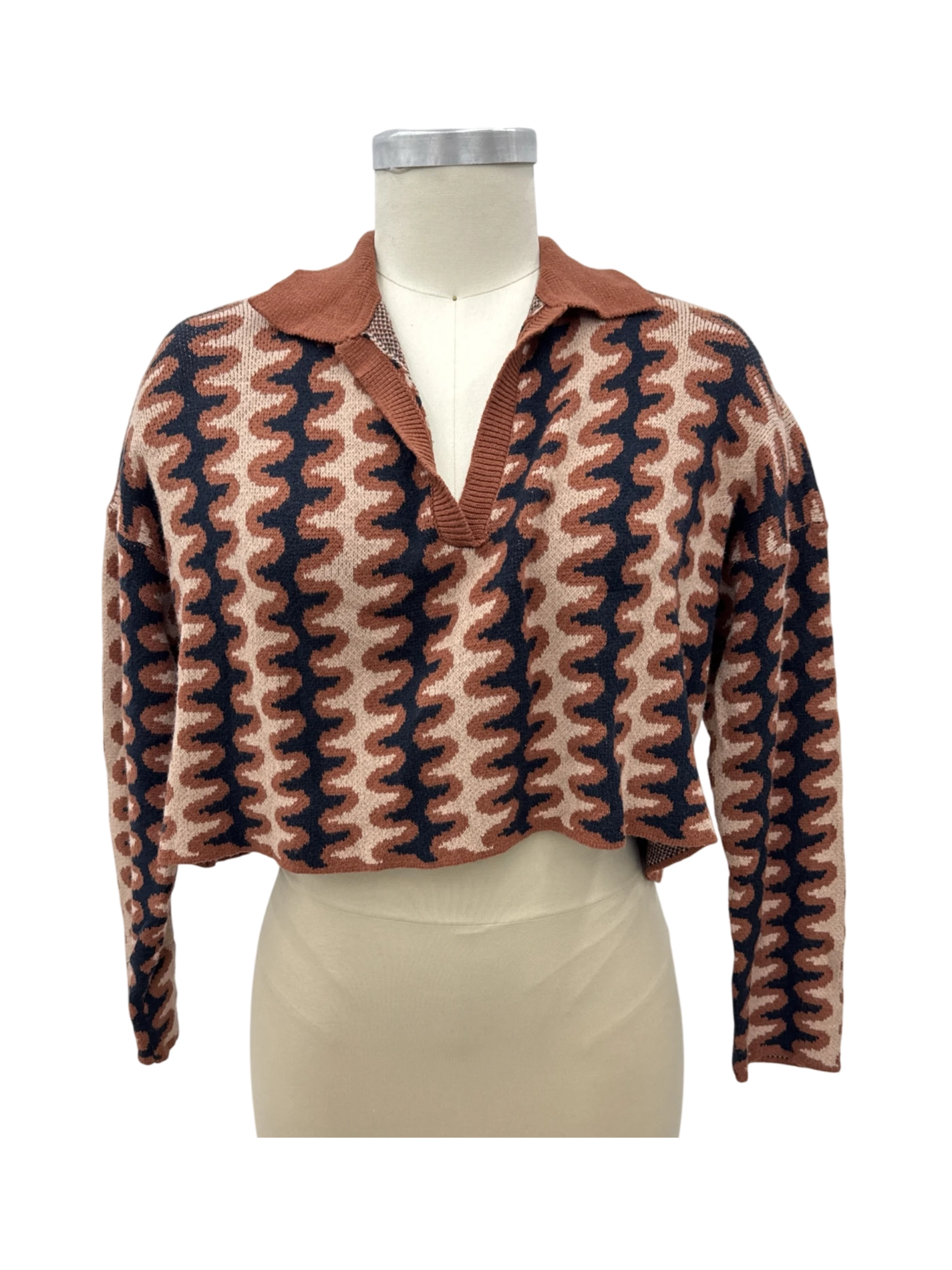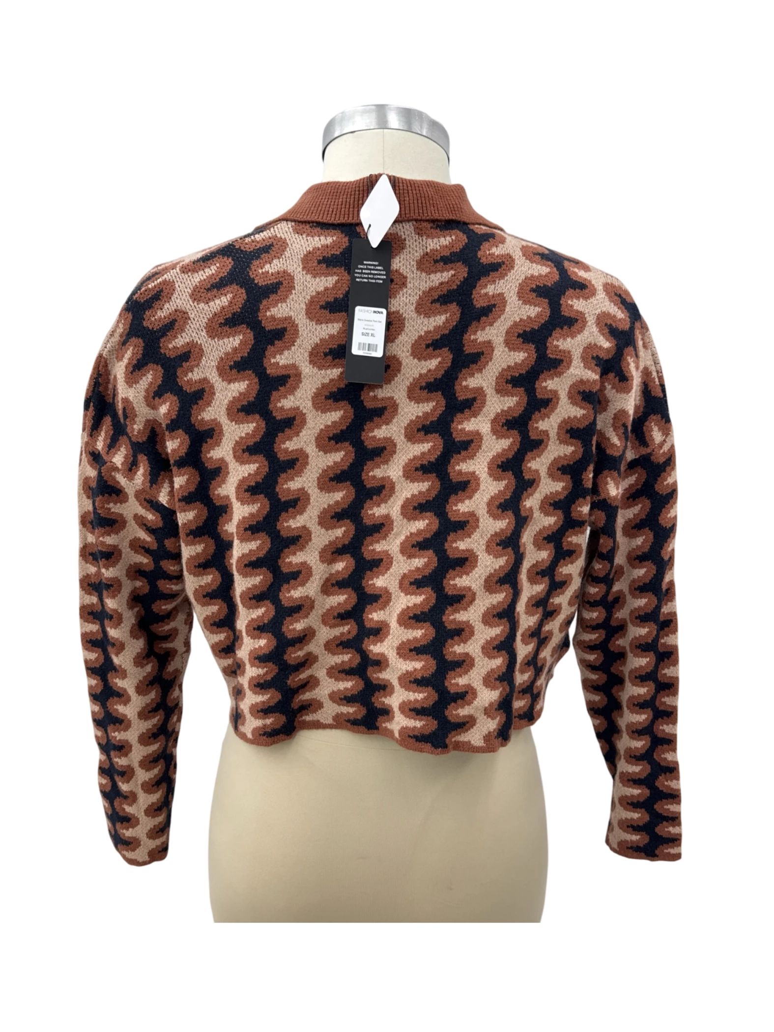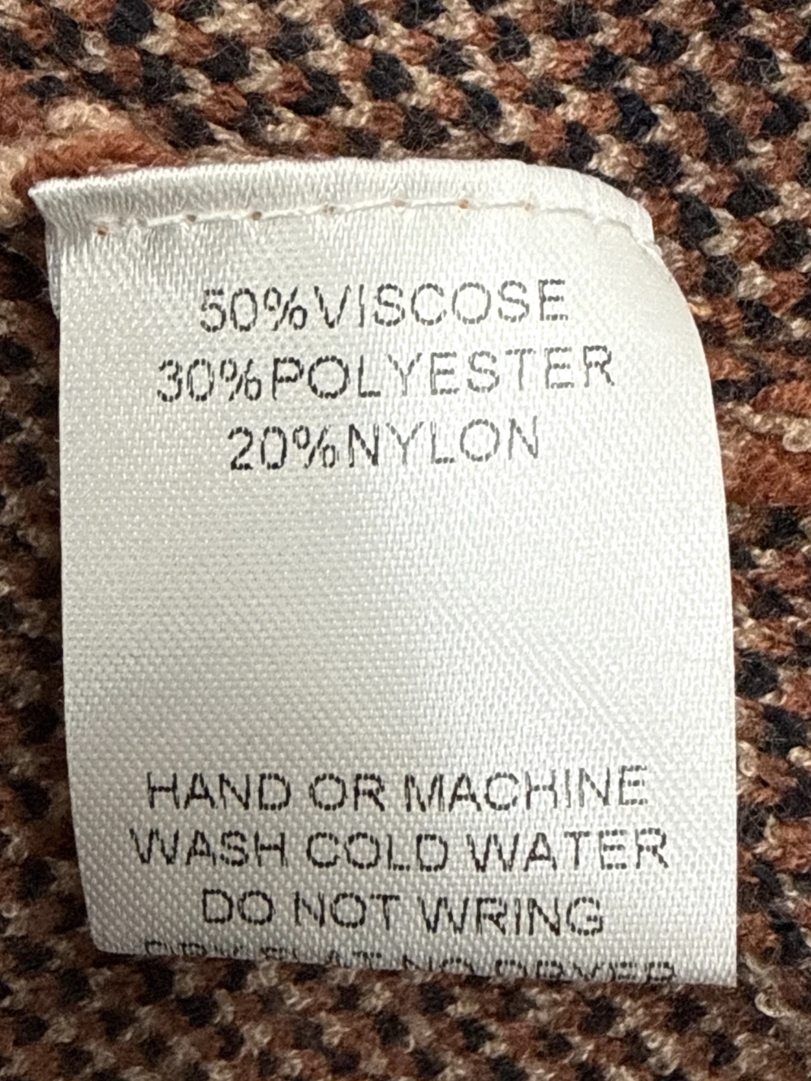 Elevate your wardrobe with this stylish Fashion Nova cardigan sweater. This pre-owned sweater features a unique geometric pattern in shades of brown, perfect for fall and winter. The V-neck design adds a touch of sophistication, while the long sleeves keep you cozy. Crafted from a blend of viscose, polyester, and nylon, this sweater offers both comfort and durability. This sweater is perfect for any casual or semi-formal event. A must-have addition to any fashion-forward woman's collection.
