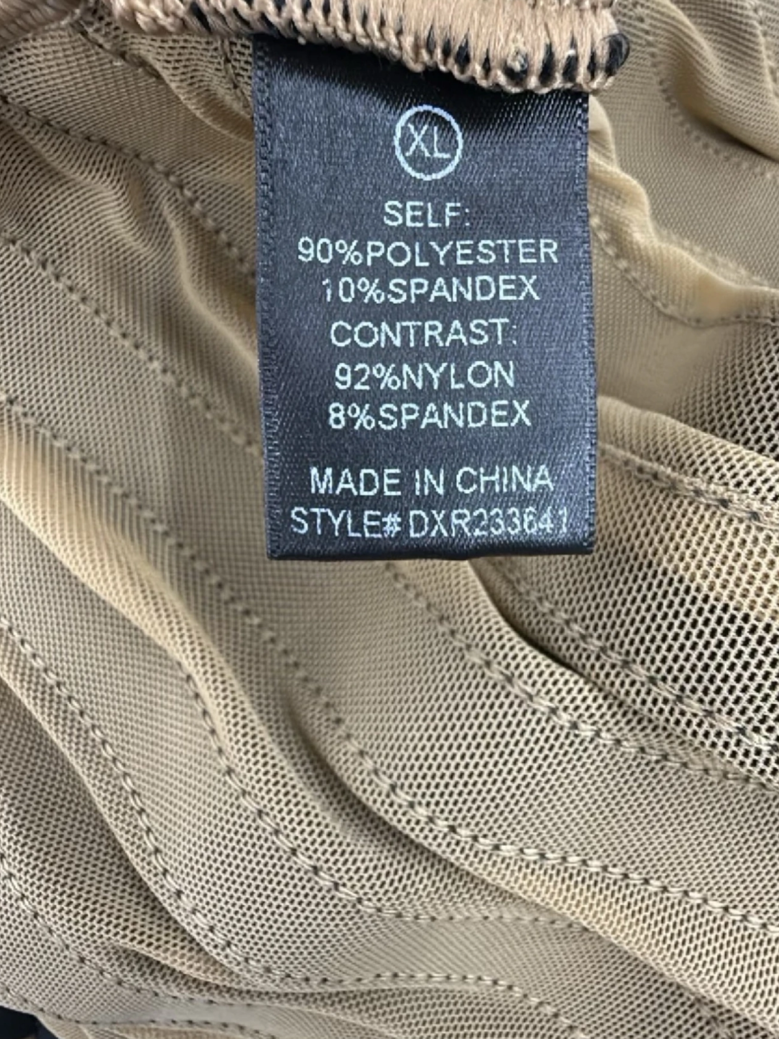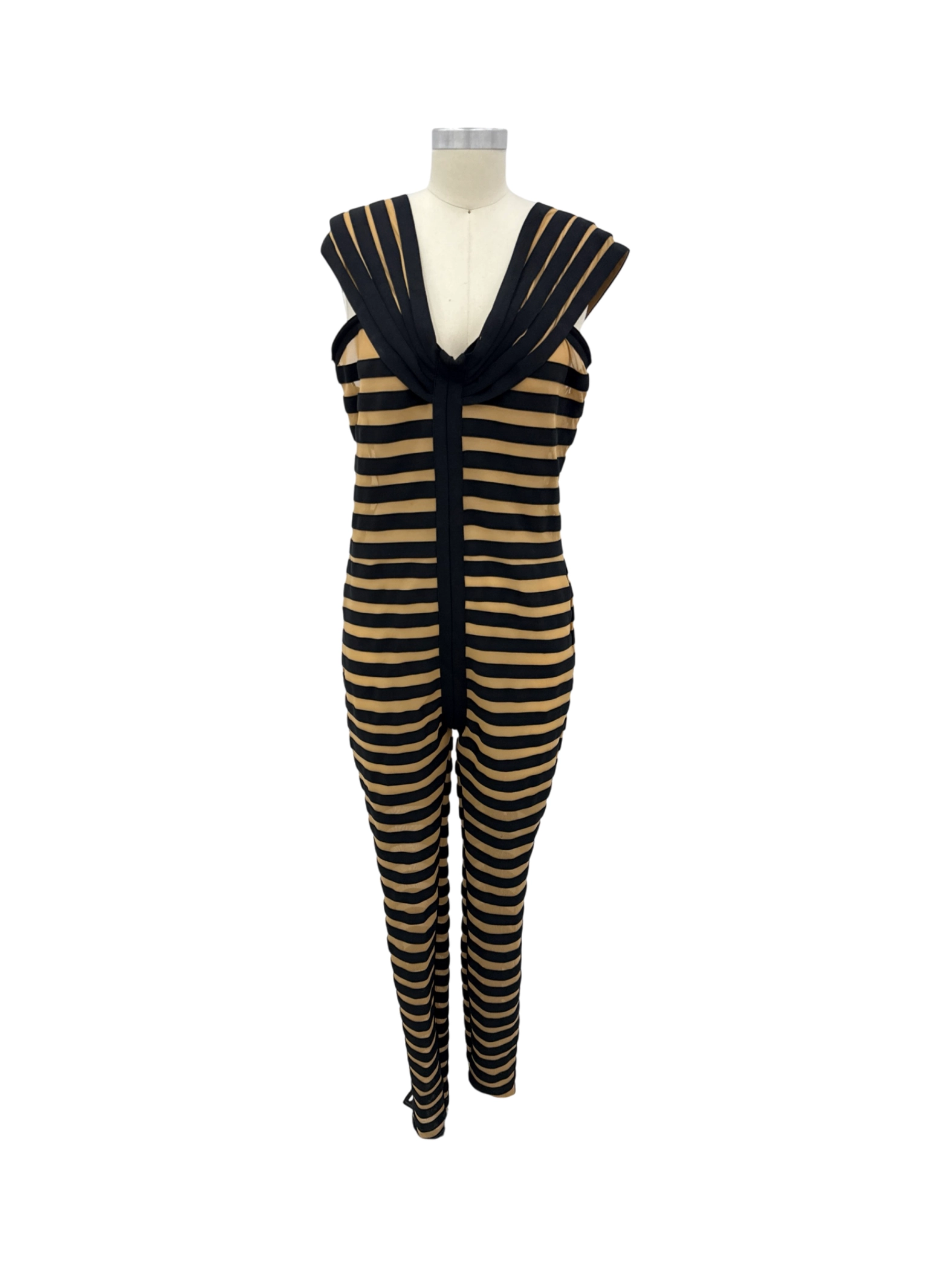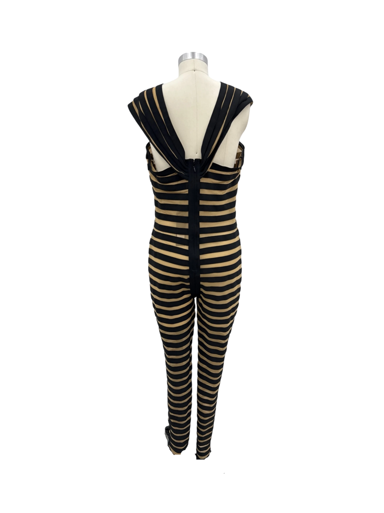 This Fashion Nova jumpsuit is a stylish choice for any occasion. Featuring a unique striped pattern in black and tan, this jumpsuit is perfect for making a statement. Crafted from a blend of polyester, spandex, and nylon, it offers a comfortable and flattering fit. The sleeveless design and V-neckline add a touch of sophistication, making it suitable for both casual and cocktail events. Get ready to turn heads with this trendy and versatile jumpsuit.