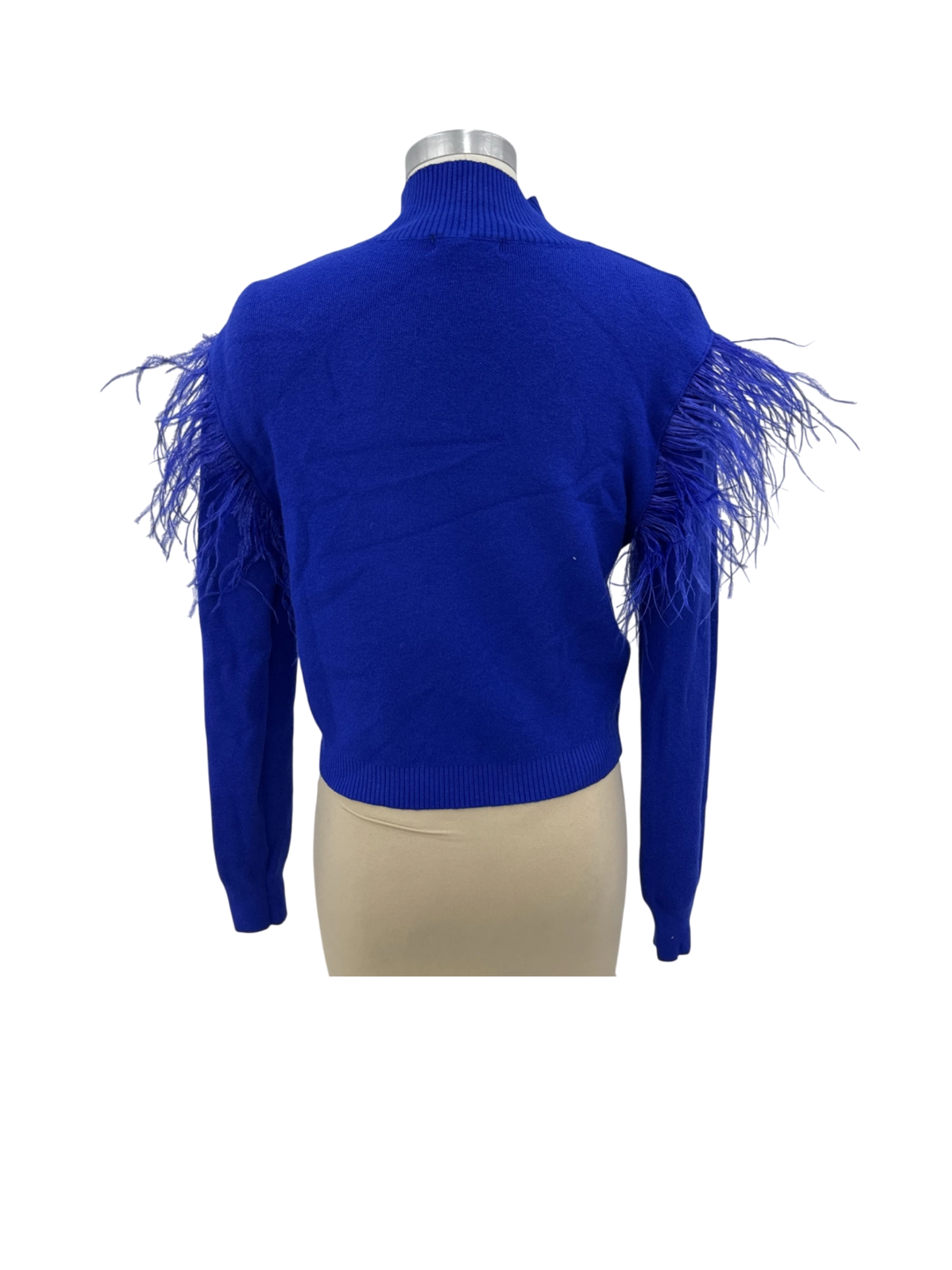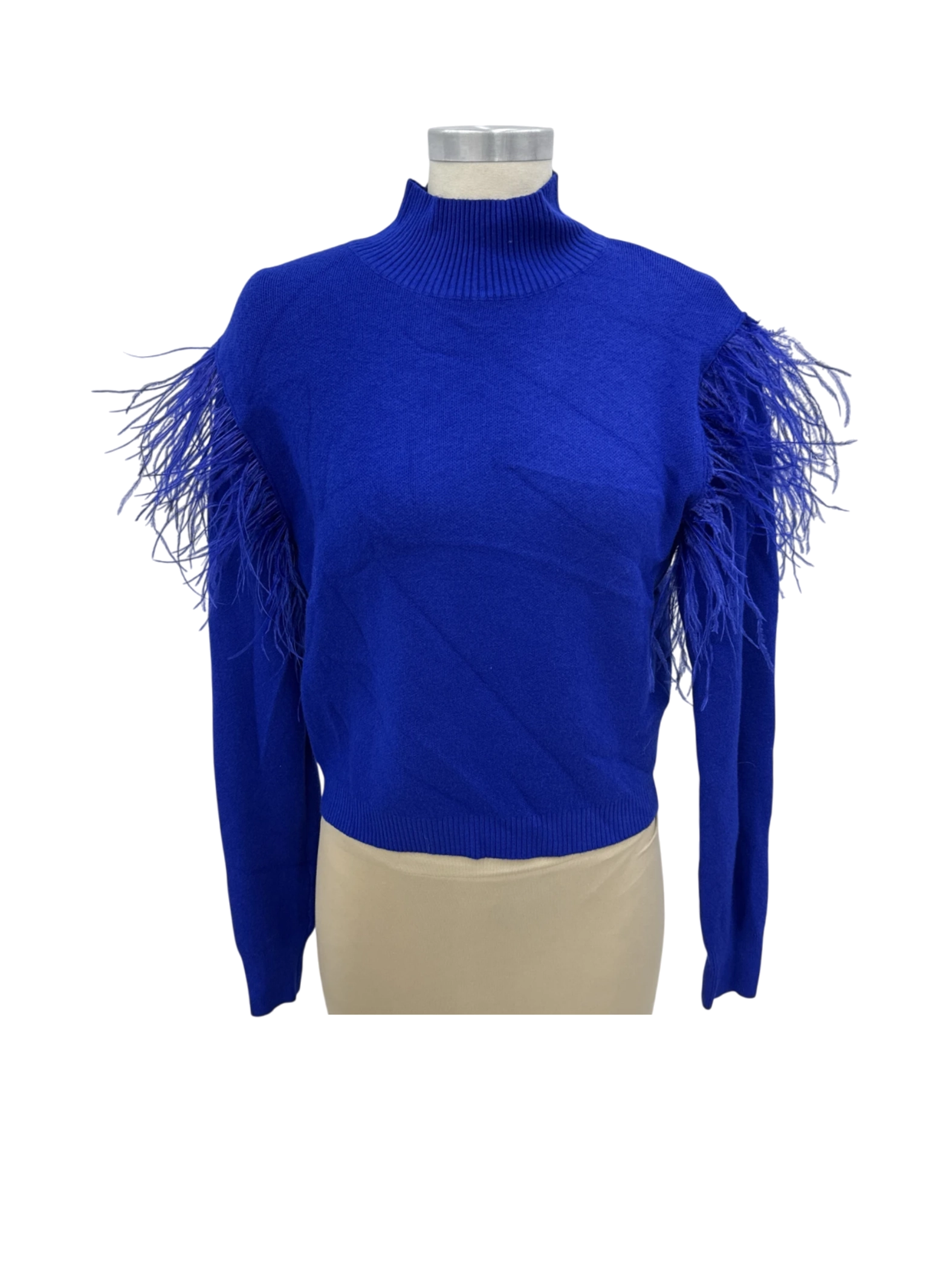 Elevate your wardrobe with this stylish Fashion Nova sweater. It features a stunning blue color and an elegant turtleneck design with feather details. Crafted from a soft blend of Viscose, Polyester, and Polyamide, this sweater offers both comfort and style. Perfect for adding a touch of sophistication to your fall and winter outfits. Embrace warmth and fashion with this must-have piece. Good for a night out or dressed down. Buy it now.