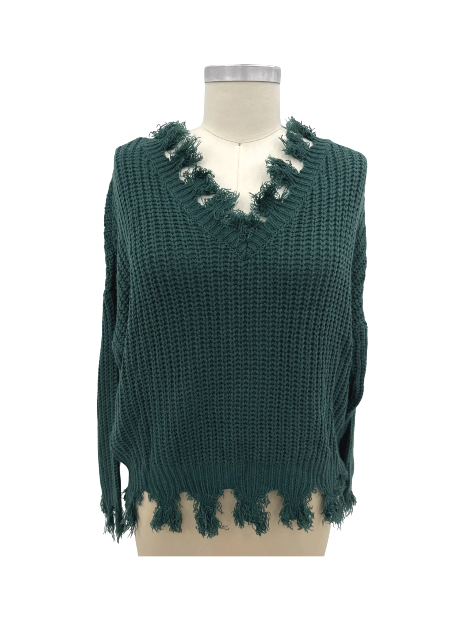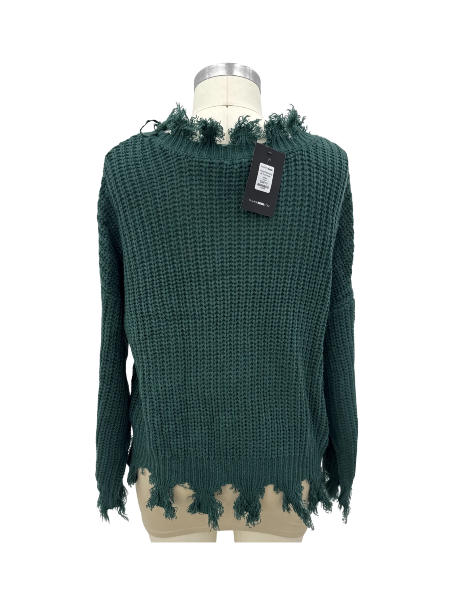 Elevate your wardrobe with this stylish Fashion Nova sweater. This pre-owned, yet well-maintained piece features a trendy V-neck and a unique fringe detail, perfect for the fall and winter seasons. The deep green color adds a touch of sophistication to any outfit. Made from a comfortable acrylic material, it's a cozy yet chic choice. With its versatile design, this sweater is a must-have addition to your collection.