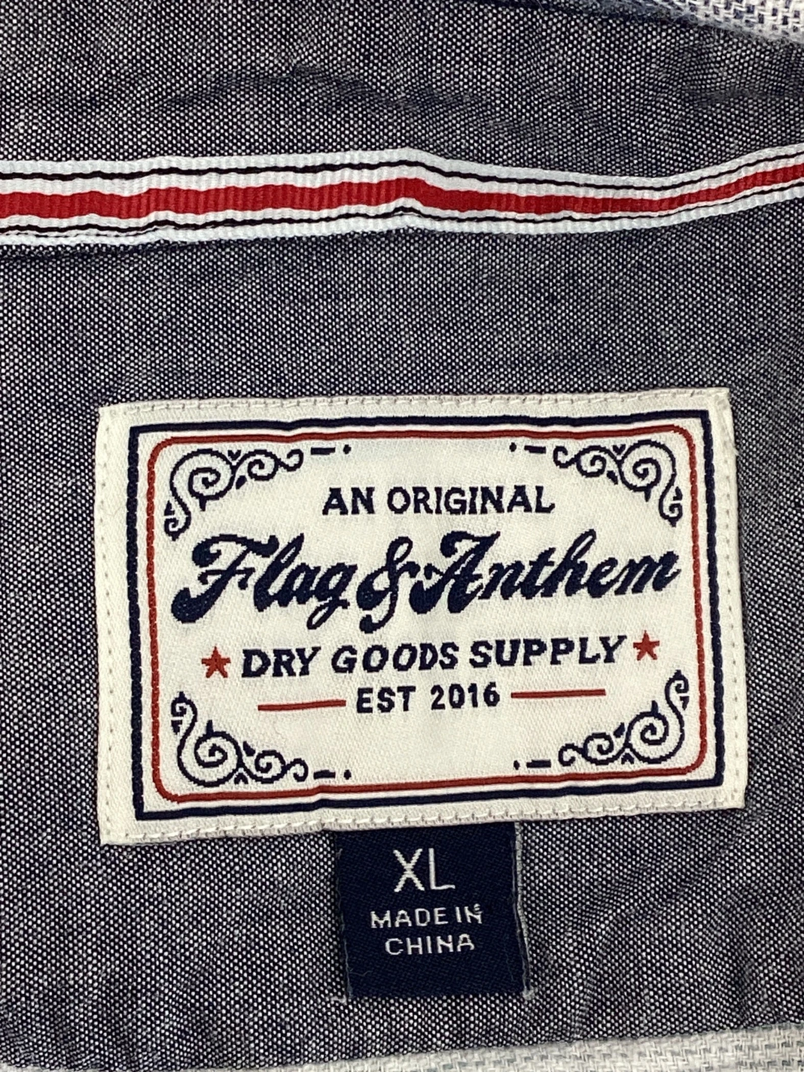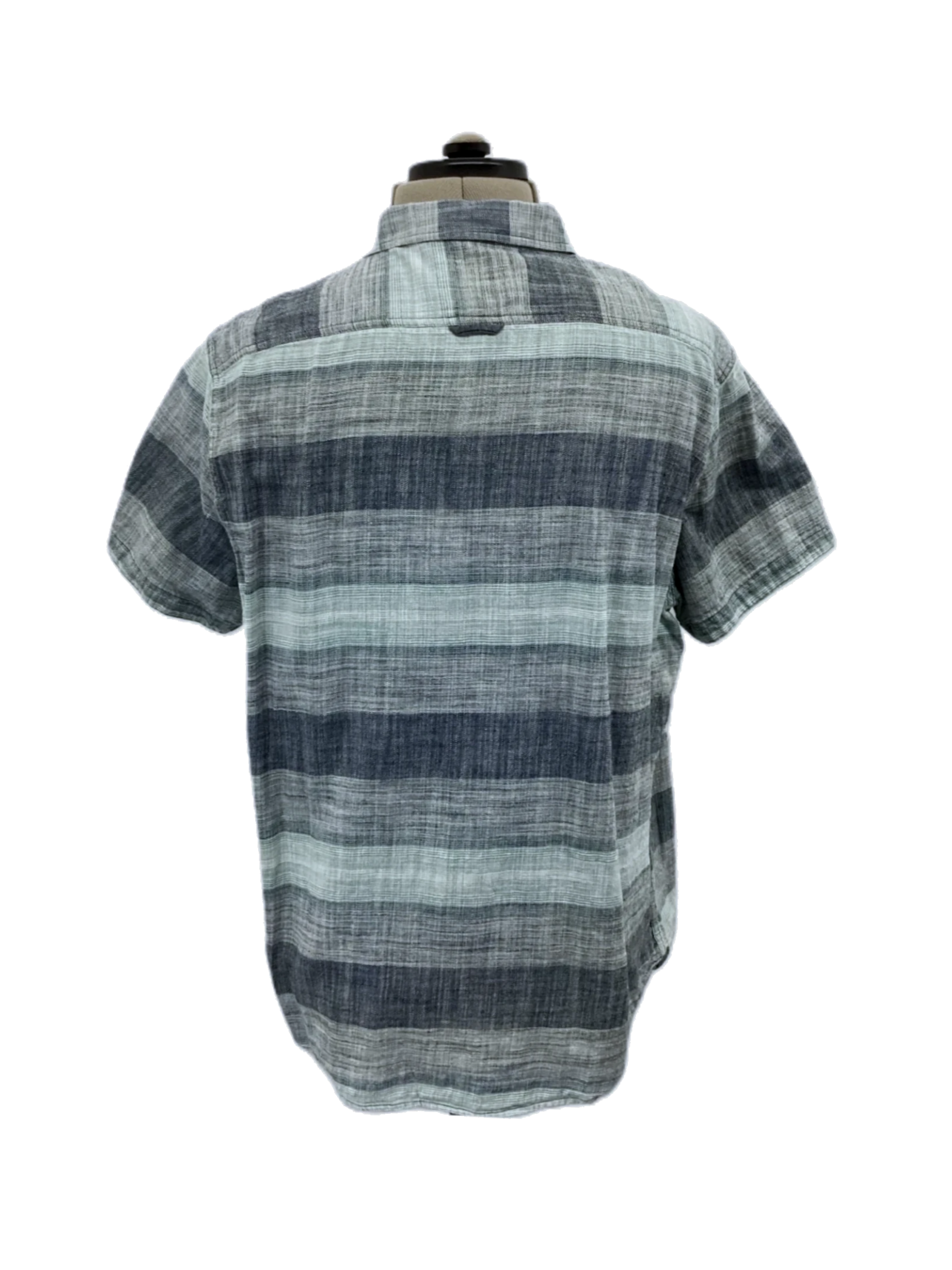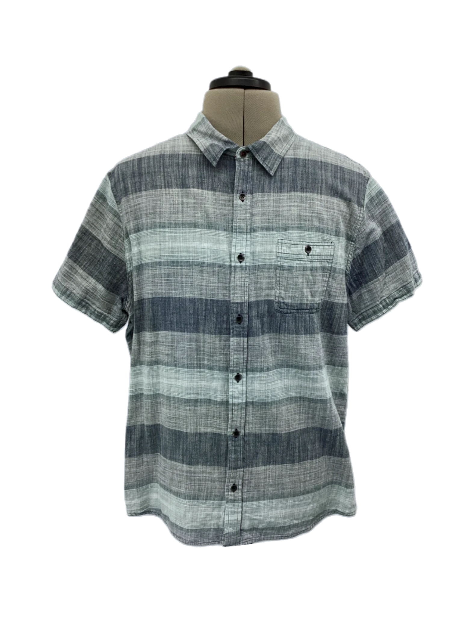 The shirt is a short-sleeved button-up collared shirt with gray and light blue stripes, in size XLarge for men.