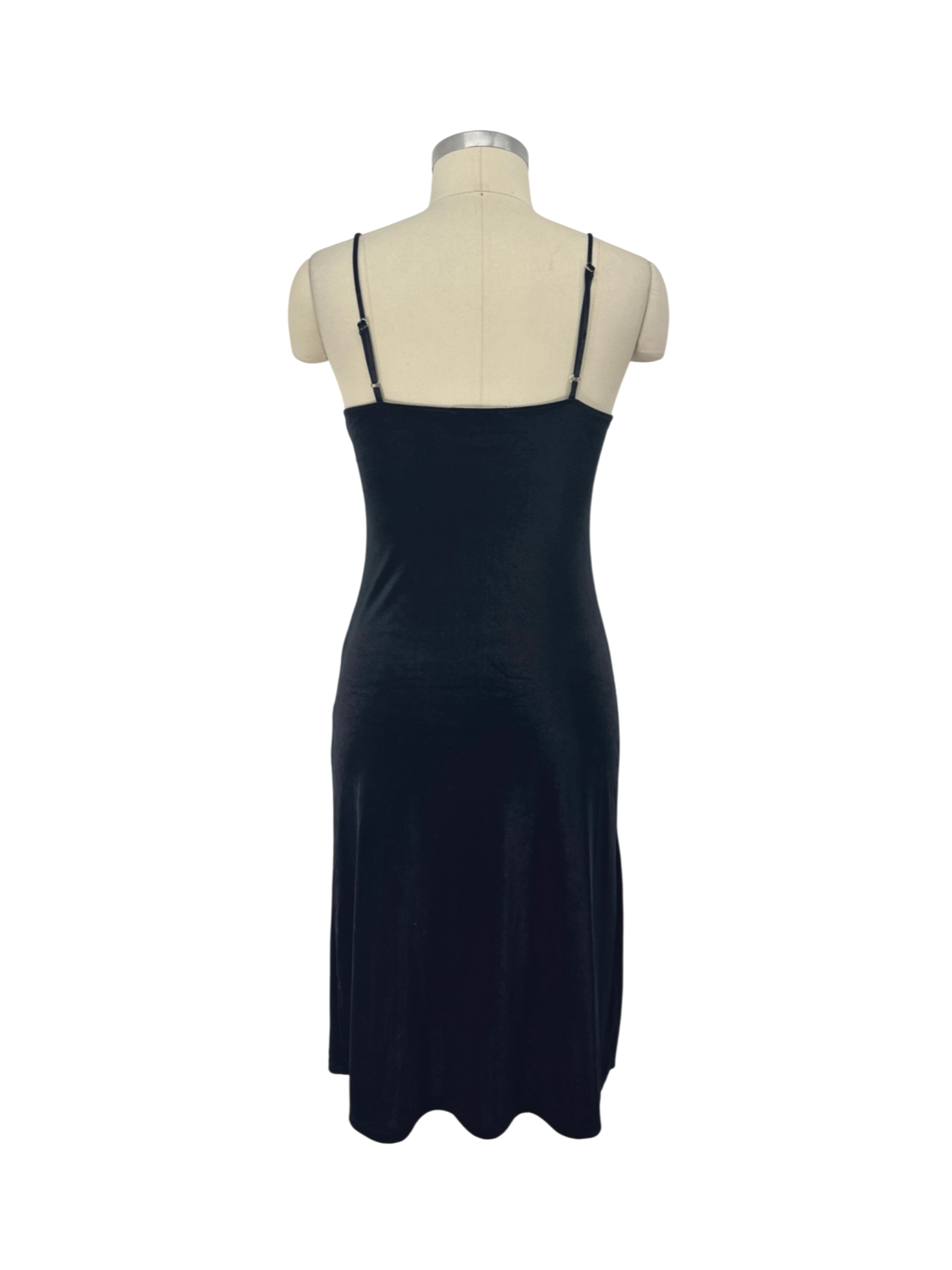 This sleek, pre-owned Forever 21 bodycon dress is the perfect addition to your party wardrobe. Crafted from soft, comfortable polyester, this midi dress features delicate spaghetti straps, a flattering V-neck, and a daring side slit. It's ideal for summer evenings and cocktail parties. This black dress offers a sophisticated and timeless style, making it a versatile piece for any occasion.