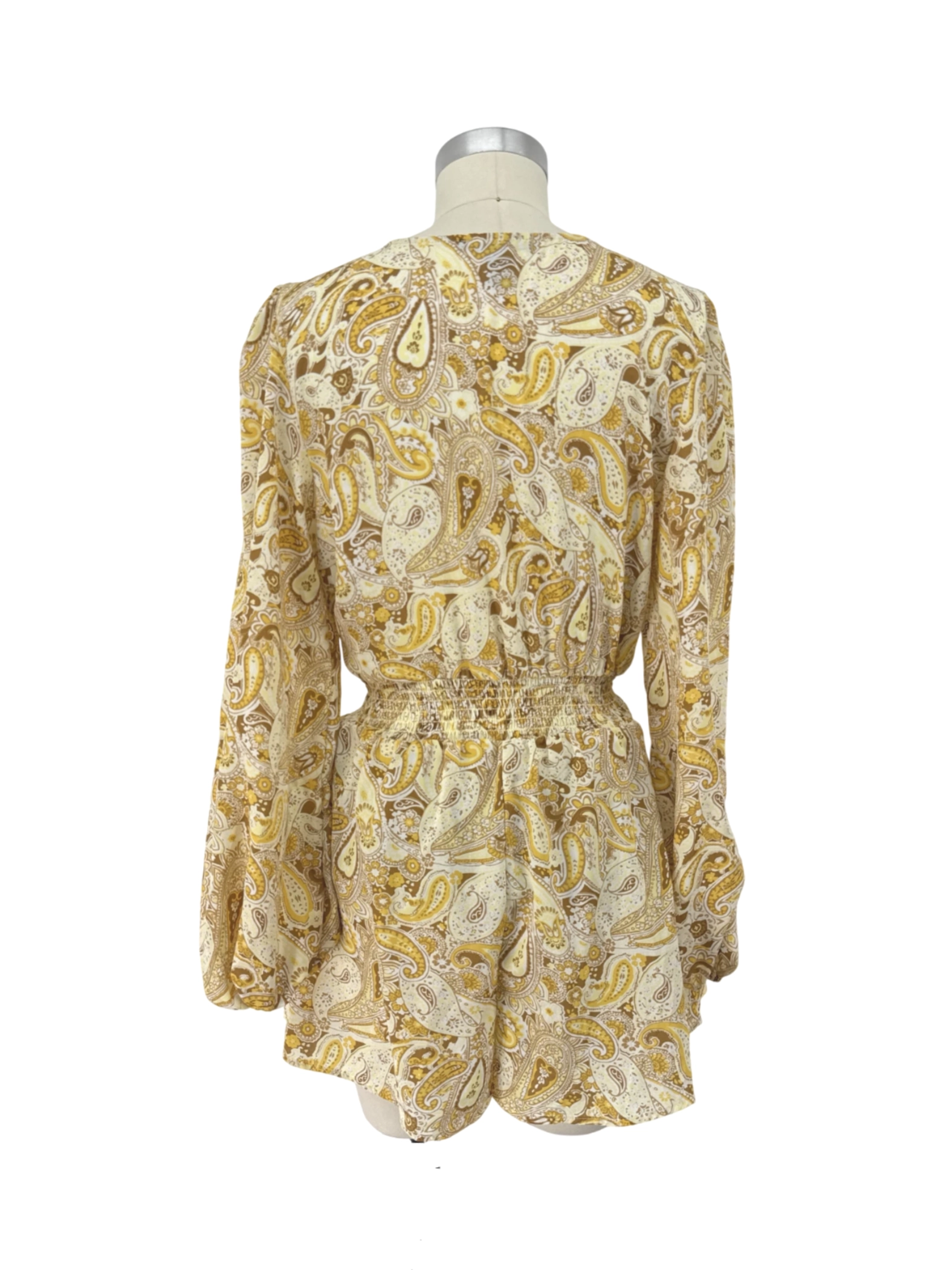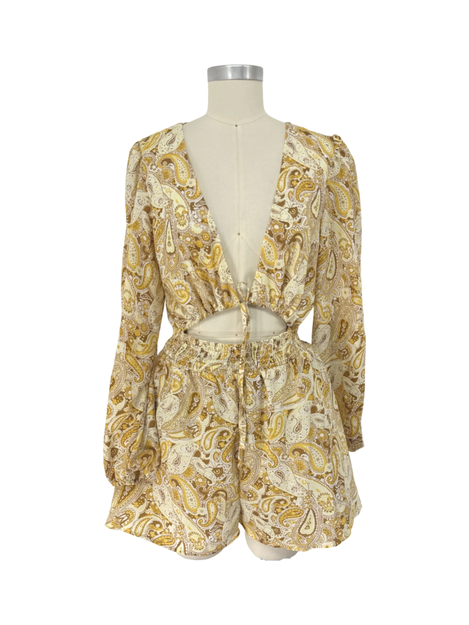 Embrace the bohemian vibes with this pre-owned Forever 21 jumpsuit. This stylish piece features a vibrant floral and paisley print in shades of brown and yellow, perfect for a summer day out or a casual evening event. Designed with a cutout detail, it offers a modern, fashionable touch. The jumpsuit is made from comfortable polyester fabric, and includes a V-neck and long sleeves, combining style and comfort effortlessly.