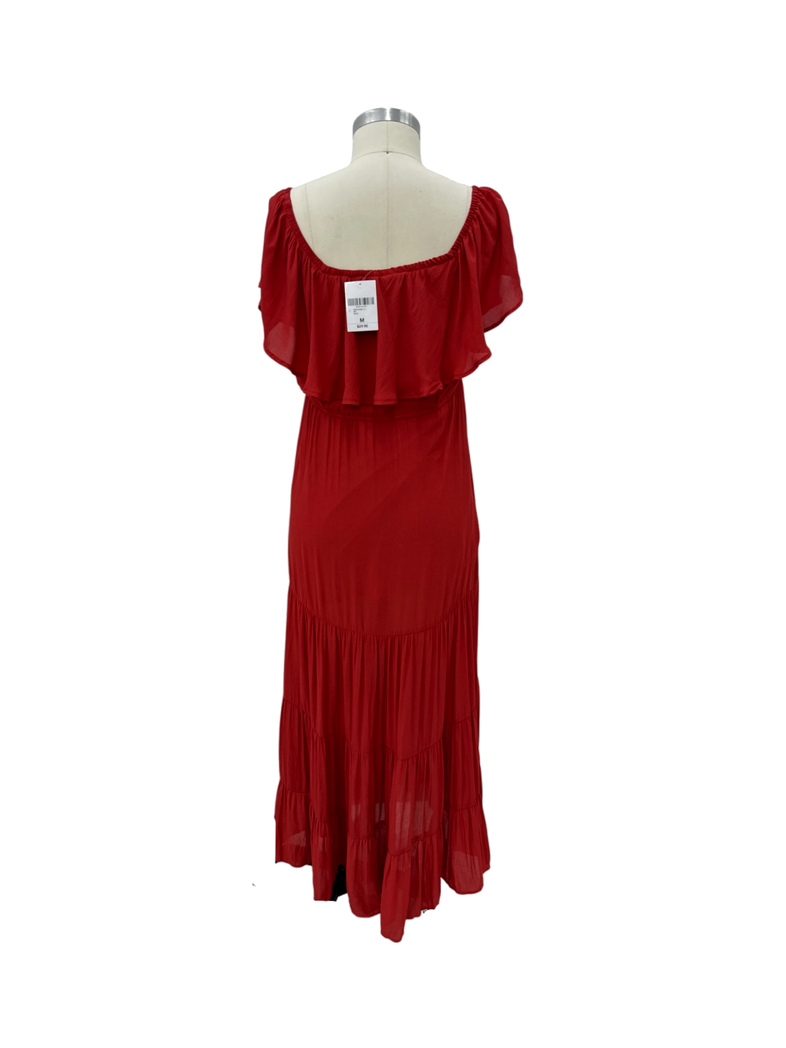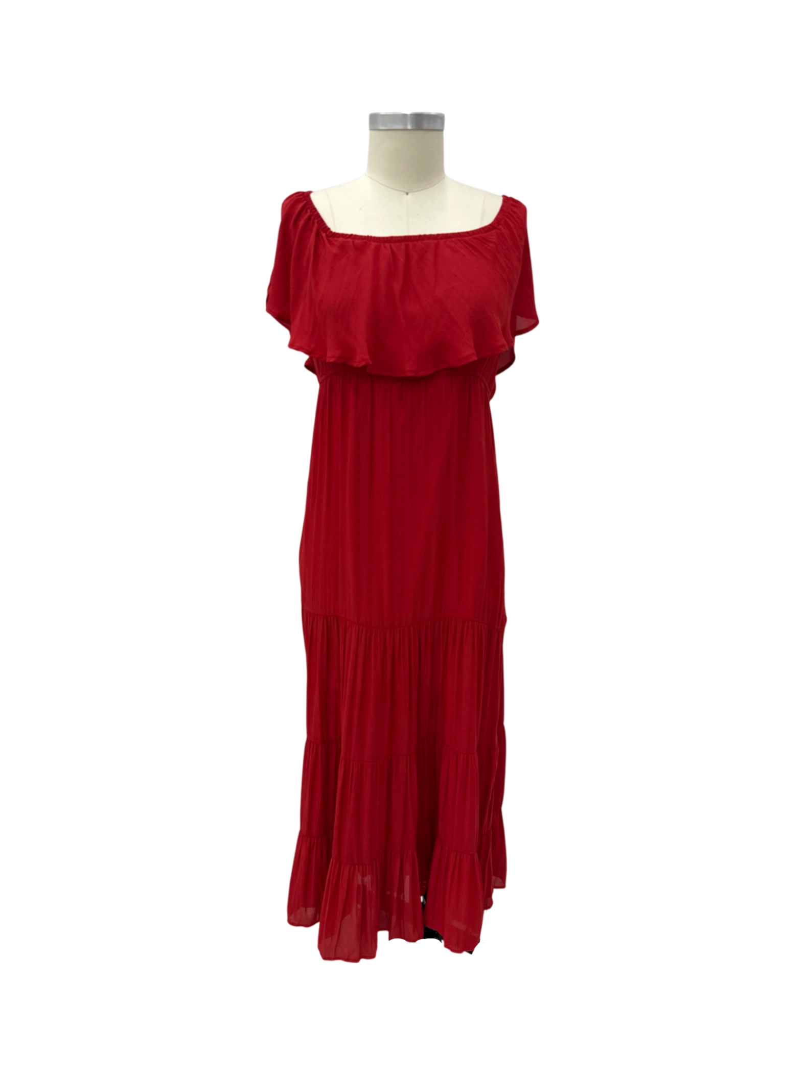 This gorgeous Forever 21 maxi dress is perfect for a summer day out. It features an off-the-shoulder neckline, short sleeves and is made of lightweight, flowy polyester. The vibrant red color makes a bold statement. The dress is in good condition, making it a stylish and affordable addition to any wardrobe. This dress is perfect for a summer day or evening.