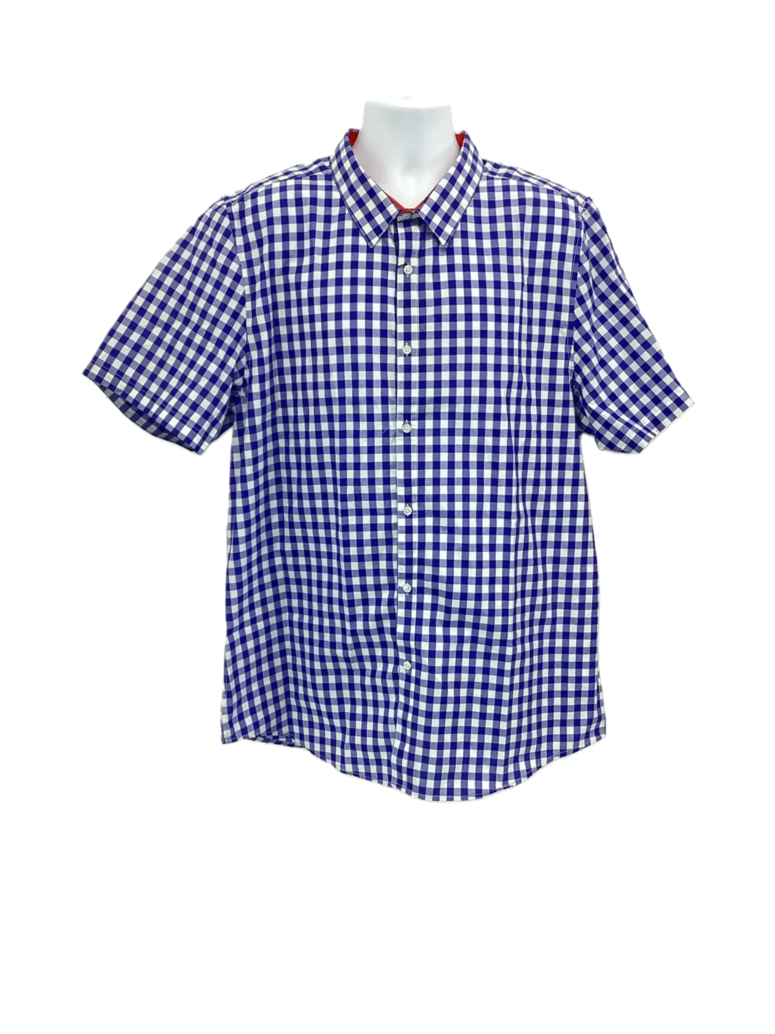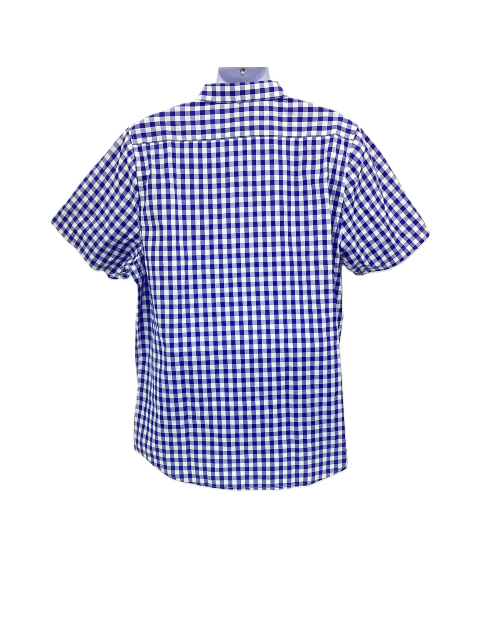 This GALAXY men's shirt is a stylish choice for any occasion. Featuring a classic checkered pattern in blue and white, this button-down shirt is made from a comfortable cotton-polyester blend. With short sleeves and a collared neckline, it is perfect for warm weather. This second-hand shirt is in good condition and offers a great fit. Ideal for a casual outing or a smart-casual look. Available in size 2XL.