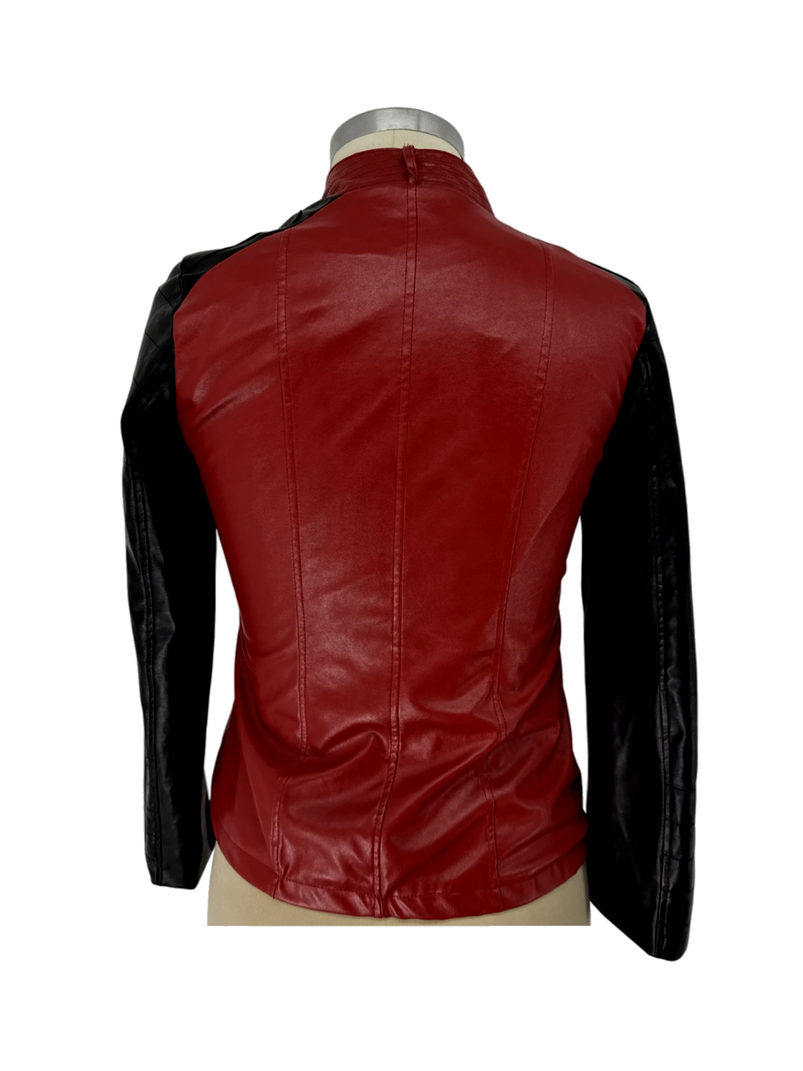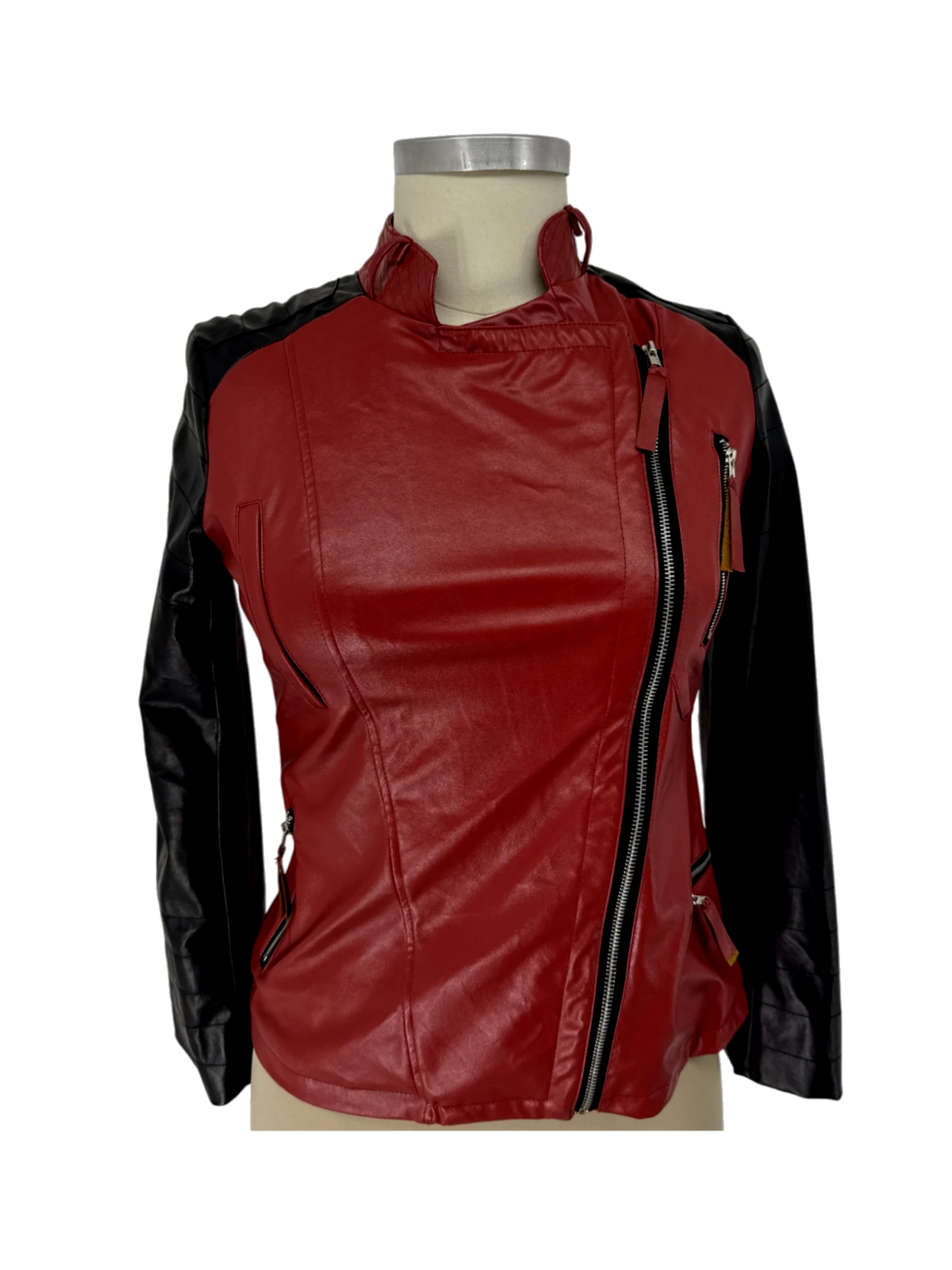 Elevate your outerwear game with this stylish pre-owned Gamiss motorcycle jacket. Featuring a striking red and black color-block design crafted from faux leather, this jacket exudes a bold and edgy aesthetic. Perfect for adding a touch of rebel chic to any outfit, this jacket is both versatile and eye-catching, ideal for transitioning seasons.