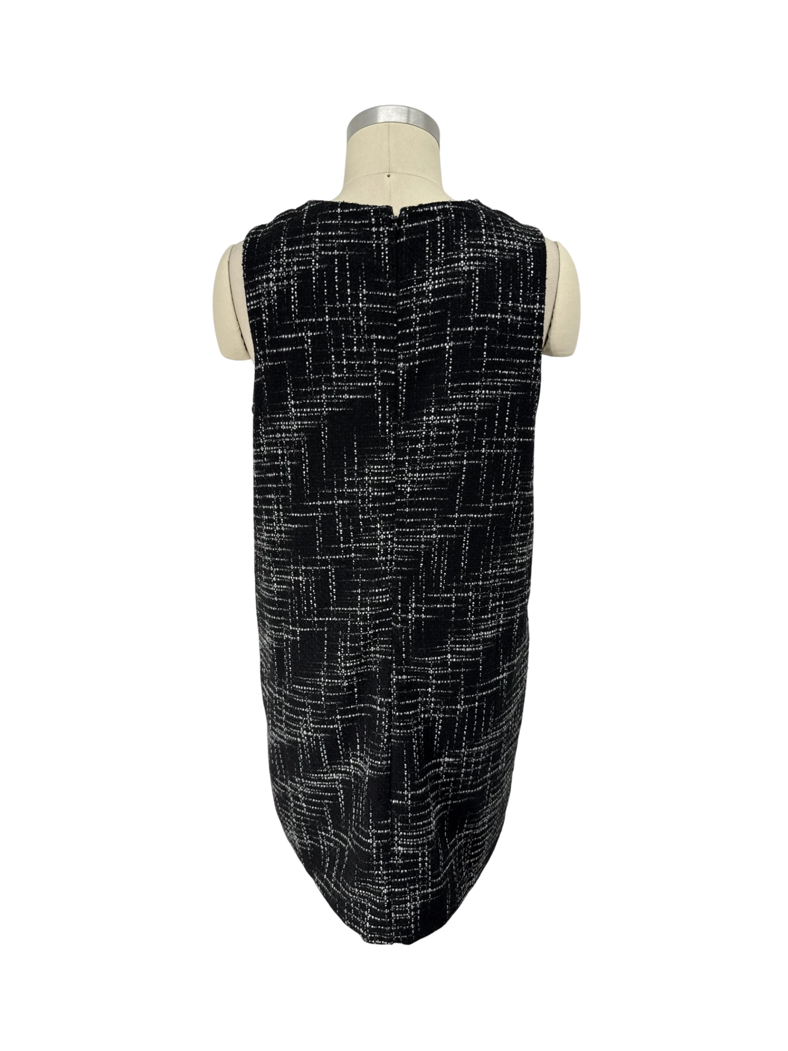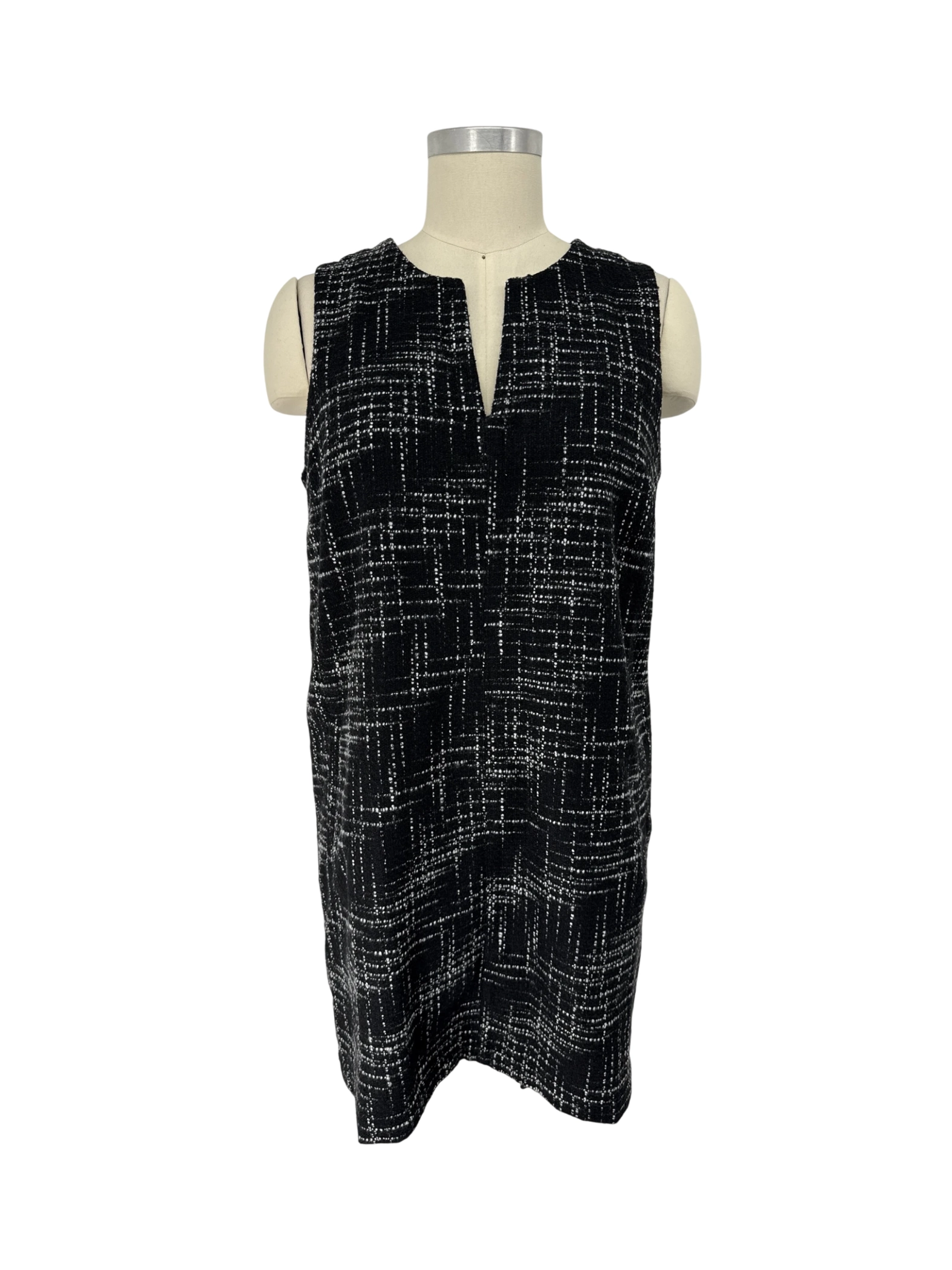 Elevate your wardrobe with this chic, pre-owned GAP shift dress. This dress features a sophisticated black and white geometric pattern. Crafted from a blend of high-quality materials, it offers both comfort and style. The sleeveless design and V-neckline make it perfect for layering or wearing alone. Ideal for casual outings, this dress is a versatile addition to any fashion-forward closet.
