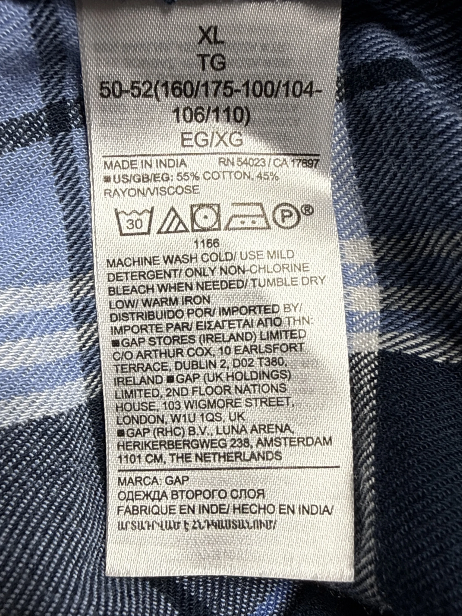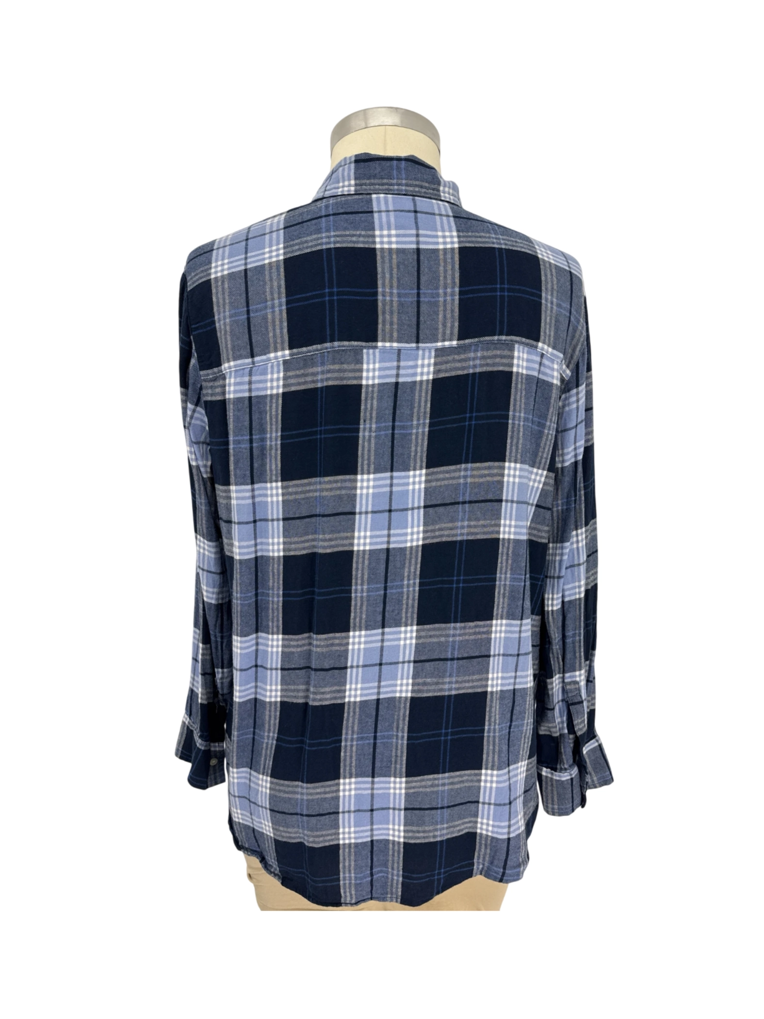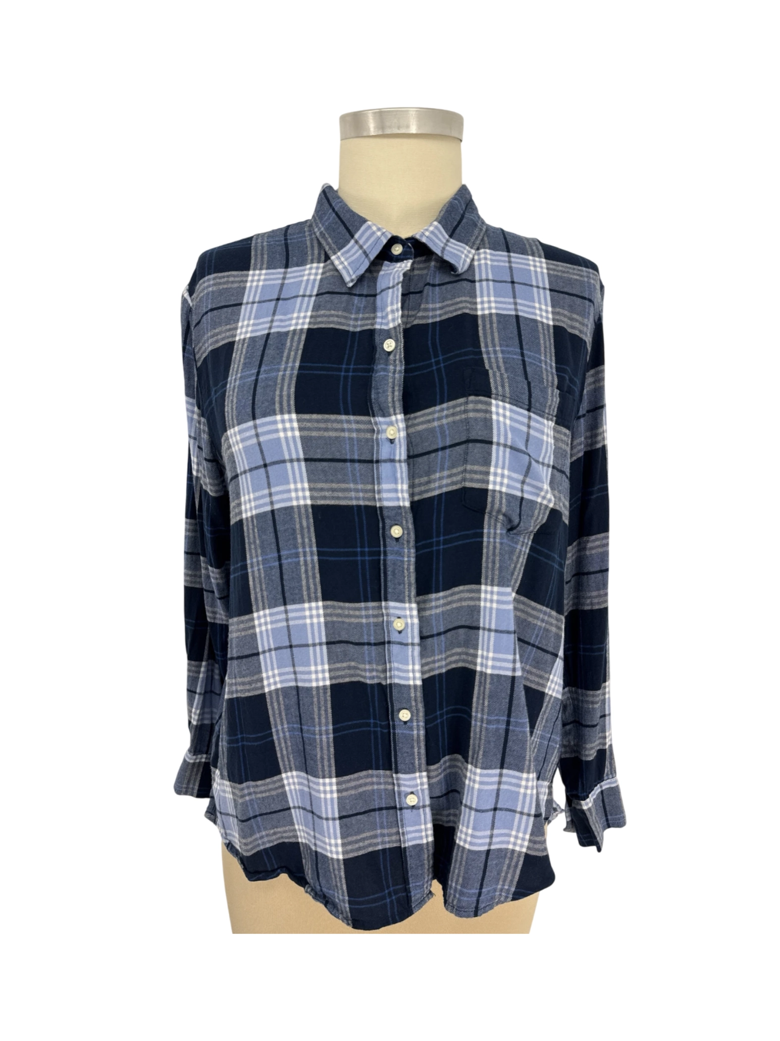 This pre-owned GAP Easy Shirt for women is a stylish addition to any wardrobe. Featuring a classic plaid pattern in navy blue with long sleeves and a collared neckline. This comfortable button-up blouse is perfect for fall and winter. Made from a blend of rayon and viscose, the shirt has a relaxed fit making it great for layering. Available in size XL, this versatile top is ideal for casual wear.
