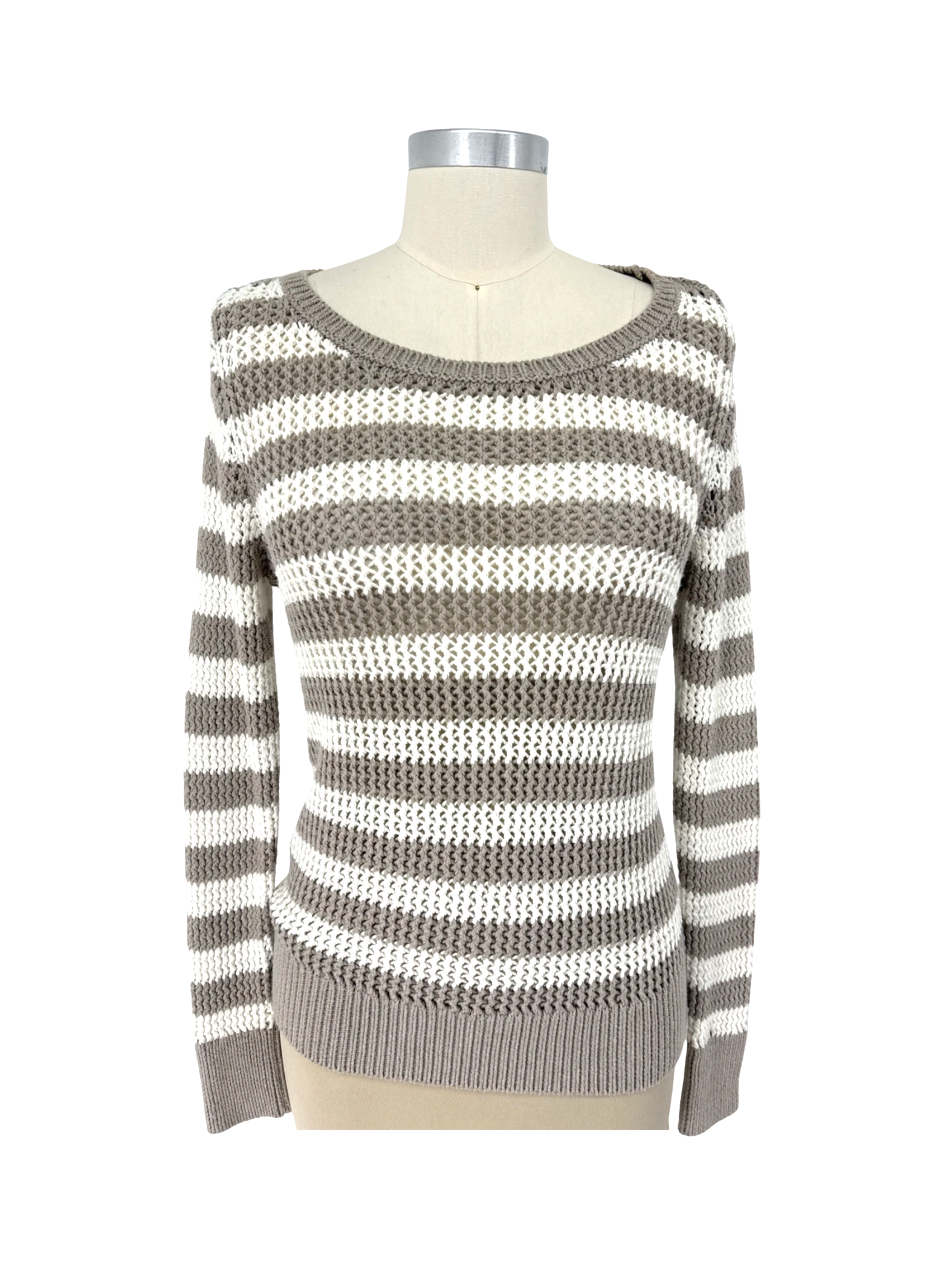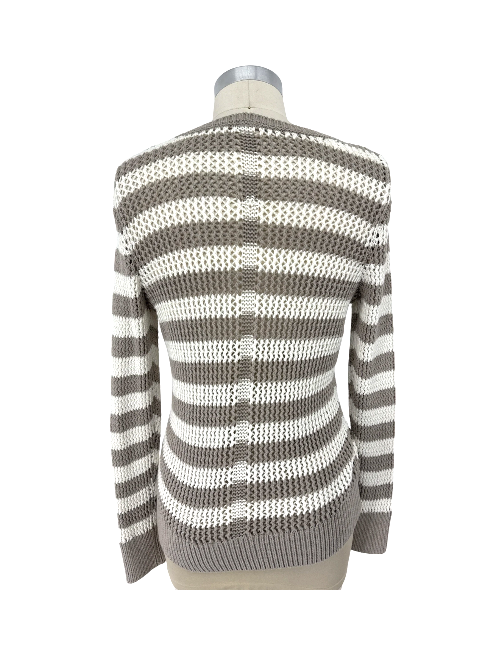 This pre-owned GAP sweater is a stylish addition to any wardrobe. Featuring a classic striped pattern in gray and white, this sweater is perfect for adding a touch of casual elegance to your look. It has a comfortable fit and a round neck, making it easy to pair with various outfits. Crafted from soft cotton, it's ideal for cooler seasons. This versatile pullover is a great find for anyone seeking quality and timeless style.