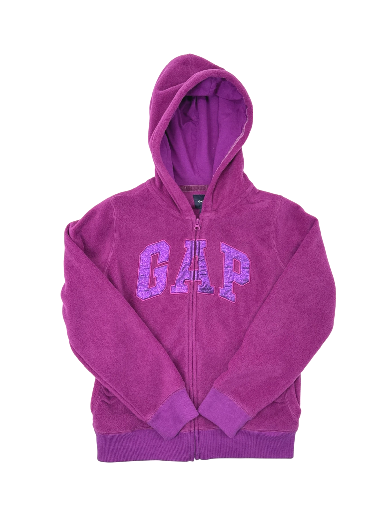 Cozy up your girl in this pre-owned GapKids hoodie. This soft, pink fleece sweatshirt features a full zipper, attached hood, and the iconic Gap logo. Crafted from a comfortable polyester blend with a cotton lining, it's perfect for layering during the fall and winter. The classic design and vibrant color make it a versatile addition to any wardrobe, ideal for casual wear, playdates, or school. Preloved condition ensures both affordability and sustainability.
