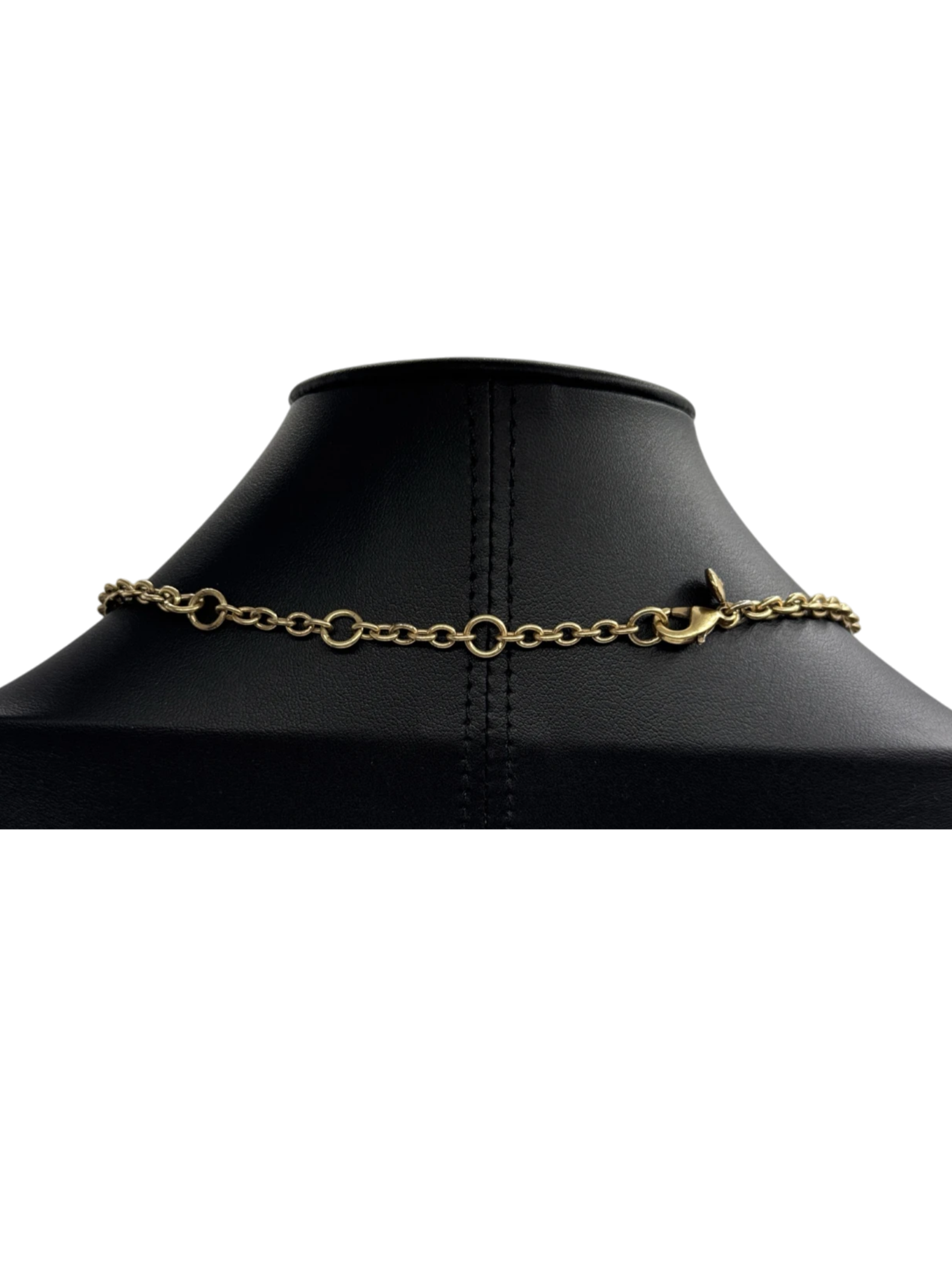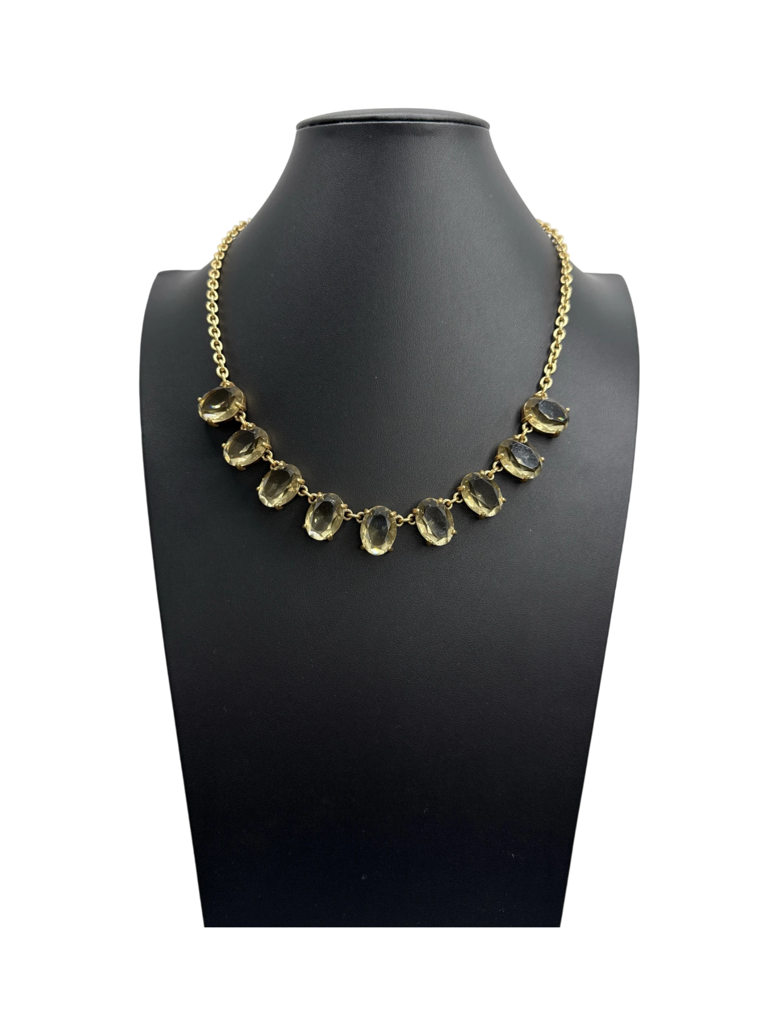 This necklace has a row of olive green, oval-cut gemstones placed on a fine gold chain. The gemstones are positioned closely together at the front to form a central focus, and they are linked by small gold connectors.