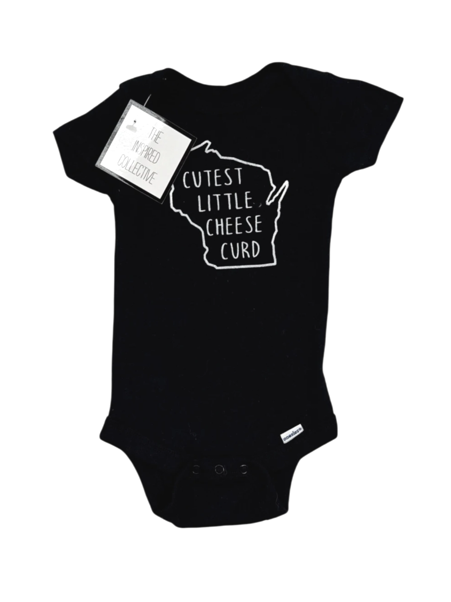 This adorable Gerber onesie is perfect for your little one! Featuring a cute design with the text 'Cutest Little Cheese Curd', this onesie is made from soft, breathable cotton. Perfect for everyday wear or as a unique baby gift. This stylish bodysuit is pre-owned and in good condition, ready for a new adventure.