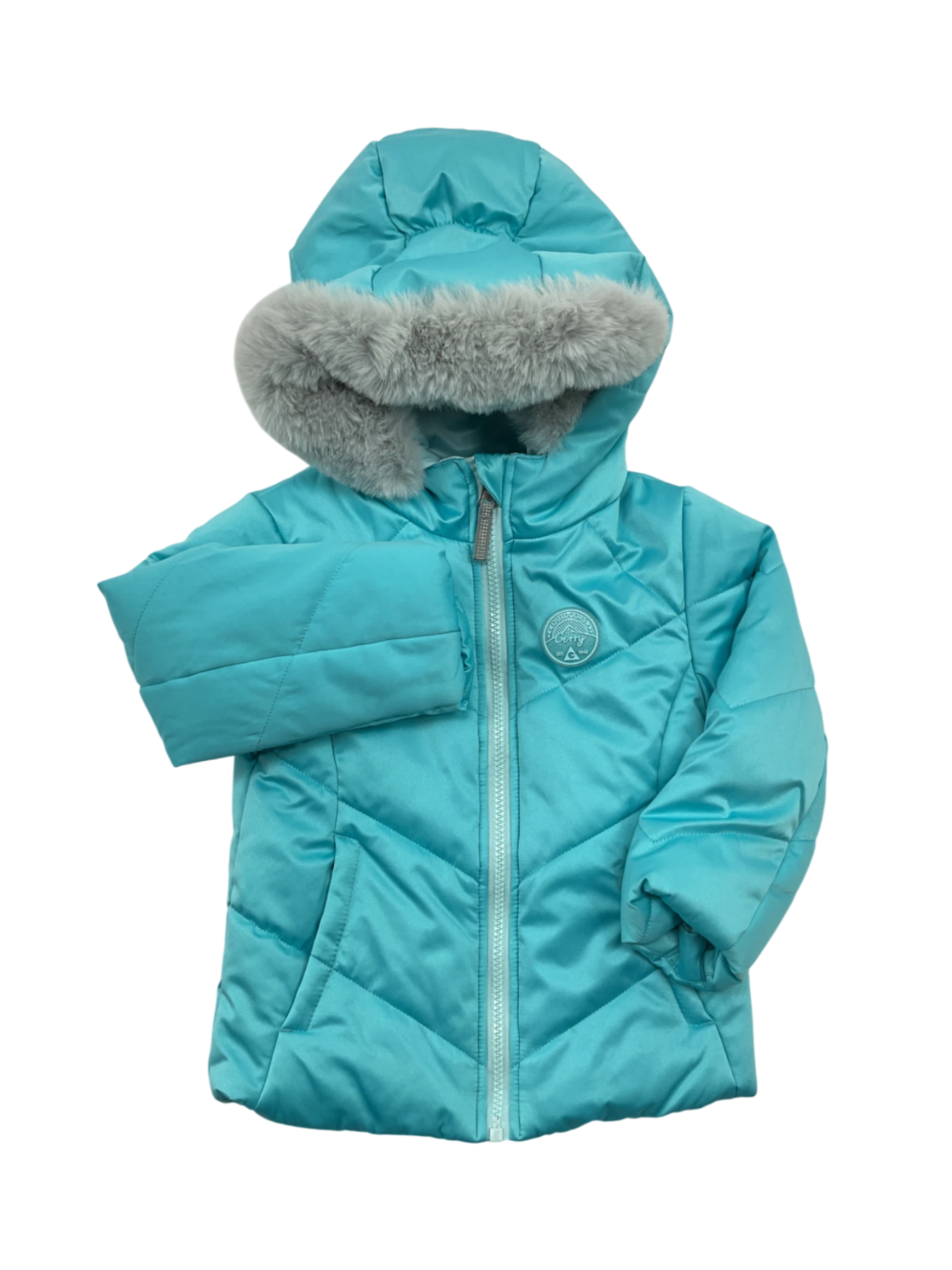 Gerry toddler turquoise puffer jacket with a faux fur lined hood, in a size 3T.