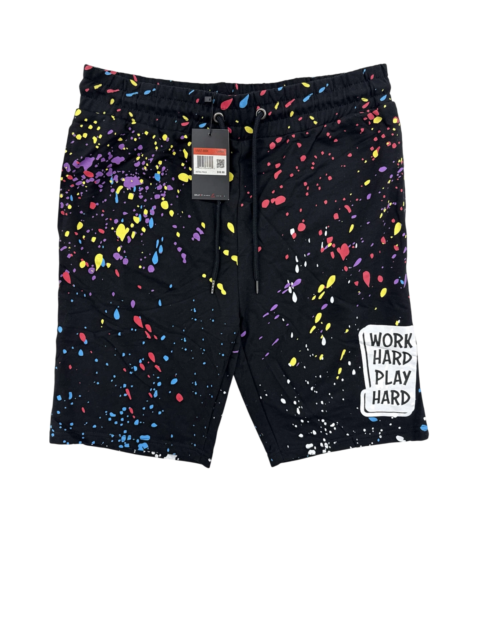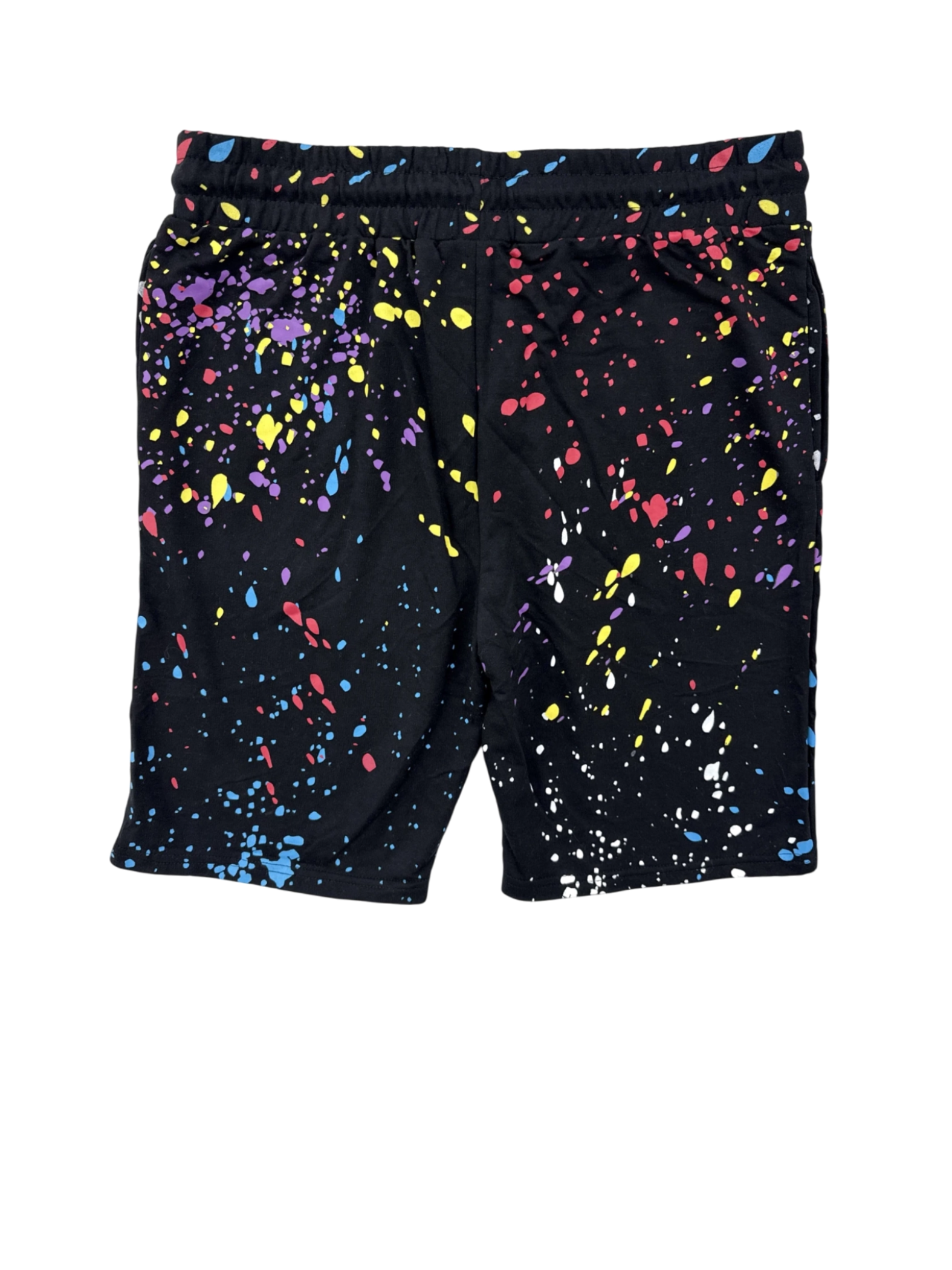 These GHLXY by Harvic sweat shorts are a stylish addition to any wardrobe. Featuring a unique paint splatter design on a black background, they offer a bold look. The shorts are crafted from a comfortable cotton blend. Perfect for casual outings or lounging, these shorts are both fashionable and practical, offering a great fit and style. - These pre-owned GHLXY by Harvic sweat shorts are a vibrant and stylish addition to any wardrobe. Featuring a black base with a colorful splatter paint design, these shorts offer a unique look. Crafted from a comfortable cotton and polyester blend, they are perfect for casual wear. The shorts include an elastic waistband with a drawstring. Easy to care for, these shorts are ideal for warm weather. A great find for anyone looking to add some flair to their outfit.