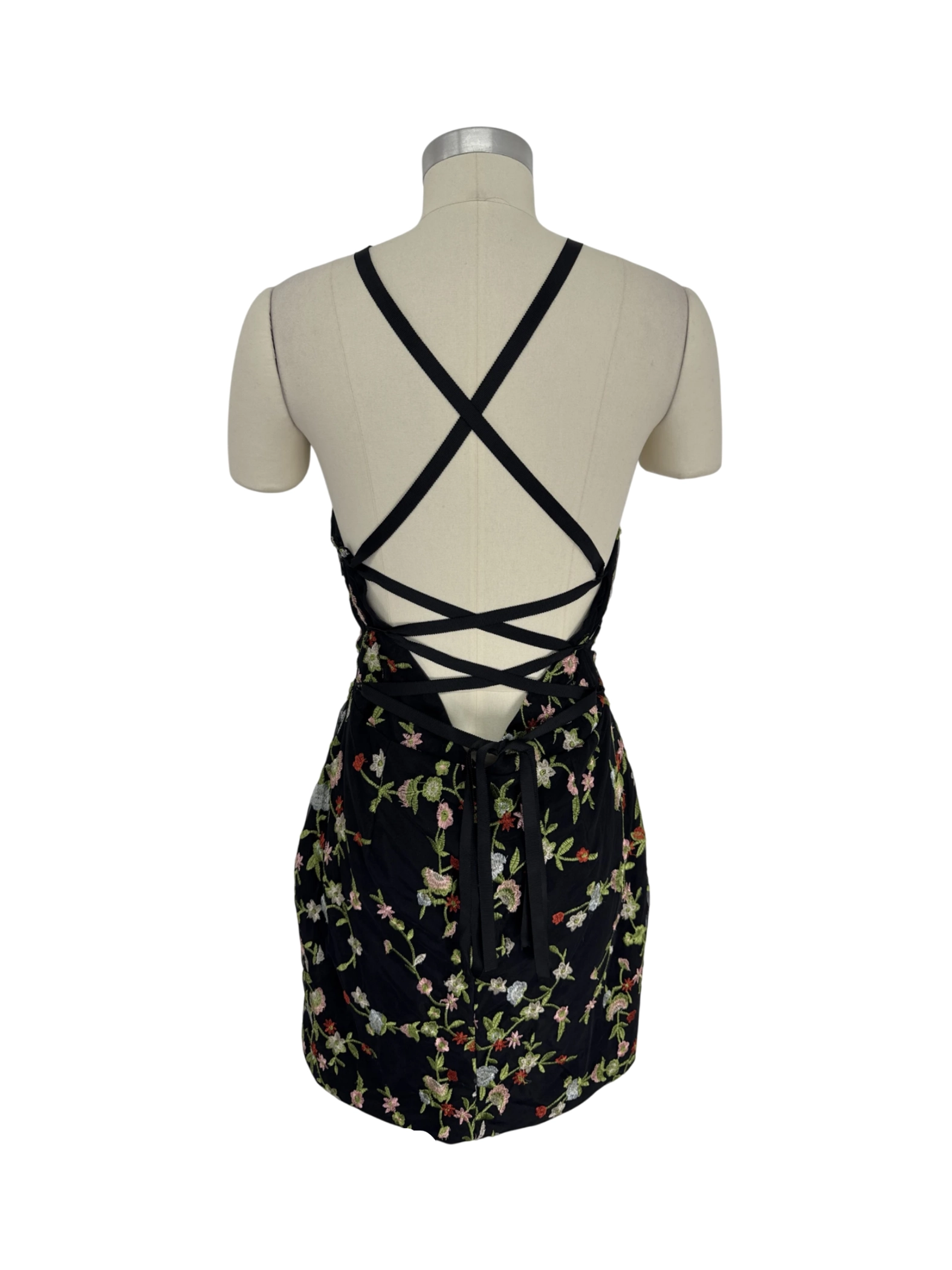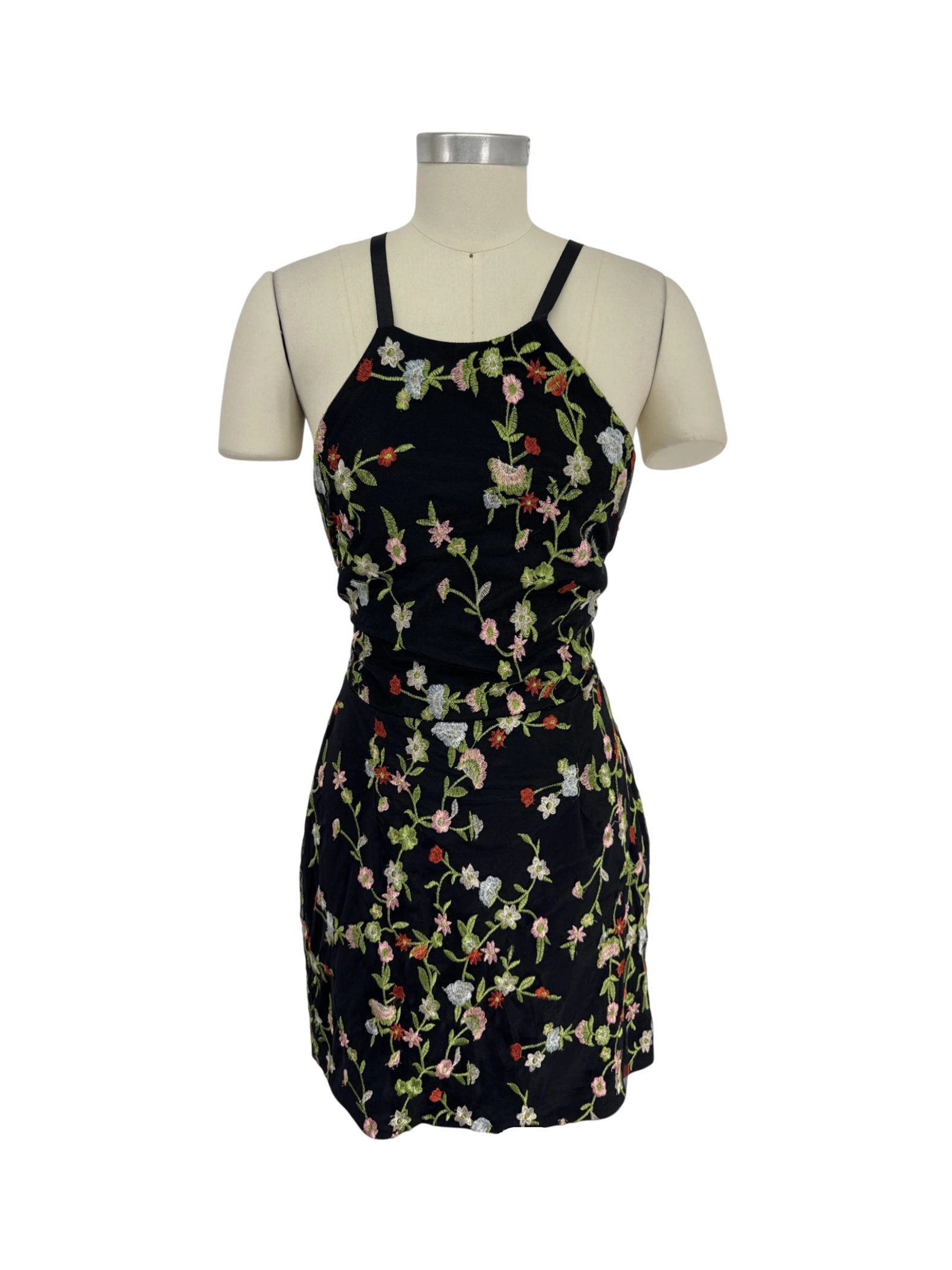This stunning pre-owned GIANNI BINI dress is perfect for any warm weather occasion! Featuring a flattering A-line silhouette and a halter neckline, this dress is designed to turn heads. The black fabric is adorned with beautiful floral embroidery, adding a touch of elegance. Made with a blend of polyester and elastane, it offers both comfort and style. Ideal for a cocktail party or a casual day out, it's a versatile addition to your wardrobe.