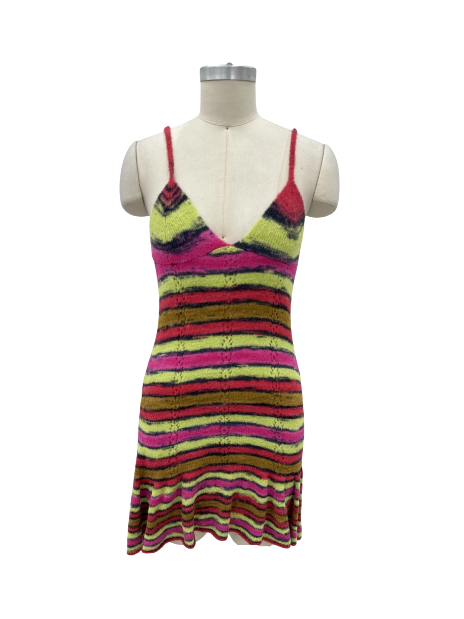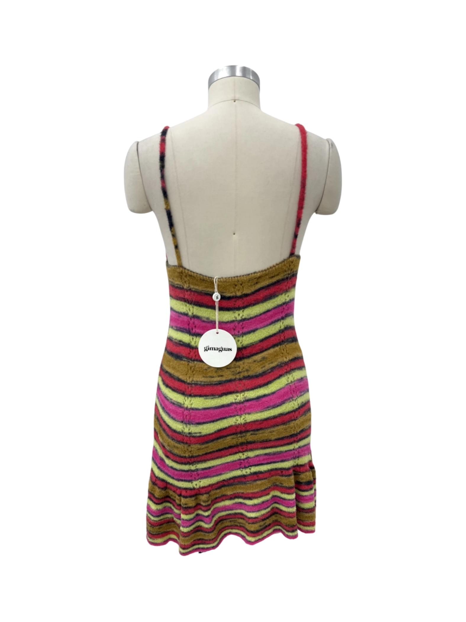 This vibrant, pre-owned gimaguas dress is a perfect summer statement piece. Featuring a playful A-line silhouette, it boasts a colorful striped pattern and delicate spaghetti straps. The mini skirt length adds a touch of flirtatiousness, while the soft polyamide fabric ensures a comfortable fit. Ideal for casual outings, this unique find offers a blend of style and sustainability, making it a must-have for the fashion-conscious shopper.