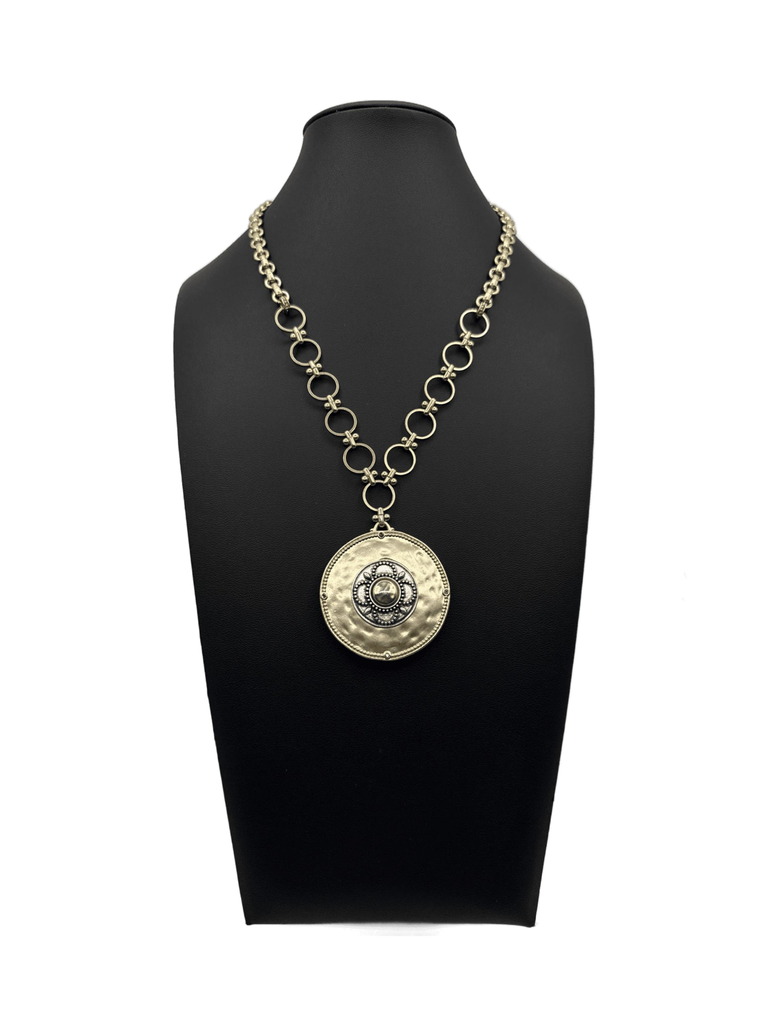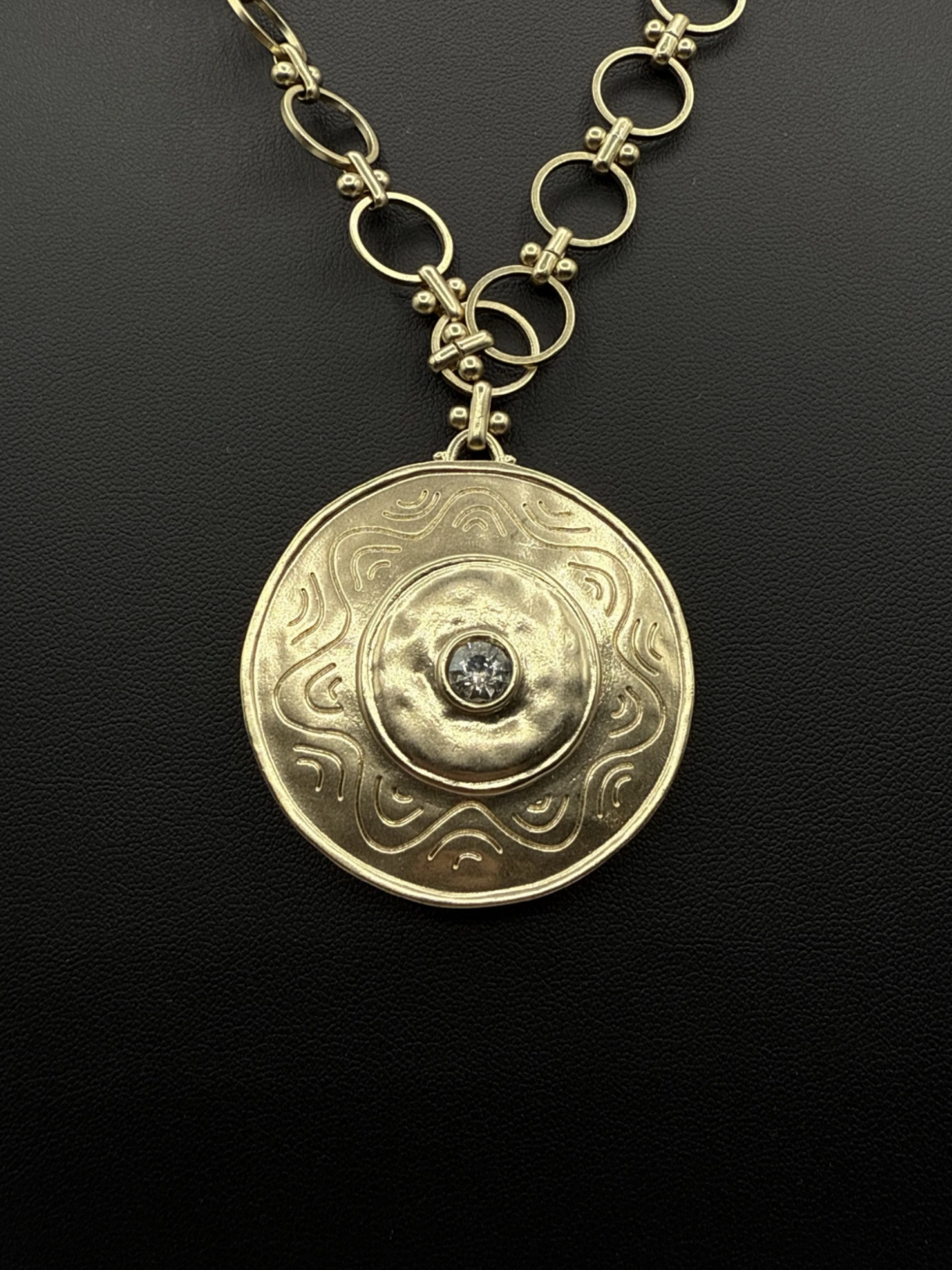 Gold tone pendant with reversible floral design on a chain, measuring 15.5" x 4".